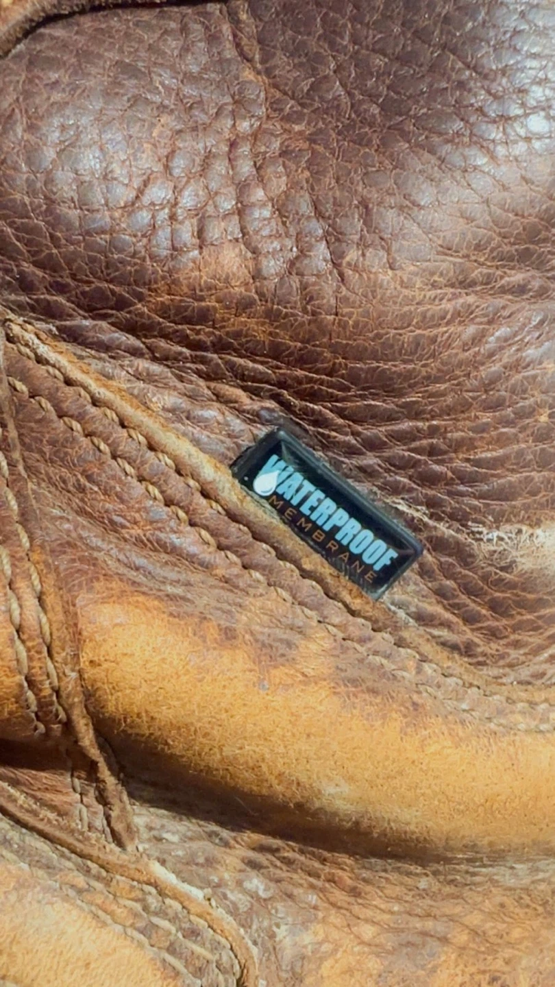 Selling a pair of Timberland work boots. They are brown leather and waterproof. They show signs of use but they are still in good condition.