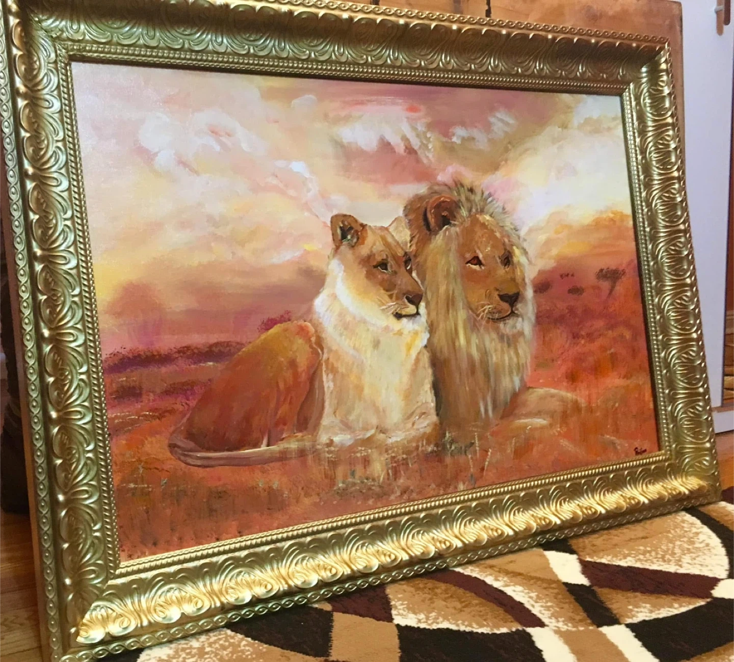 Beautiful oil painting of a lion and lioness in a decorative gold frame. The painting depicts the animals in a warm, sunset-like setting. Perfect for adding a touch of wildlife art to your home. Oils and acrylic done by me. Frame is custom made as well. 24x36