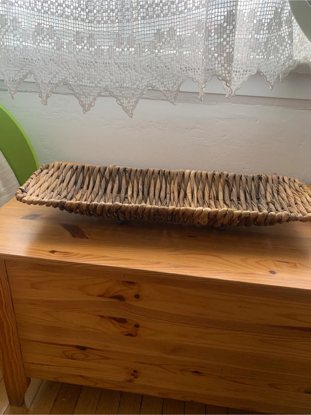 Long, rectangular woven centrepiece or table runner. It's made from natural fibres and has a rustic look. This piece can be used to add a decorative touch to dining tables or as a display base.