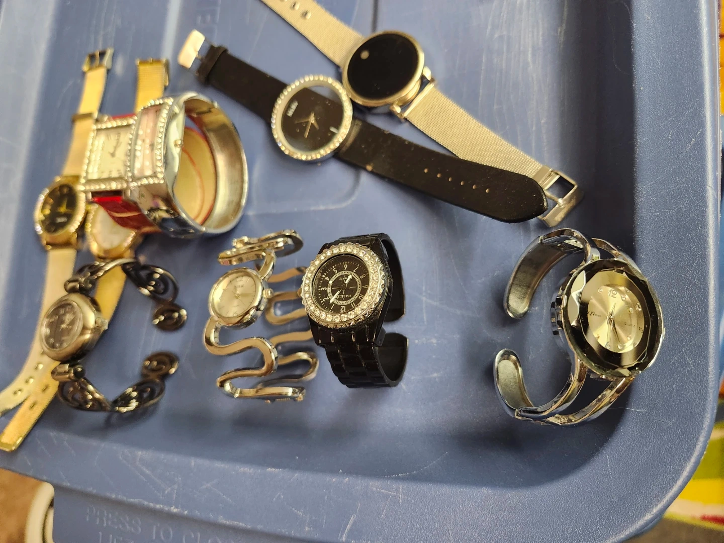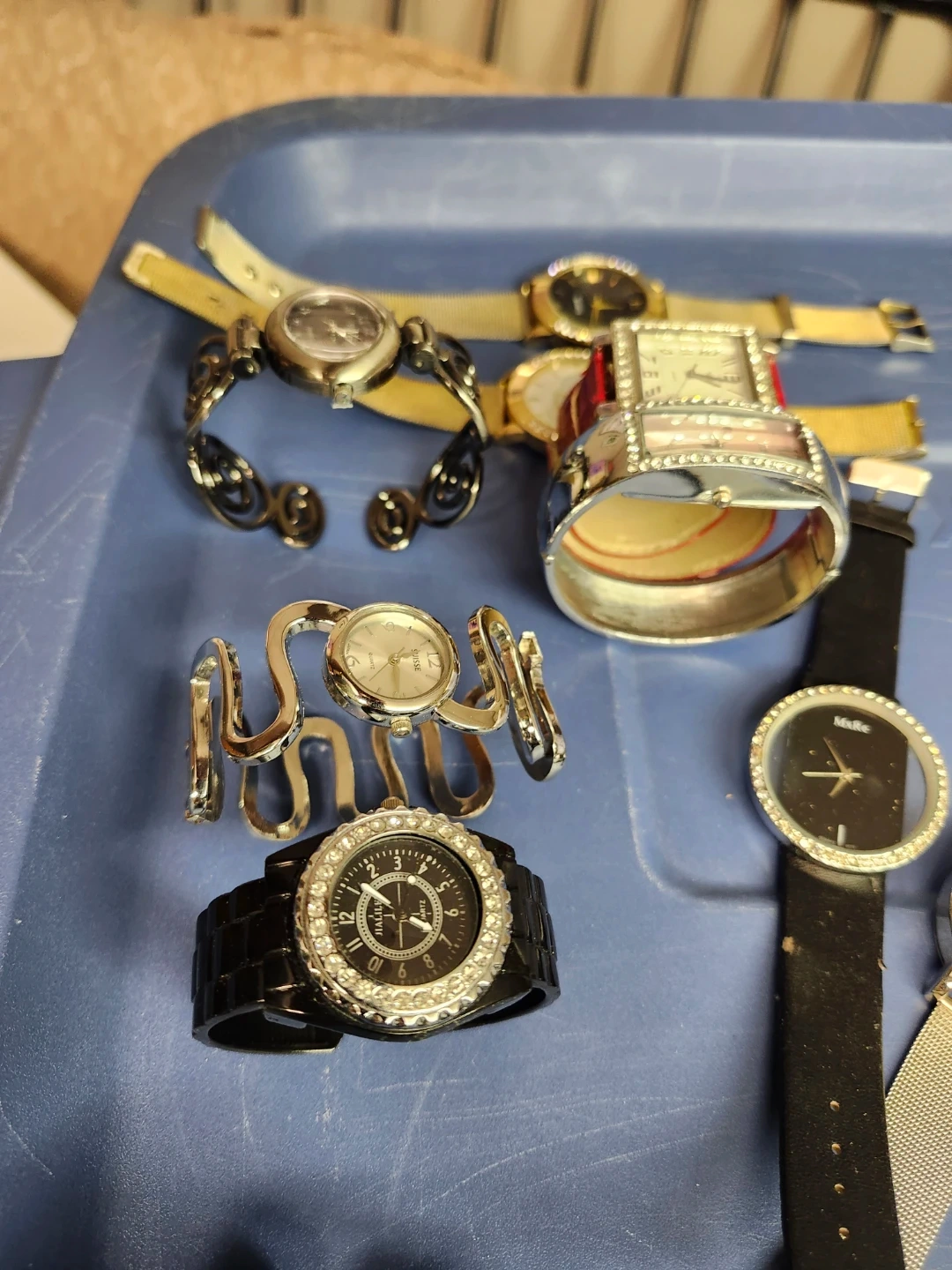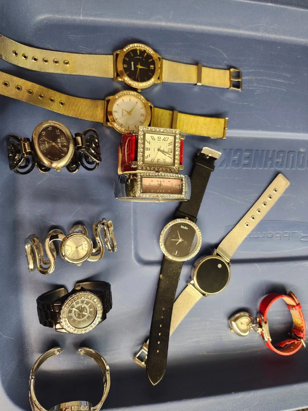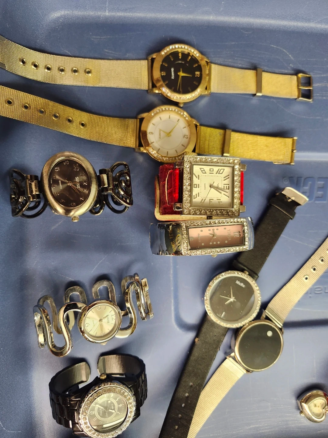 Collection of 11 assorted women's fashion watches. Includes various styles with metal bands, some with rhinestone accents. Watches have round and square faces, some with colourful accents.