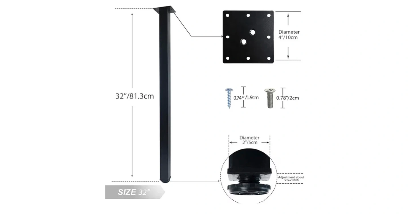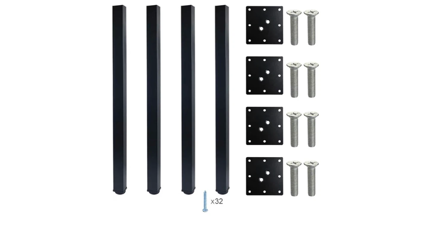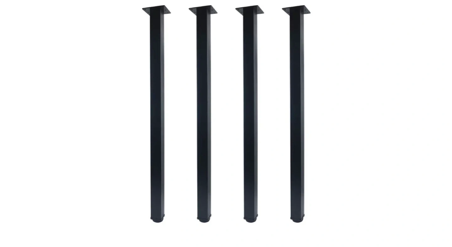 Four black metal table legs, each 32 inches tall. These legs are square and come with adjustable foot pads for stability. Screws and mounting plates are included for easy installation.