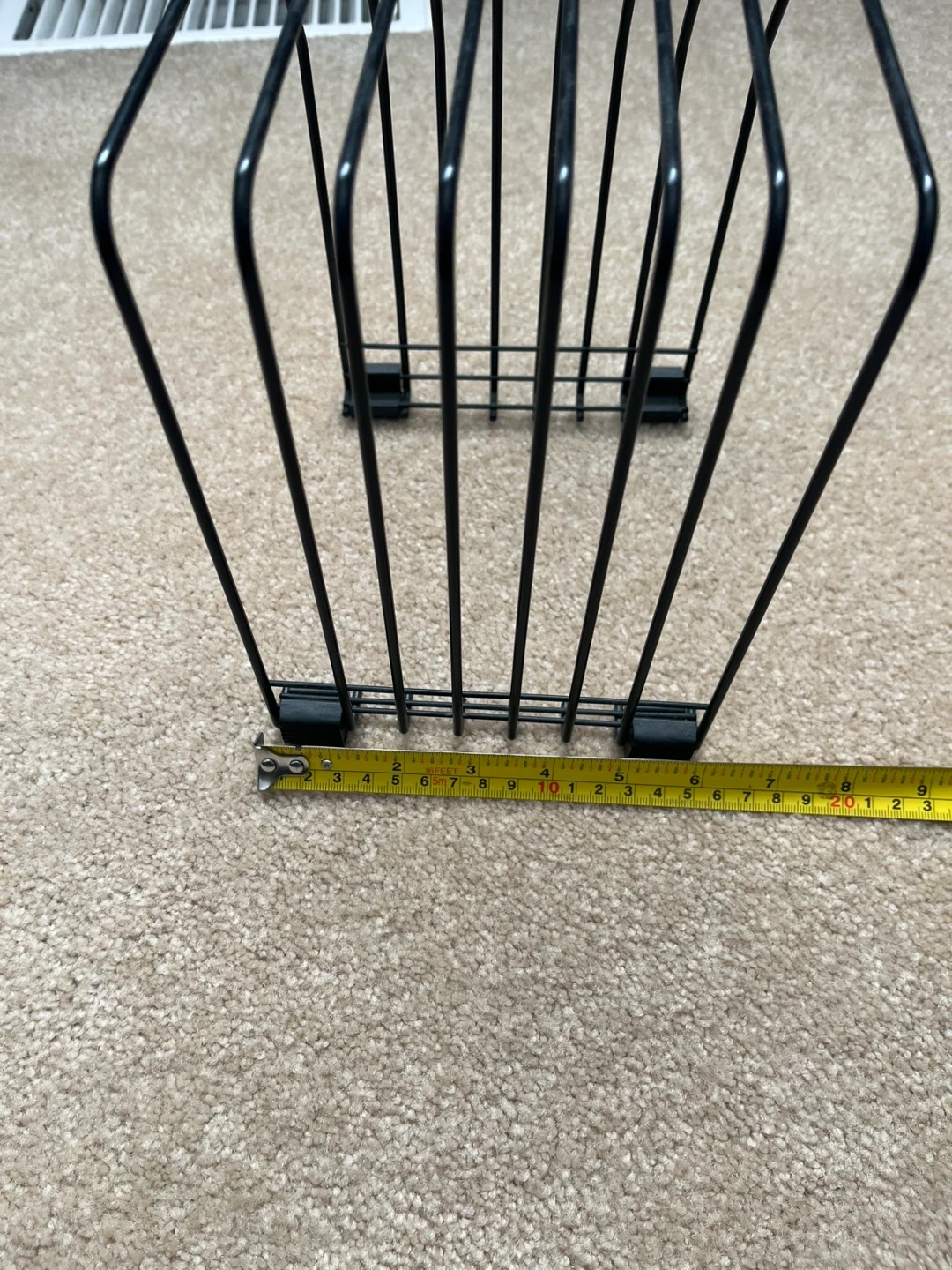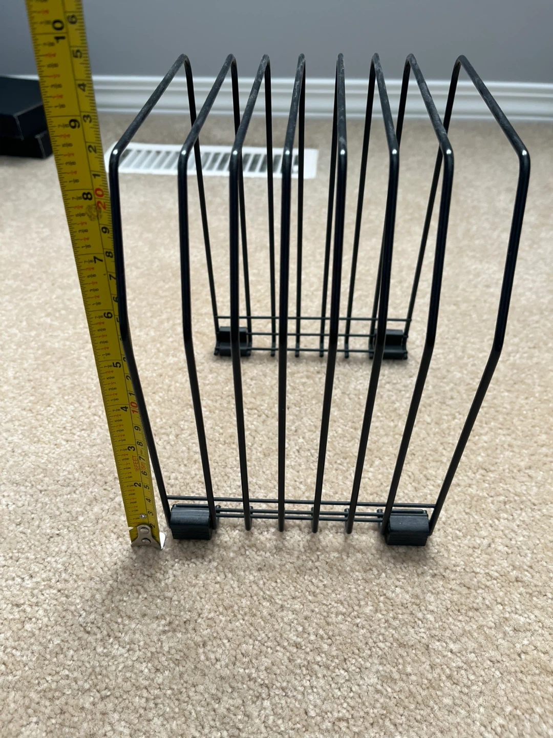 This is a black metal magazine file holder. It has six slots for organizing papers or magazines. Measures approximately 13 inches long and 7 inches tall.