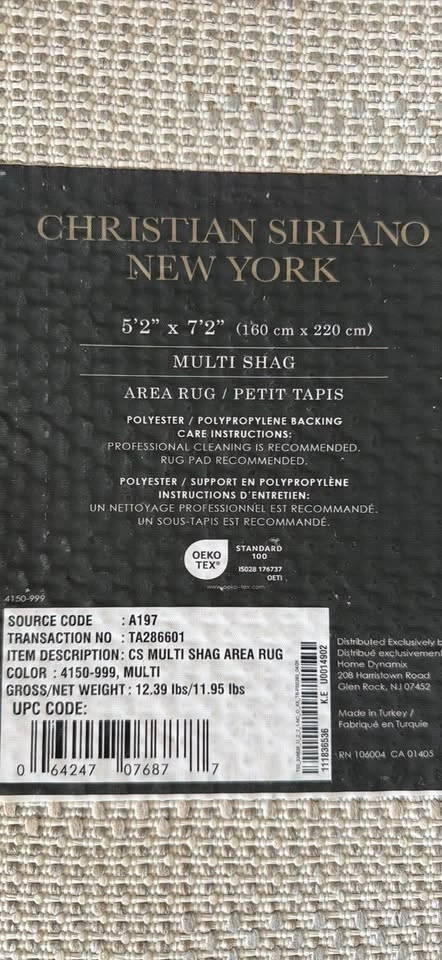 This Christian Siriano New York multi shag area rug measures 5'2" x 7'2". It's made with a polyester and polypropylene backing. Pet free smoke free home!