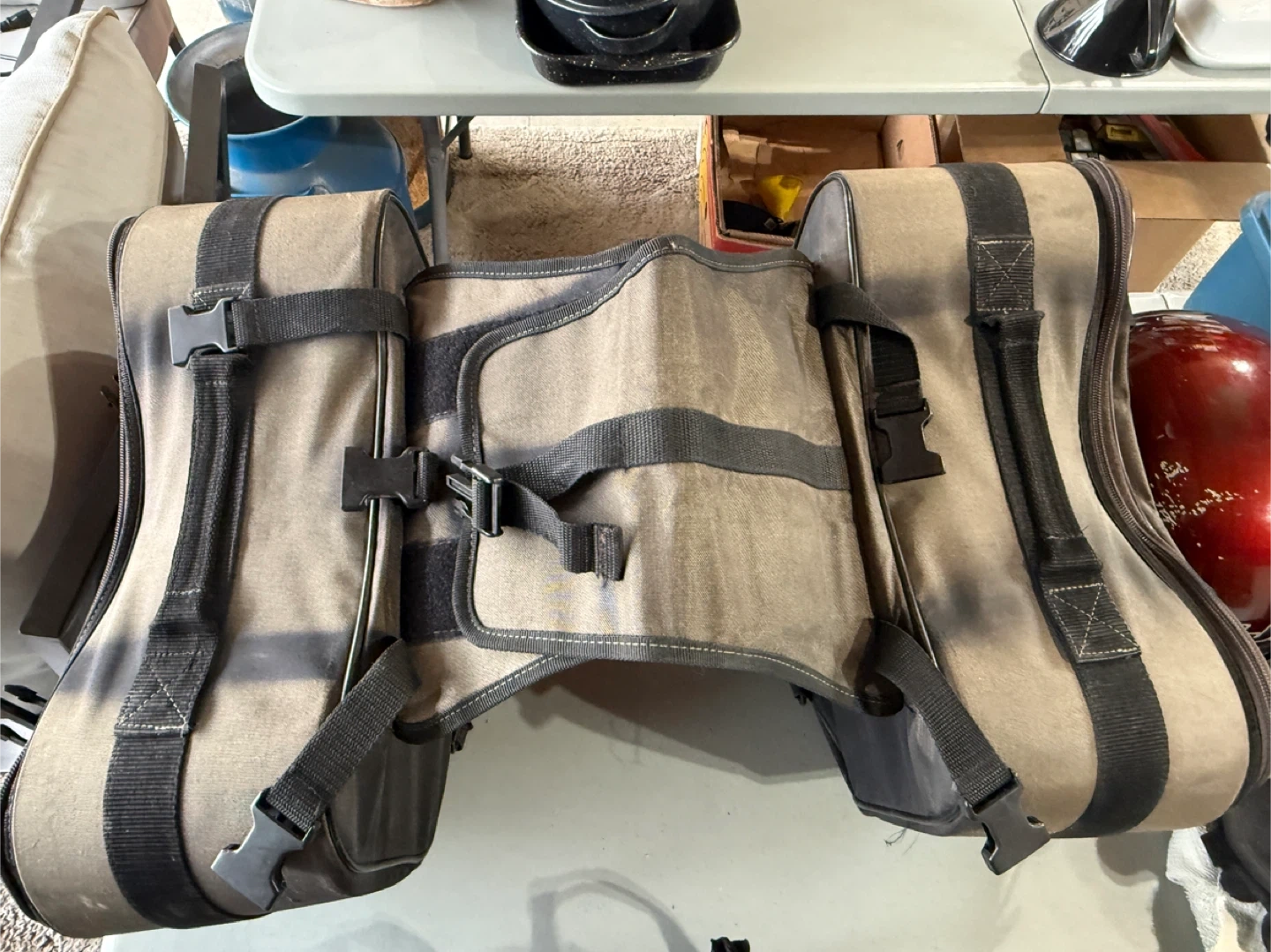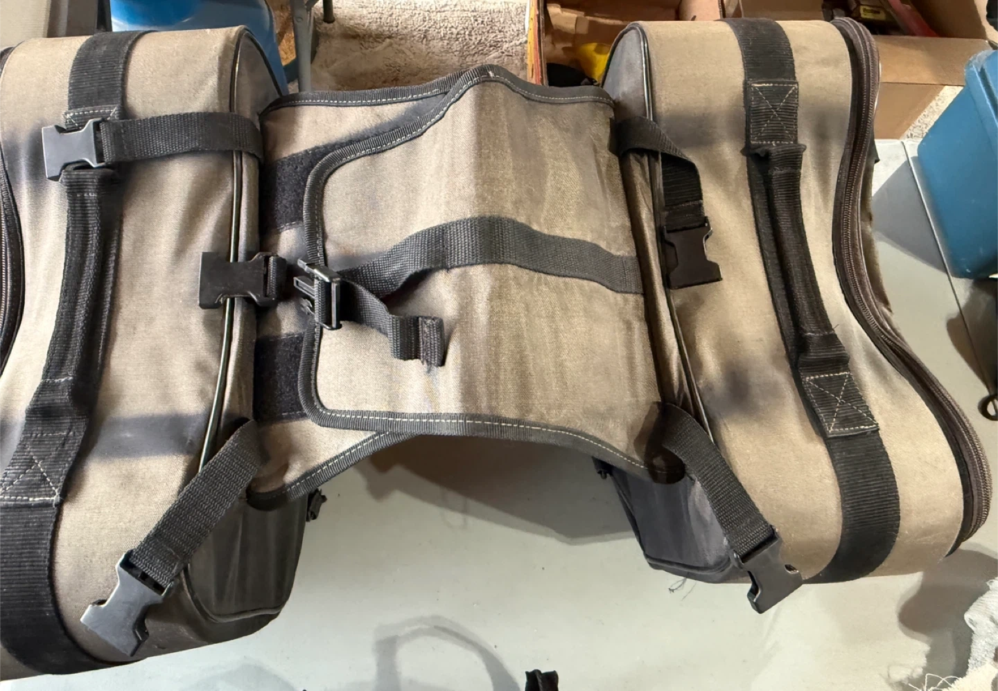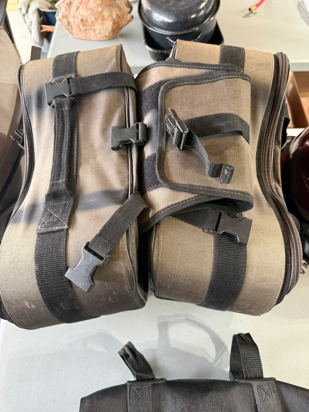 Teknic soft saddlebags for motorcycle use. These bags are made of durable fabric and feature multiple straps and buckles for secure attachment. They offer ample storage for your gear on rides. Some damage from rubbing, good for dry days or a little repair job.