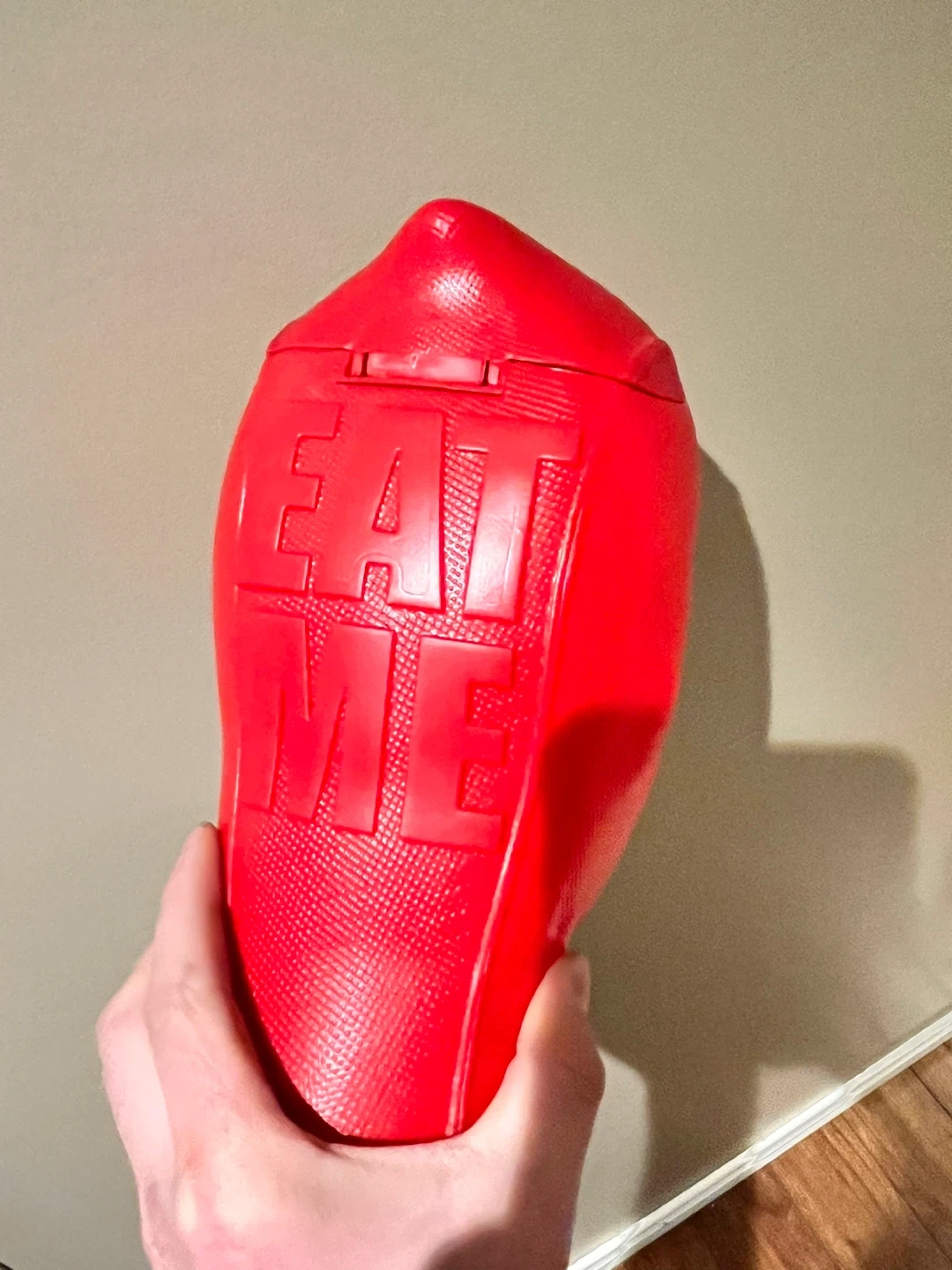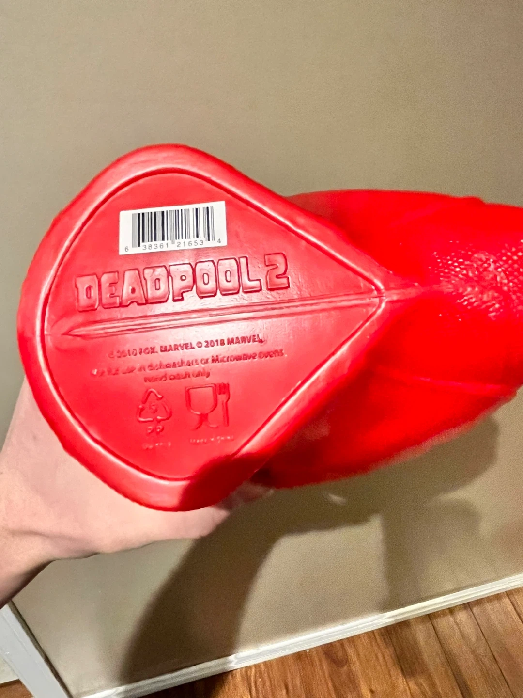 This is a red Deadpool mask, likely a prop replica. It also includes a red "Eat Me" container, also themed for Deadpool 2. Neither item is dishwasher or microwave safe.