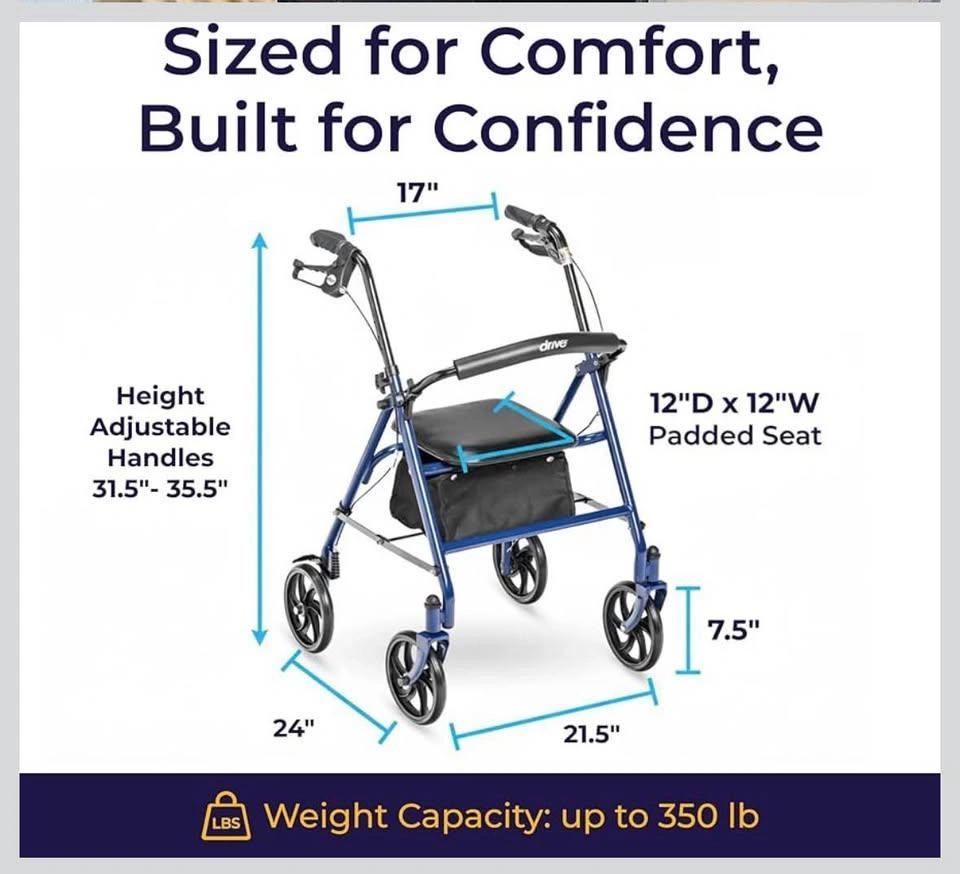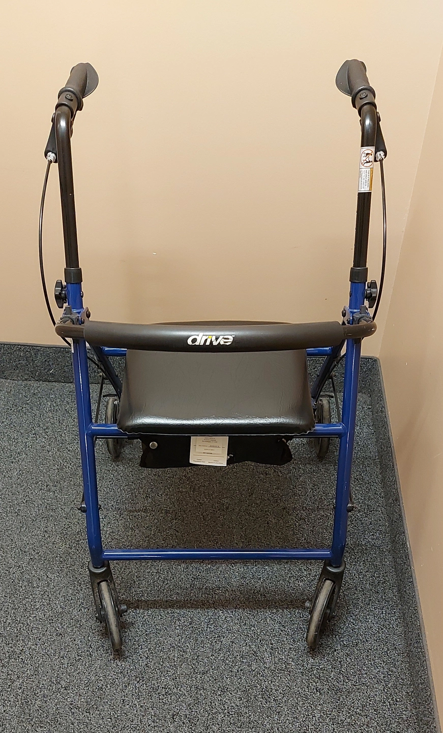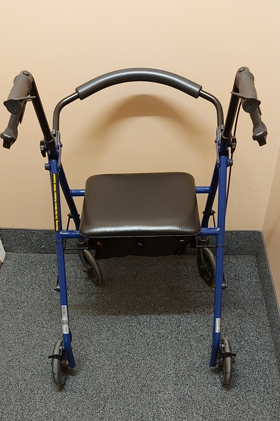 Collapsible, adjustable height, four wheels, two rear brakes, only used indoors, has under-seat basket, excellent condition.