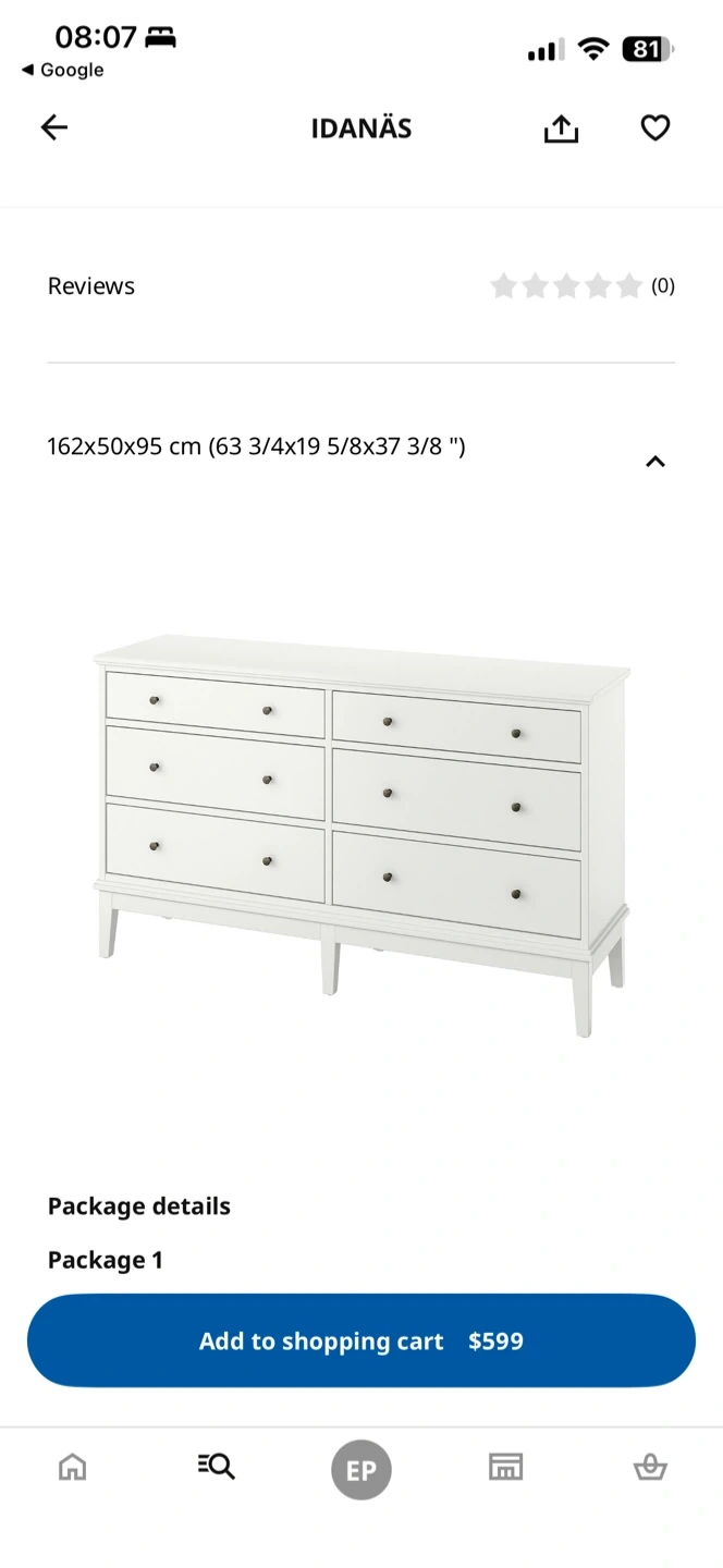 This is the IDANÄS 6-drawer dresser in white from IKEA. It offers ample storage with its six drawers. The dresser has a clean, modern design that fits well in various bedroom styles.