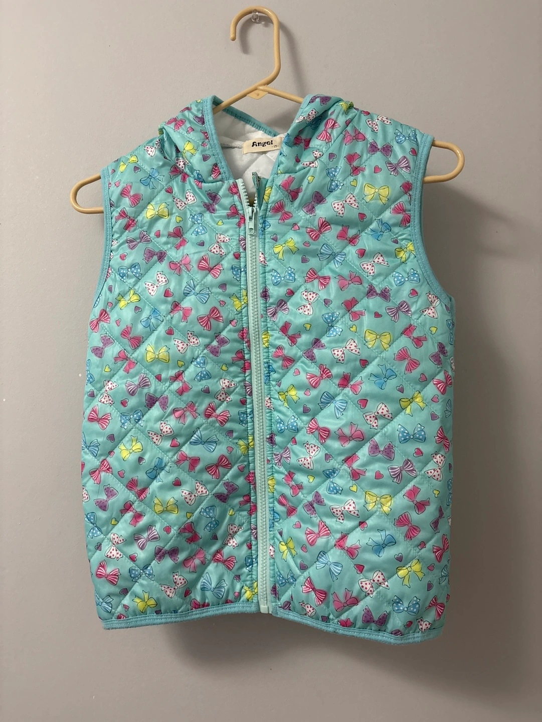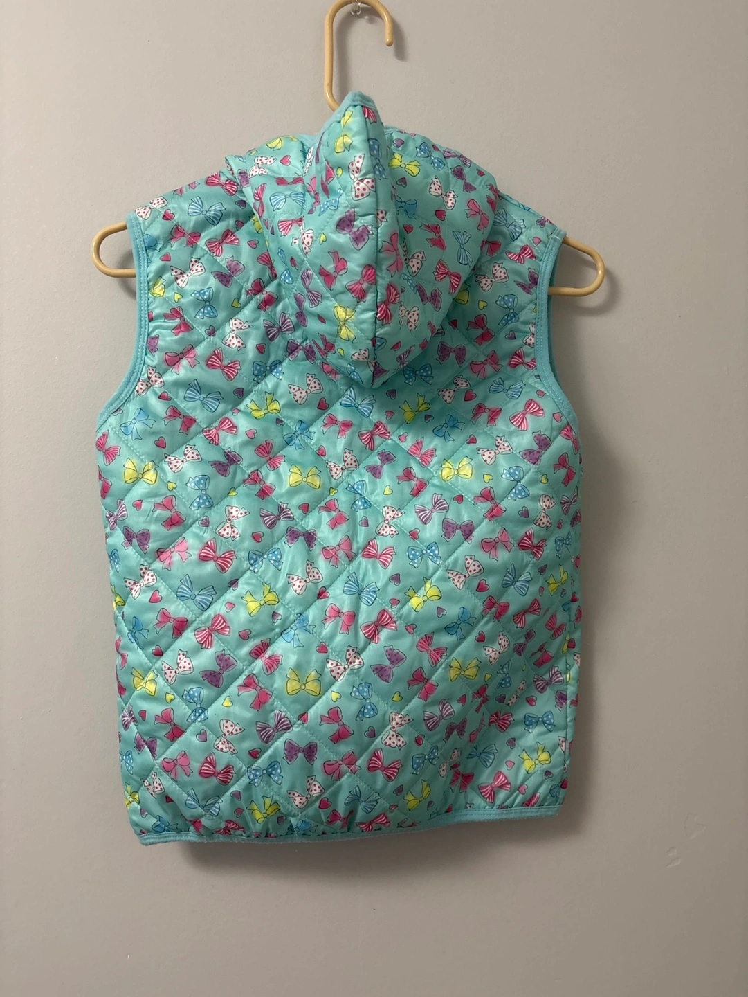 Adorable girls' quilted vest. Teal colour. Features a cute bow print. Zipper closure. Attached hood. Great for layering.