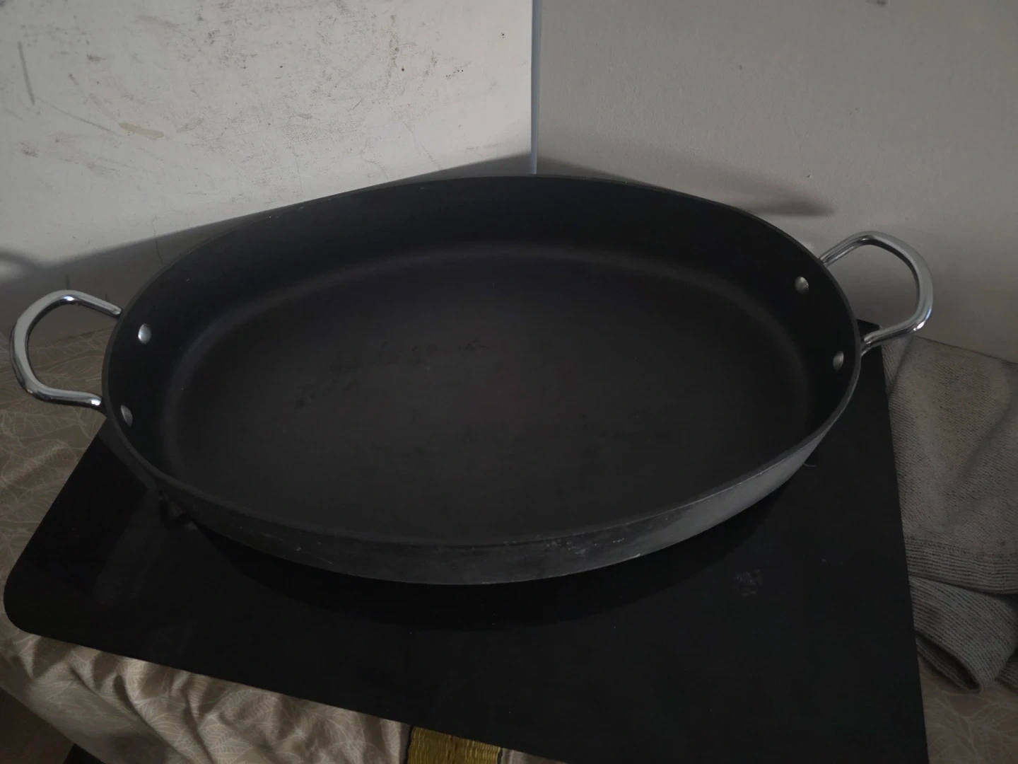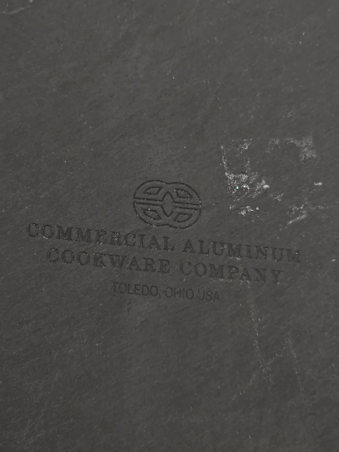 Large oval roasting pan with two handles. Made from aluminum. Manufactured by Commercial Aluminum Cookware Company in Toledo, Ohio, USA. Perfect for roasting larger meals or for use in commercial kitchens.