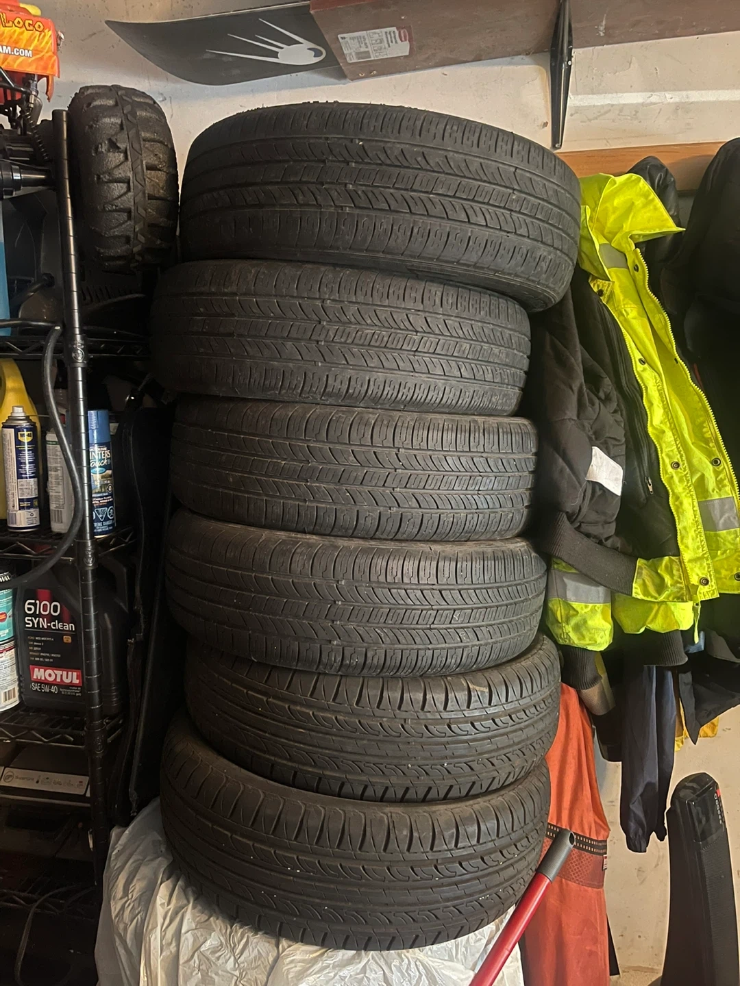 This is a set of six all-season tires. Size 15. 195/65/R15. They're all black and appear to be in good condition. Ideal for someone needing a full set of replacement tires.