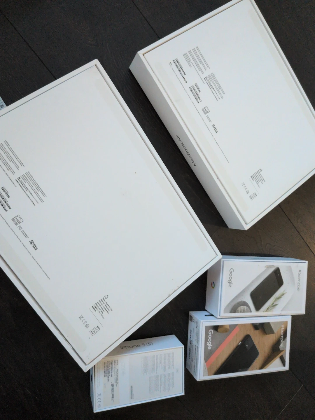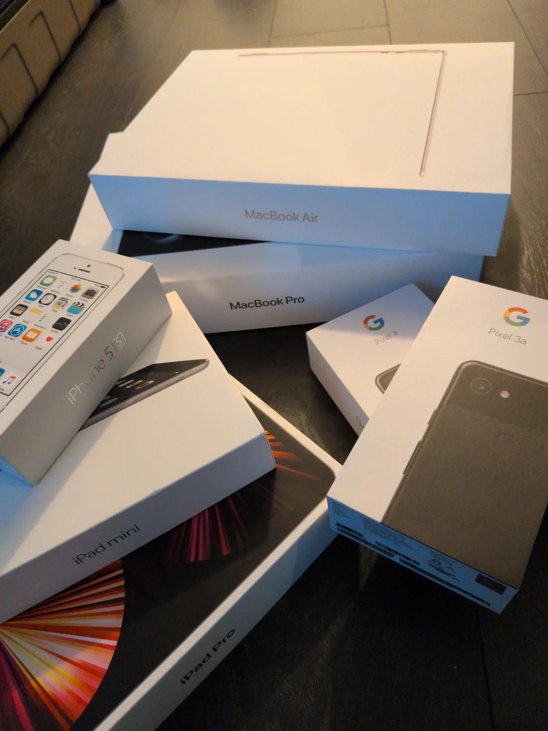 Bundle of Apple and Google electronics including an iPhone 5s, iPad mini, iPad Pro, MacBook Air, and MacBook Pro. Also includes a Google Pixel 4 and Pixel 3a. All items appear to be in their original boxes.
