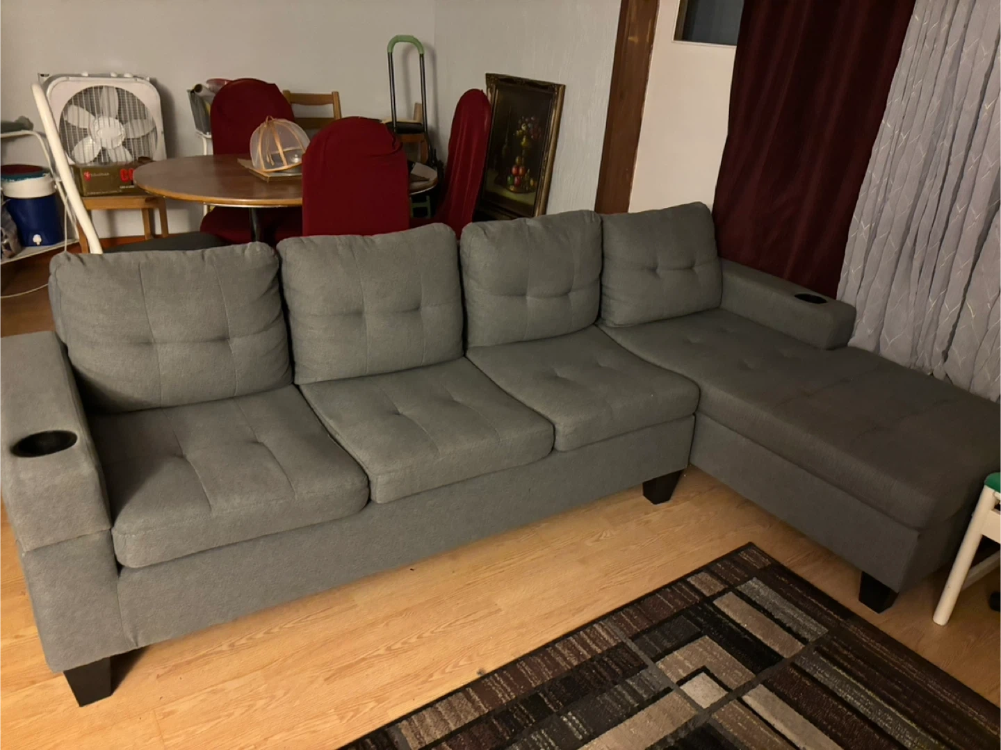 This sectional sofa offers comfortable seating with a modern design. It's upholstered in a durable grey fabric and features built-in cup holders for convenience. The chaise section can be configured on either side. Upholstery is fabric🥕