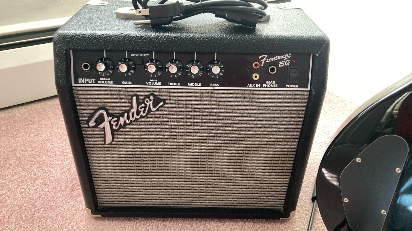 A very cool First Act ME 1980 Double Cut Electric Guitar in like new condition, with a smooth neck and a beautiful Rosewood Fretboard. Includes a Fender Frontman 15G amplifier. The amp features Solid State Output, 15 watts into 8 ohms, an 8" Fender Special Design Speaker, Dual Selectable Channels (Normal and Drive), a 3-Band EQ, Headphone Jack, and Auxiliary Input. Black textured vinyl covering with silver grille cloth. I have several other amplifiers if you're looking for something different. Guitar trades considered.
