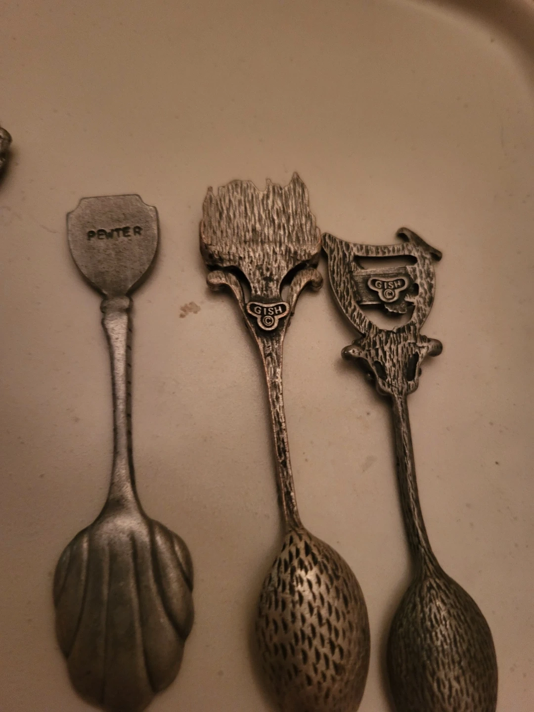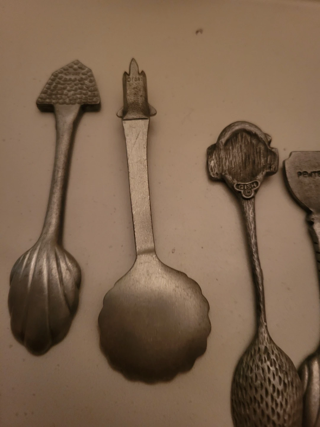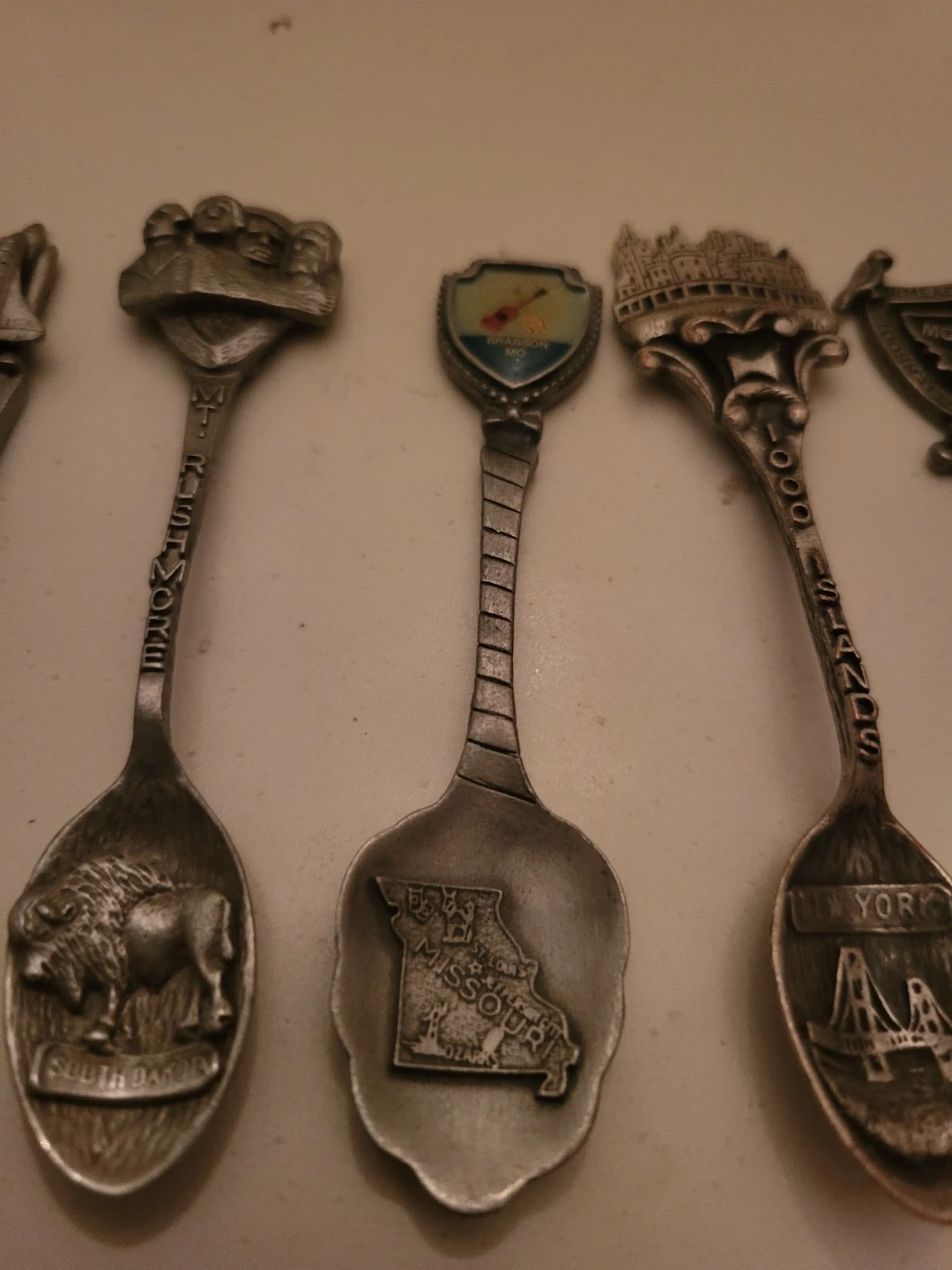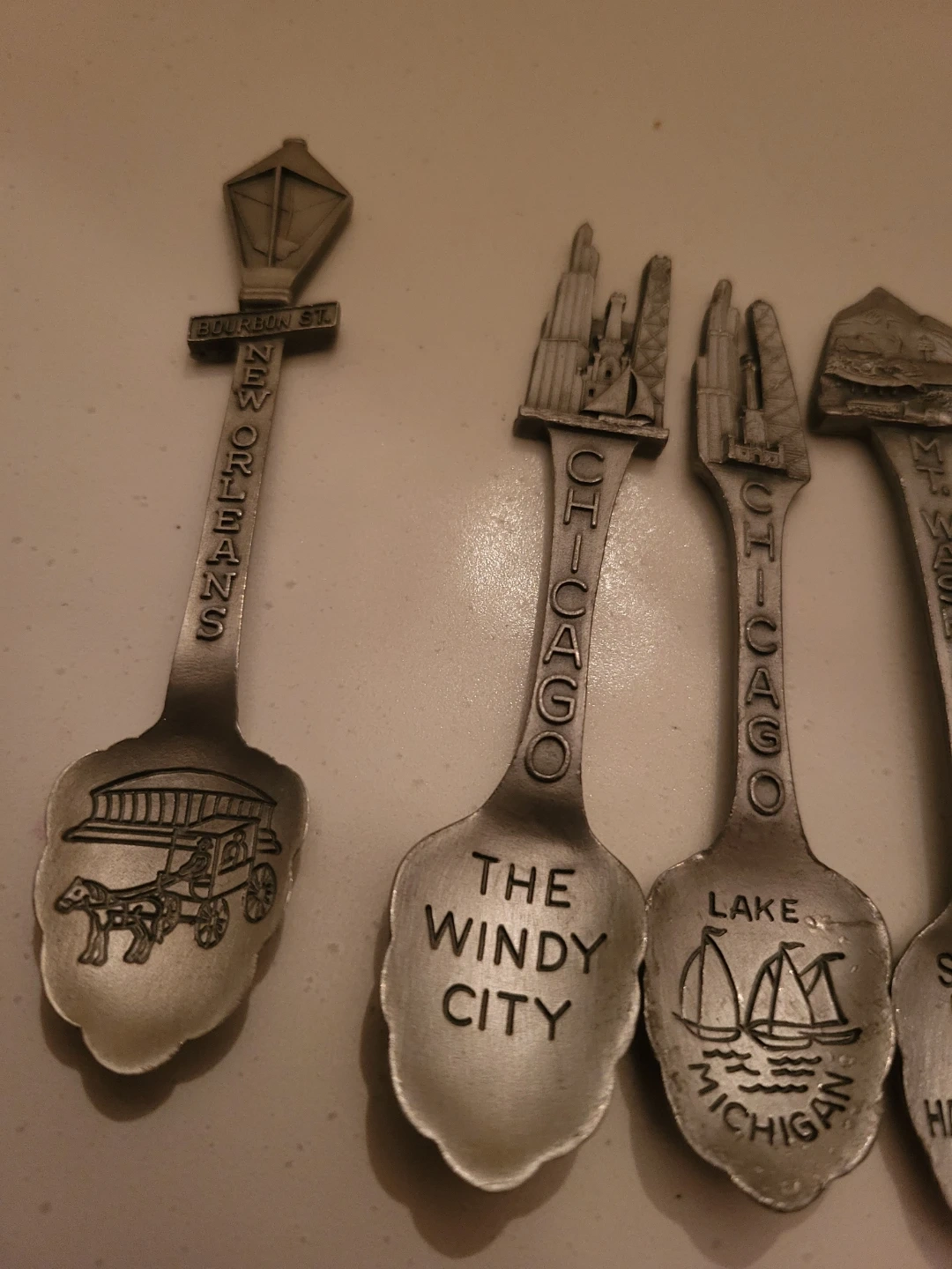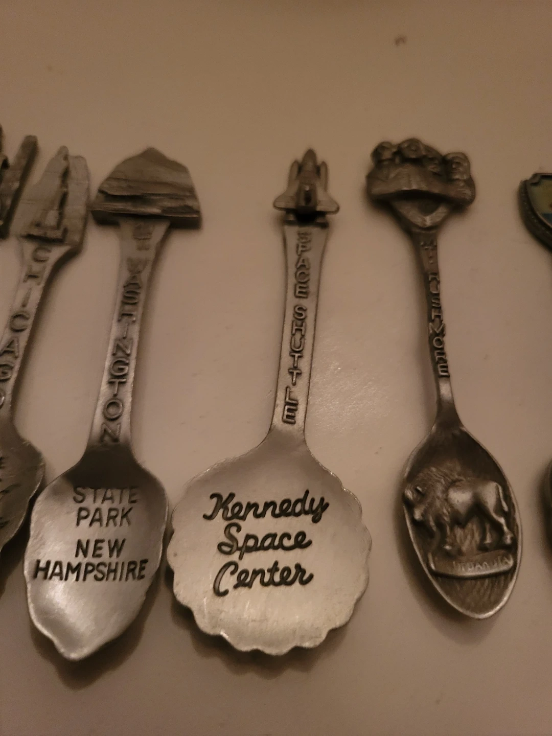 This is a collection of souvenir spoons from various locations including Kennedy Space Center, New Hampshire, and Chicago. These spoons are great for collectors or as mementos of past travels.