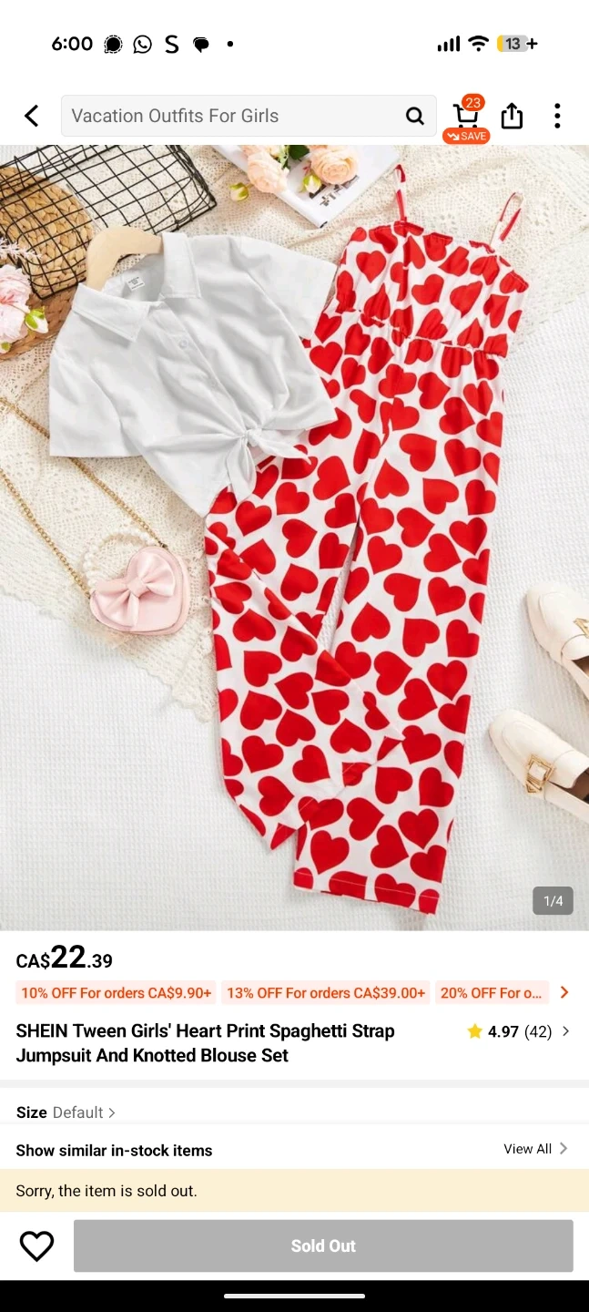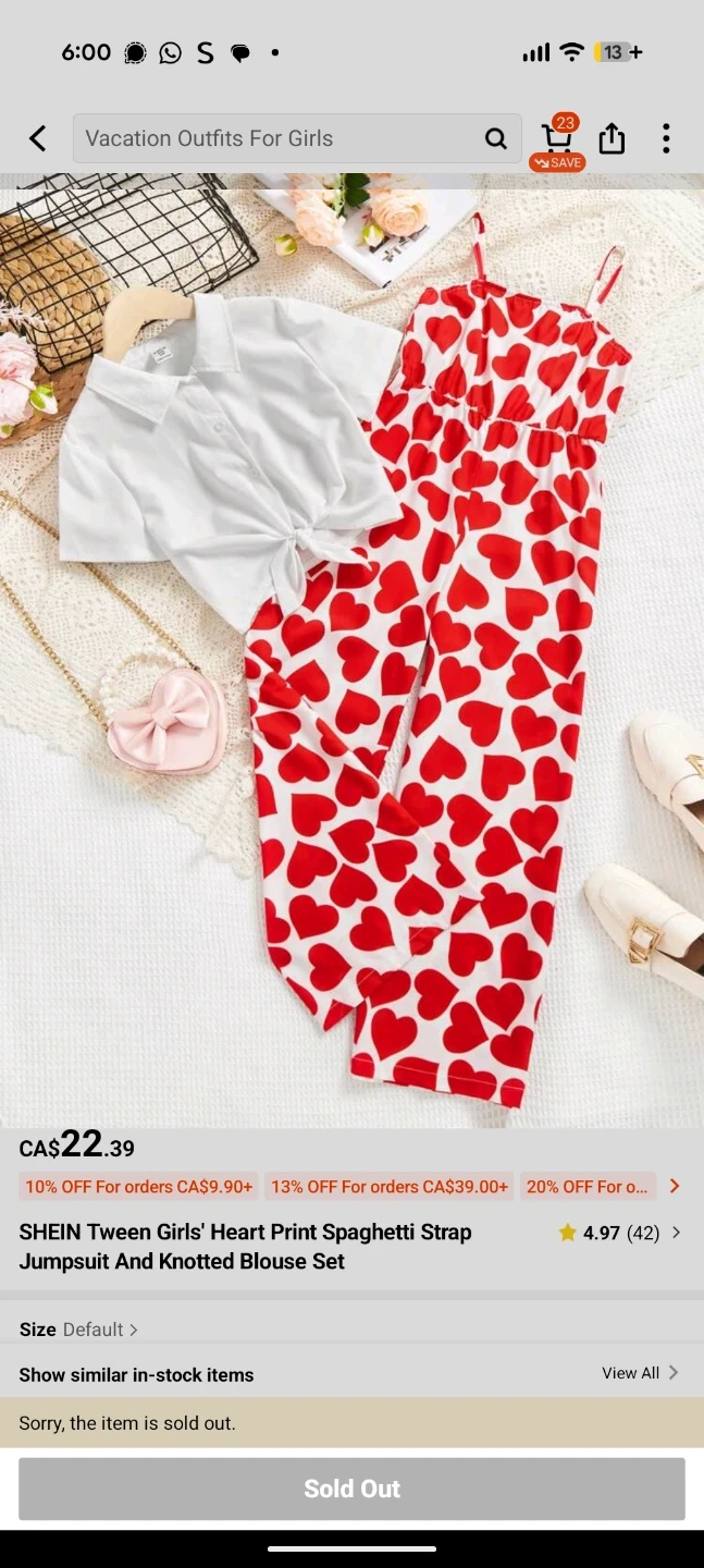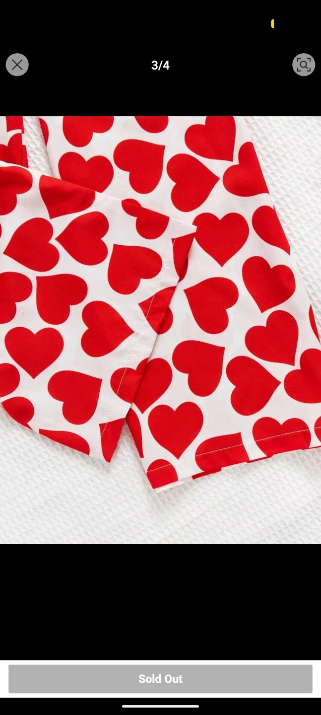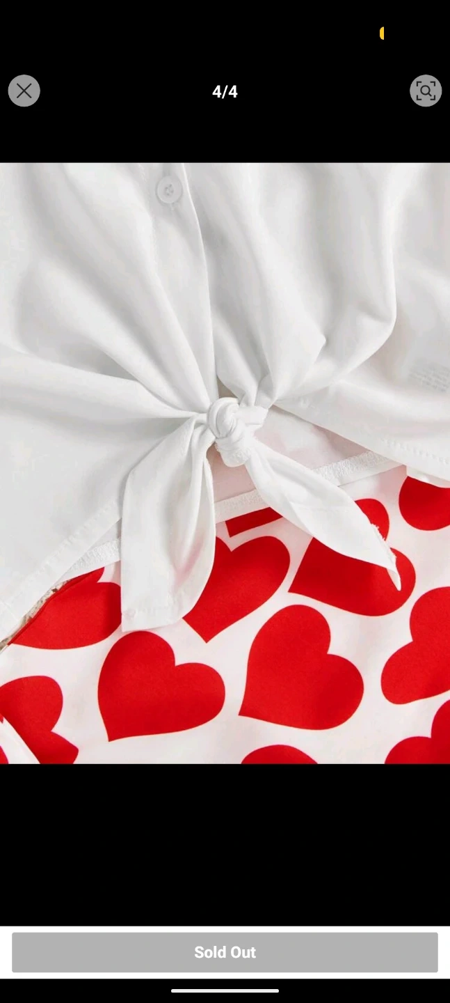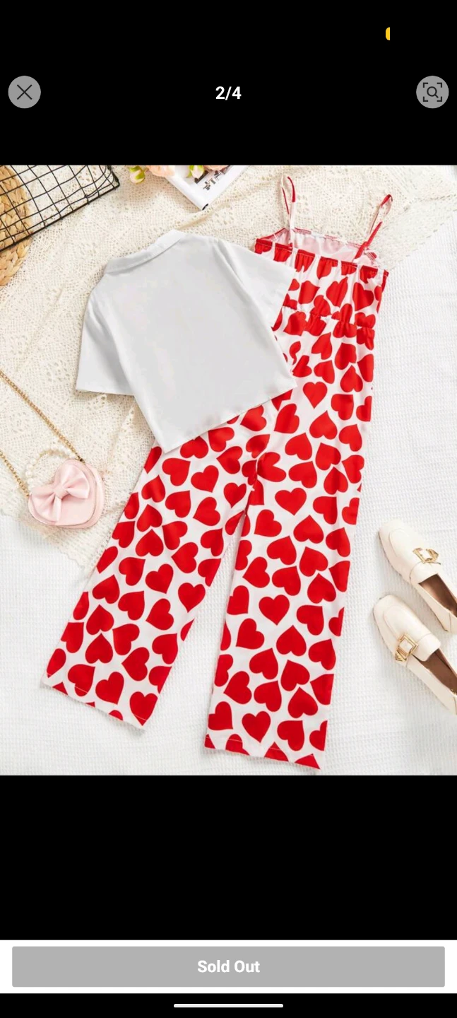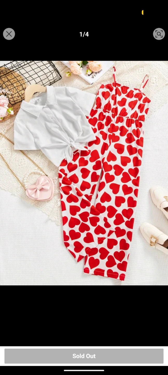 This cute two-piece set features a red heart print spaghetti strap jumpsuit and a white knotted blouse. It's made from a comfortable fabric. Perfect for a fun, casual outfit!