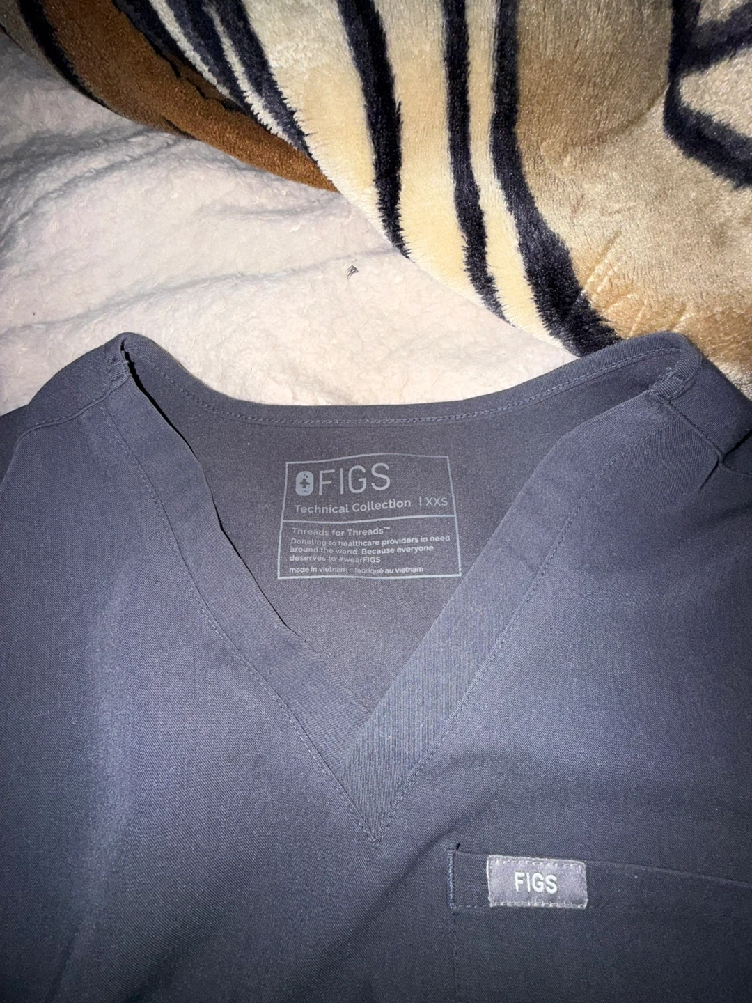 This is a FIGS Technical Collection scrub top in charcoal grey. It's a size XXS, made with durable technical fabric. Perfect for healthcare professionals who need comfortable and functional workwear.