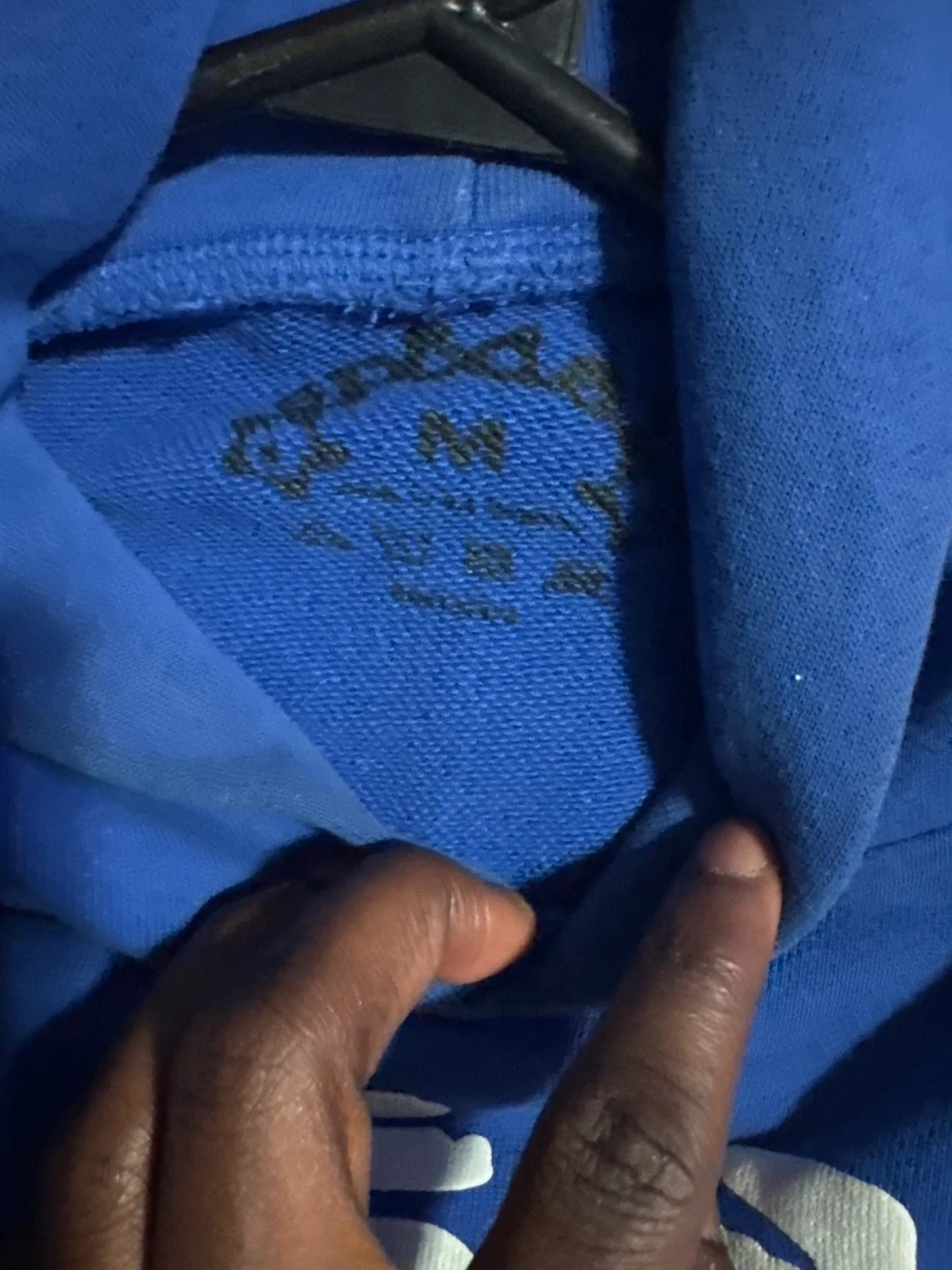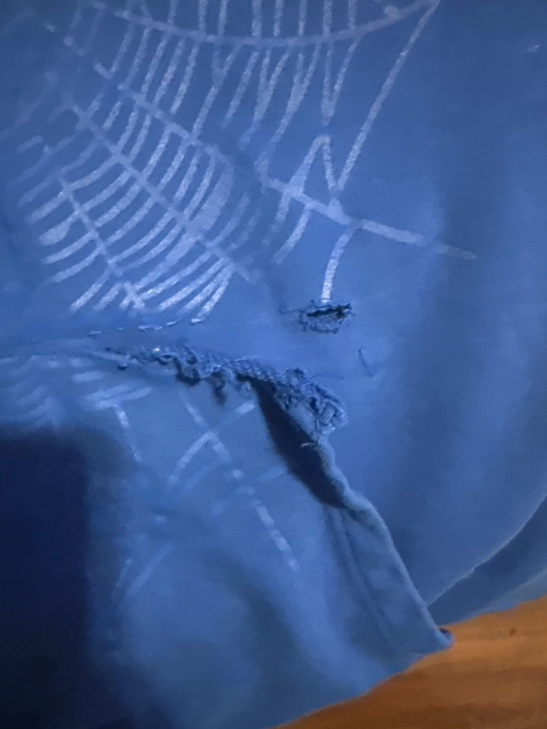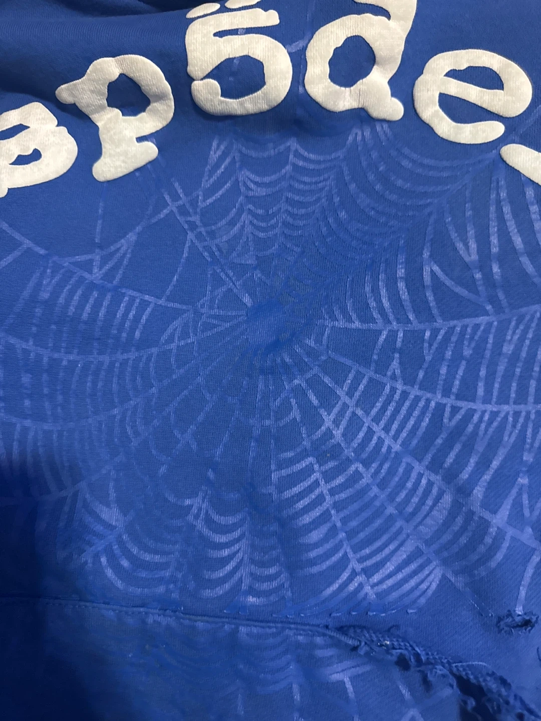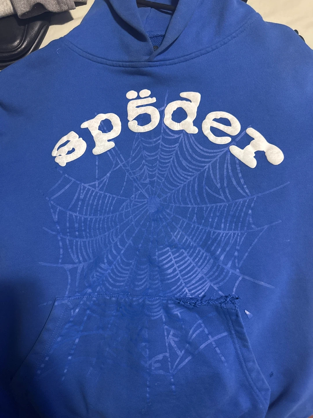 Blue hoodie with a white spider-web graphic on the front. It's a size medium. There's some minor damage to the front pocket area.