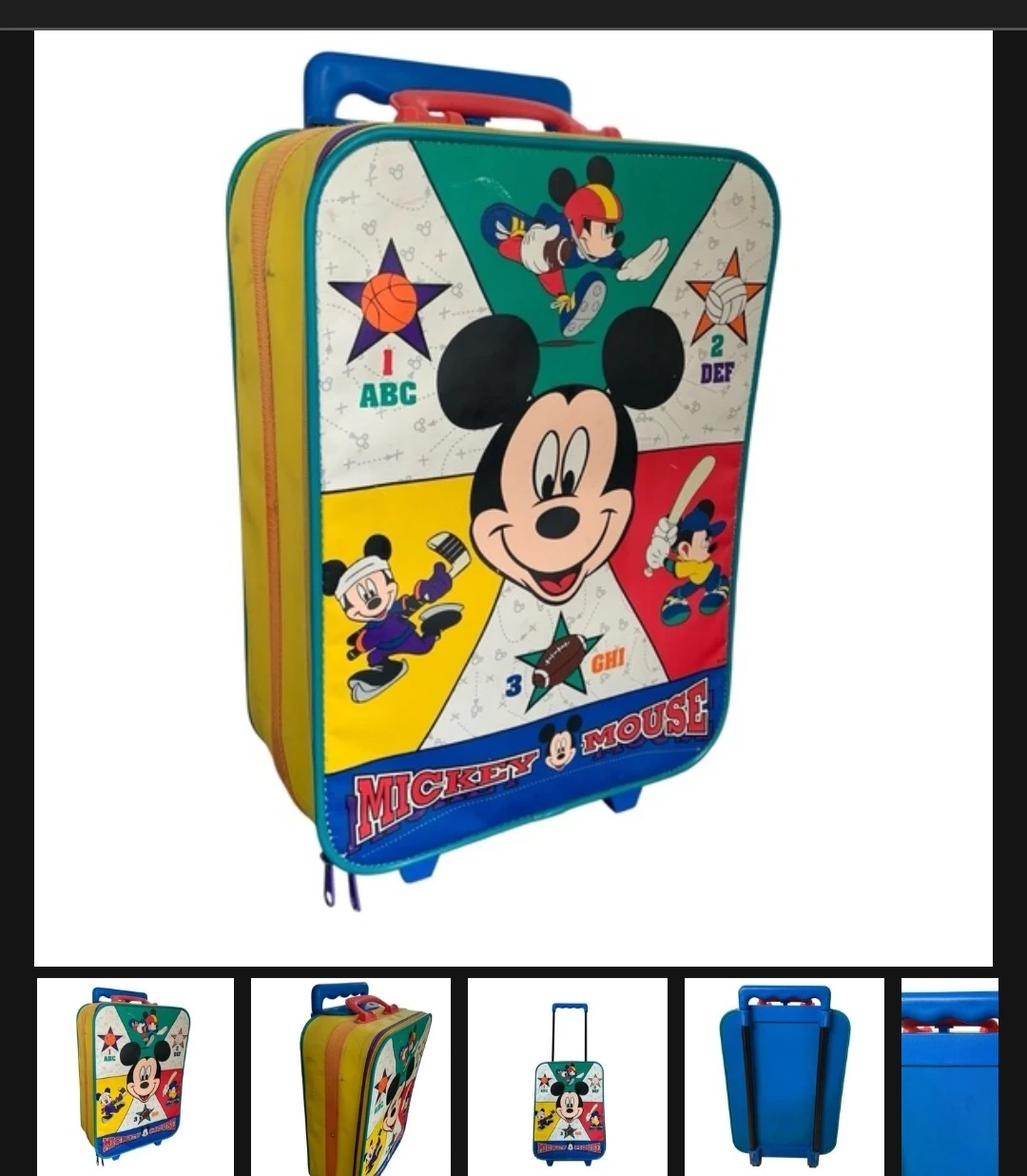 This vintage rolling suitcase features a vibrant Mickey Mouse design with various sports and ABC graphics. It's equipped with a retractable handle and wheels for easy transport. Perfect for kids or collectors!