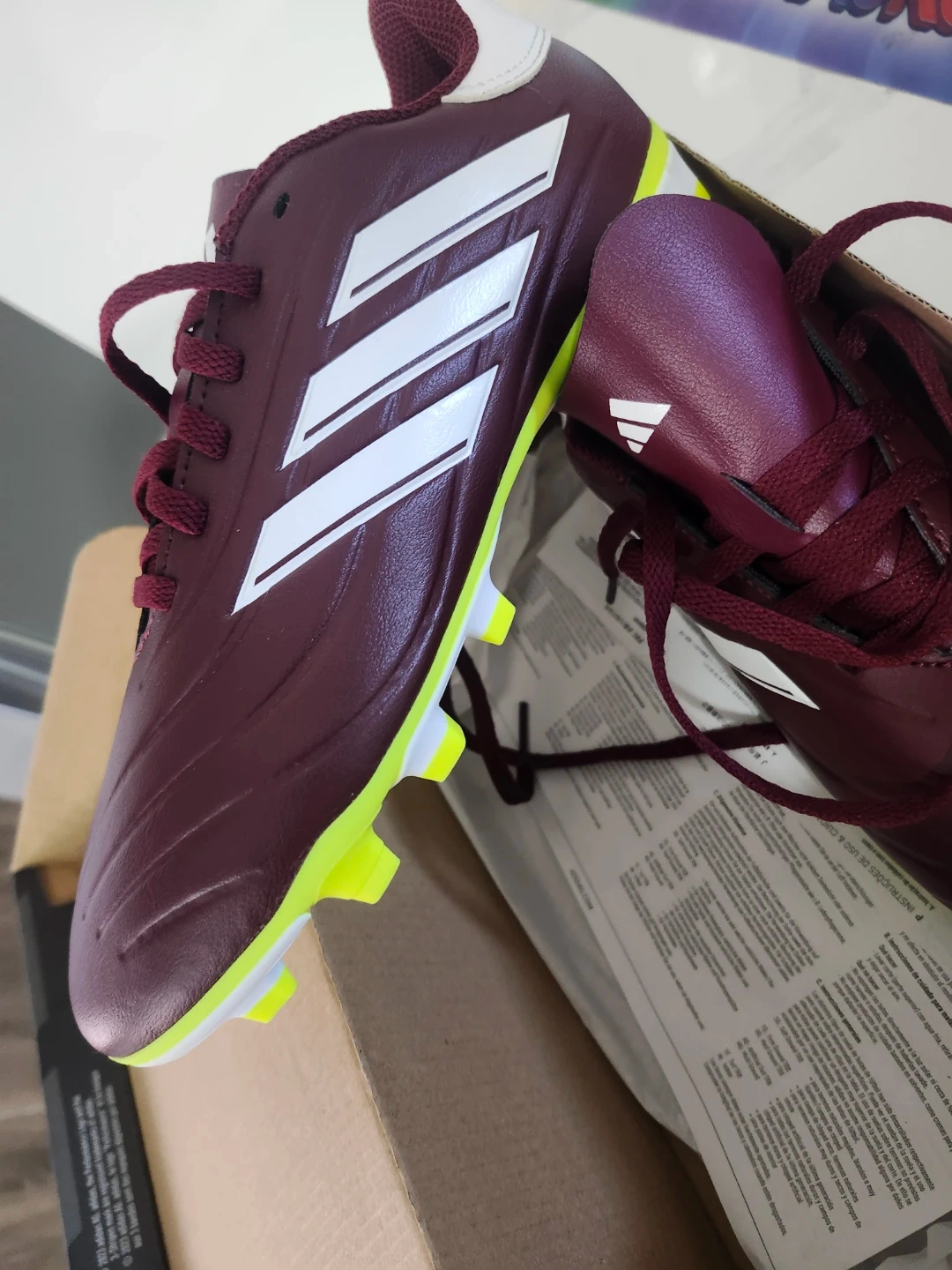 Adidas F50 Club Messi soccer cleats in a burgundy colour. These cleats are size 5.5 US. They're designed for football and soccer.
