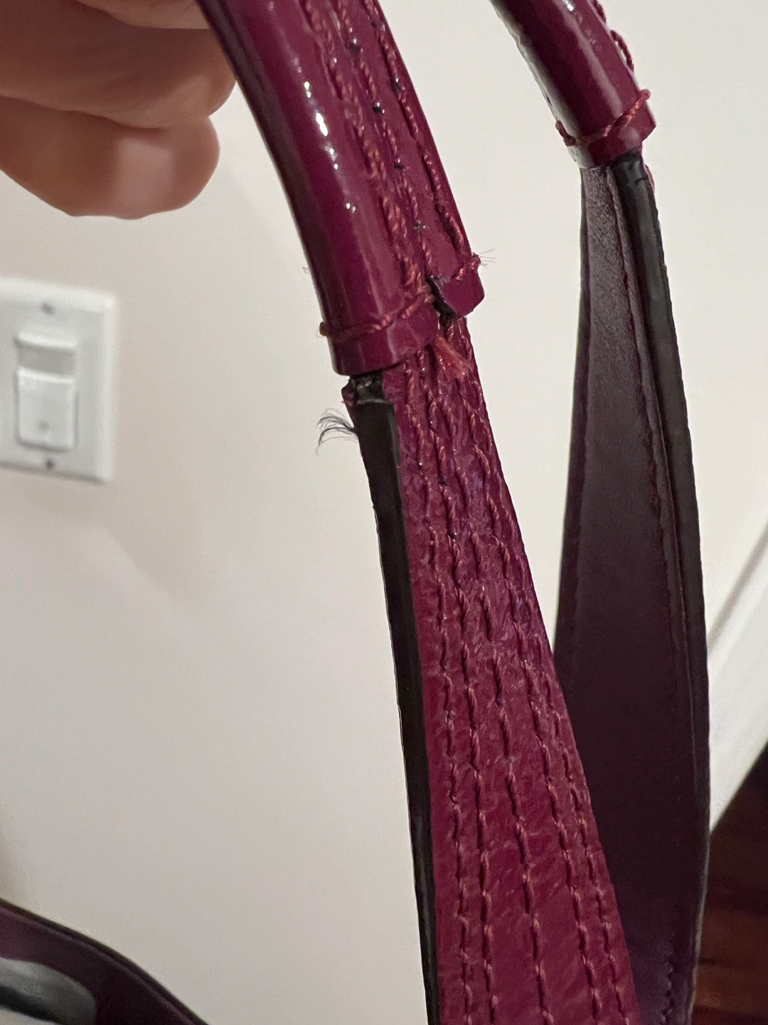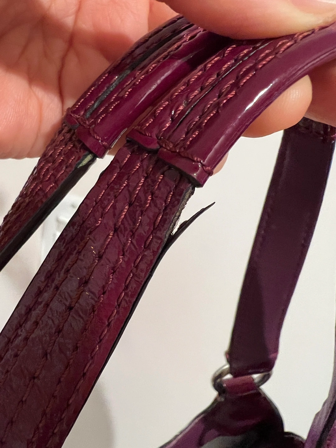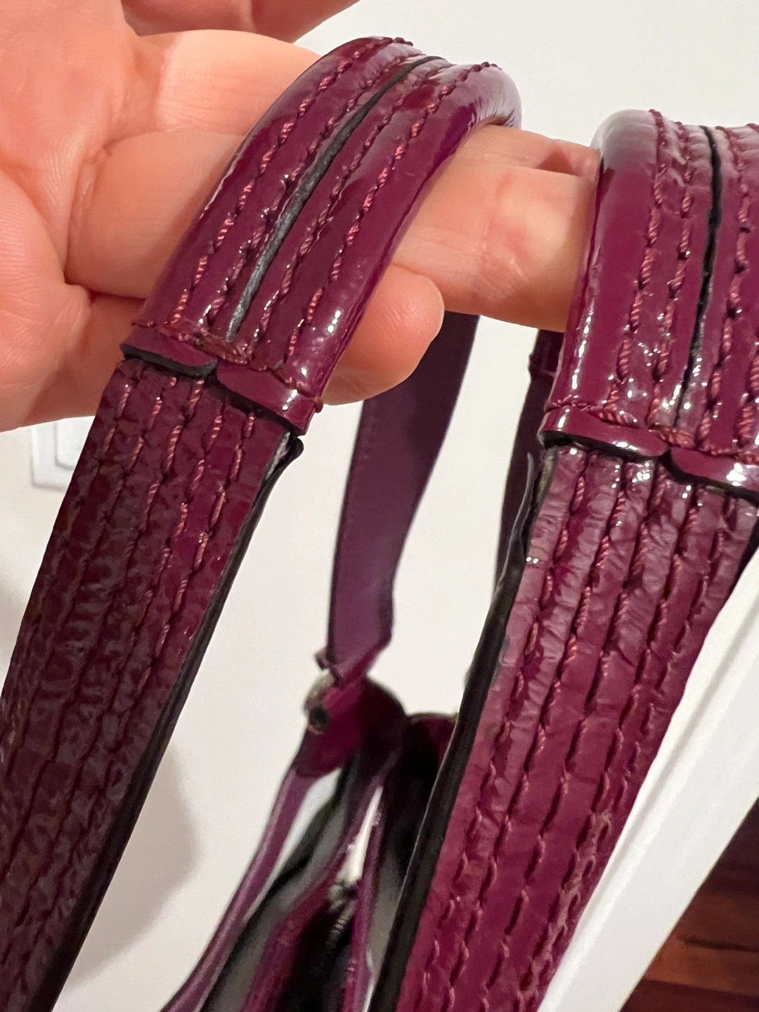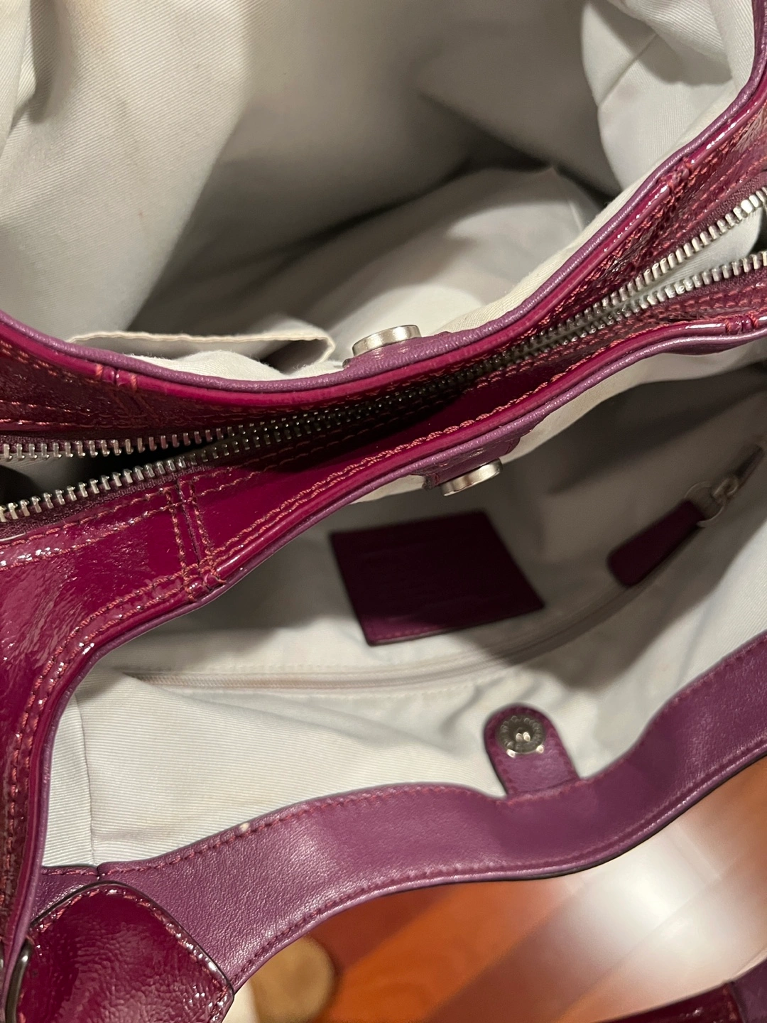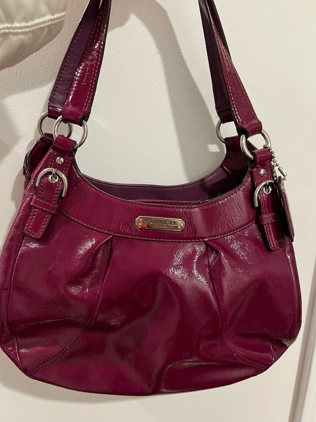 Pre-loved Coach handbag. Purple patent leather. Shoulder bag with minor wear to handles. Zipper and snap closure. Interior pockets.