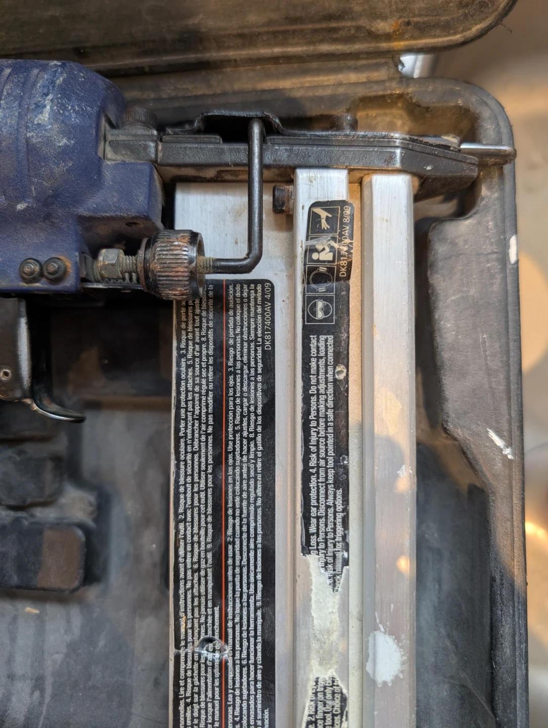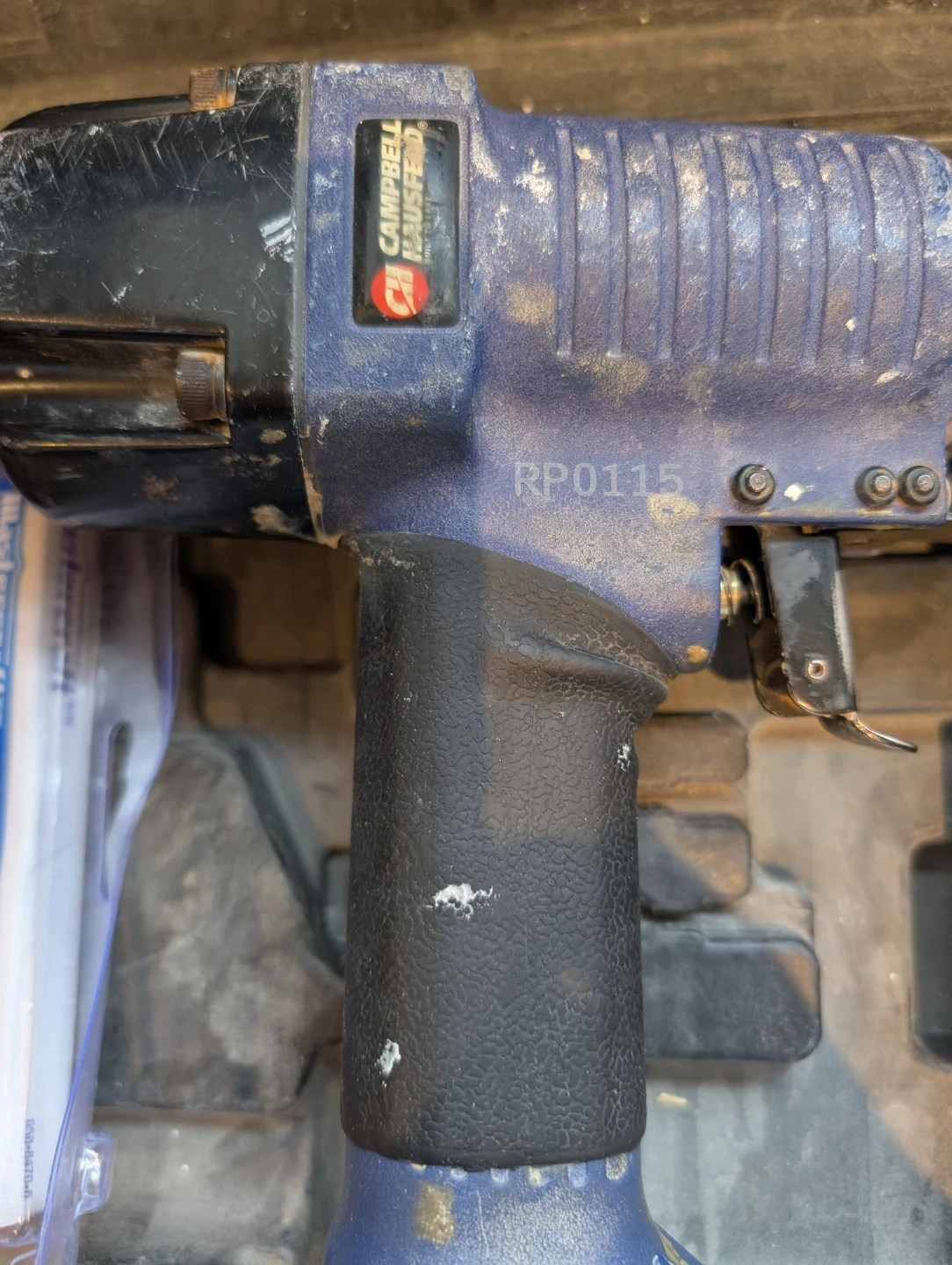 Campbell Hausfeld RP0115 air nailer, comes in a case. It's a powerful tool for various nailing tasks. Uses standard nails for convenience.