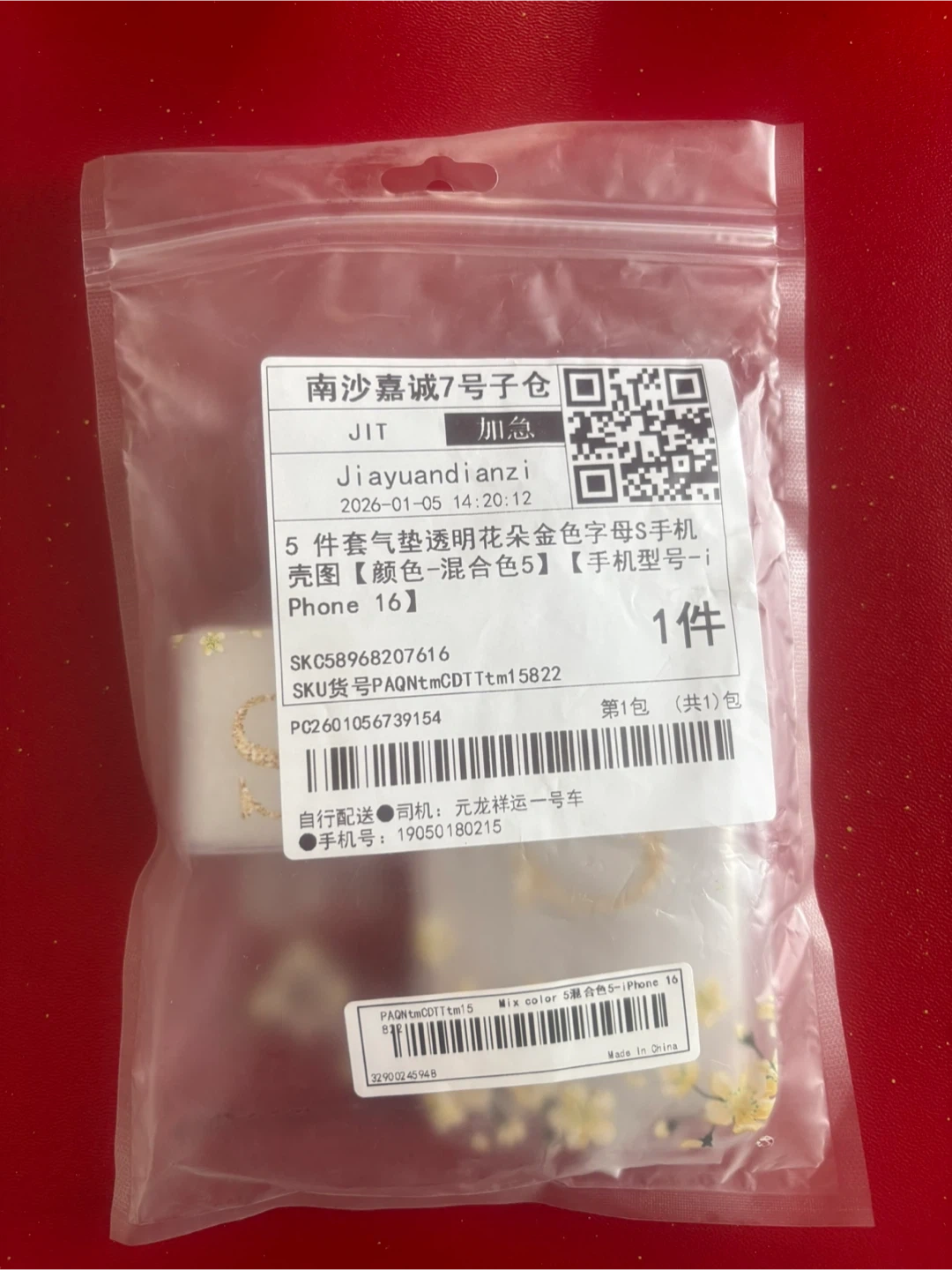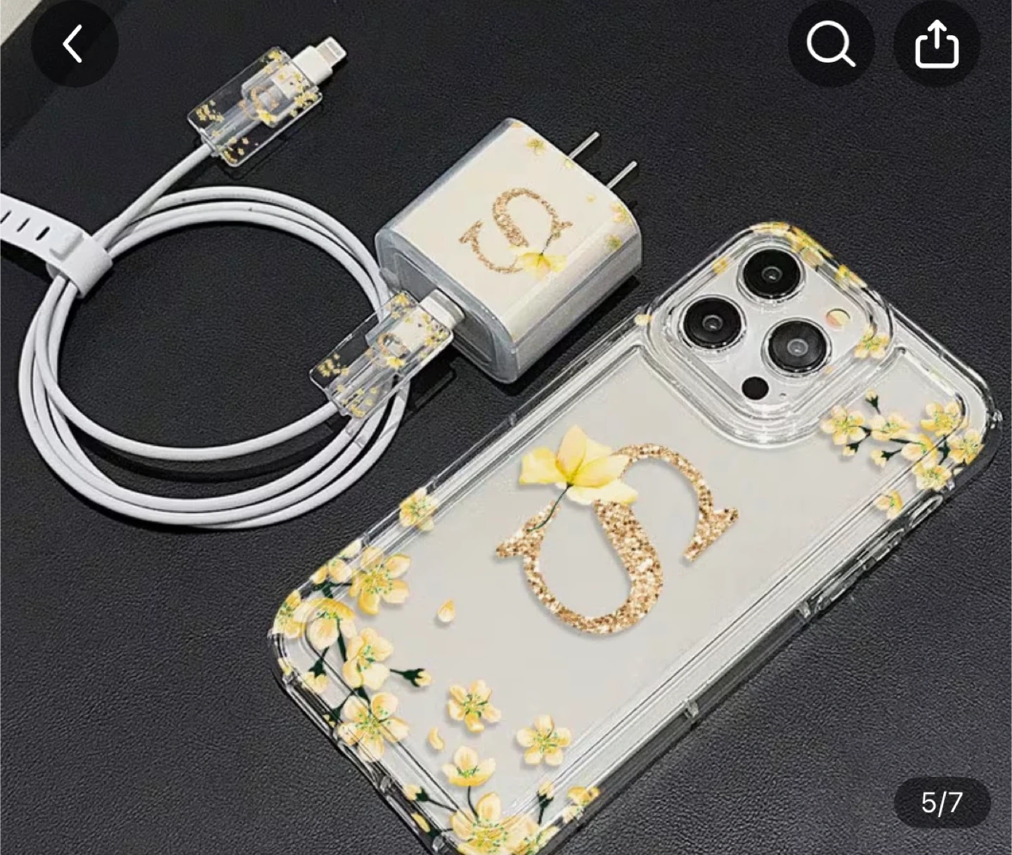 This is a 5-piece set including a clear phone case and charger accessories. The case is decorated with a gold glitter letter 'S' and a floral pattern. The charger components also feature a matching design. Made in China.