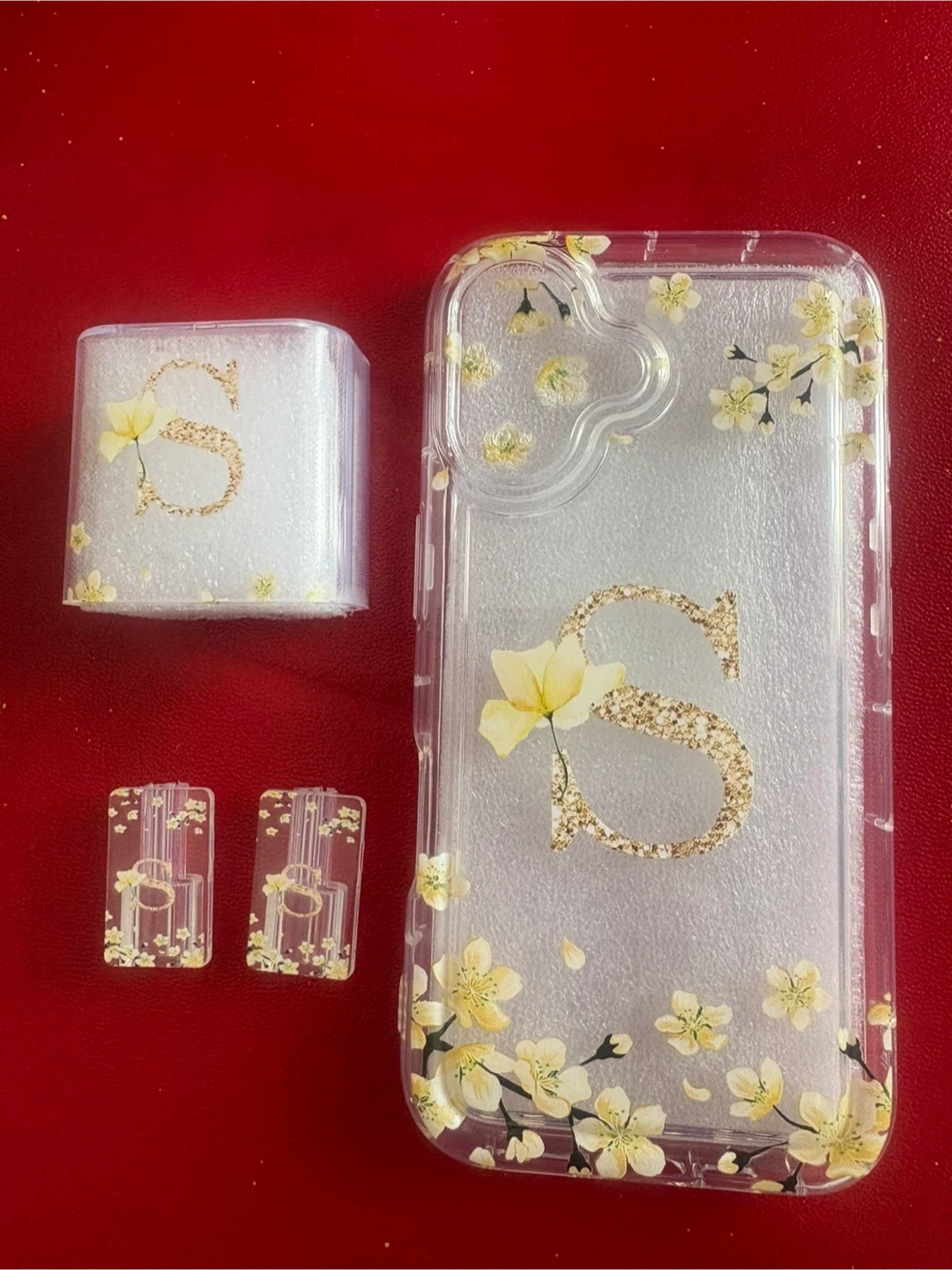 iPhone 16 Clear Floral Letter S Phone Case & Charger Set