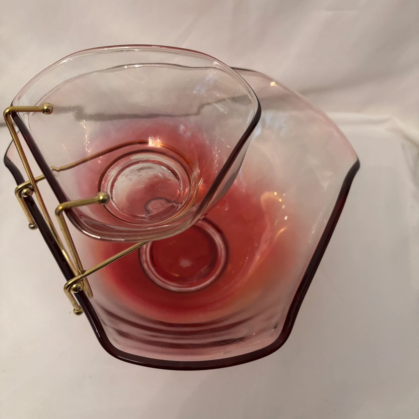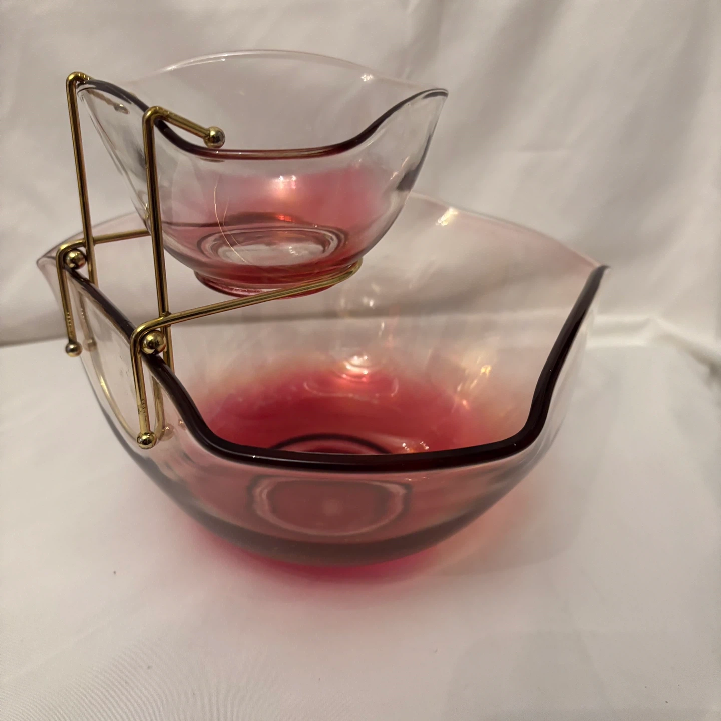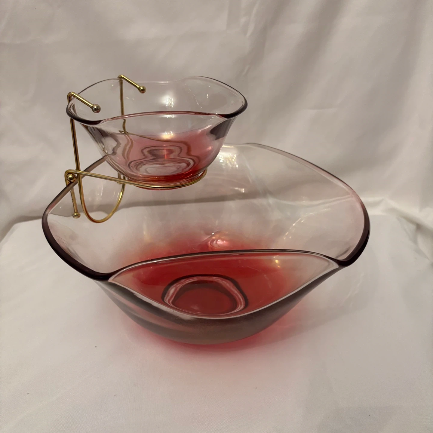 Vintage Mid-century 3-piece Chip and Dip Bowls Indiana Glass Clear with Ruby/Cranberry Ombré Fade and Brass-tone Clip Bracket Holder