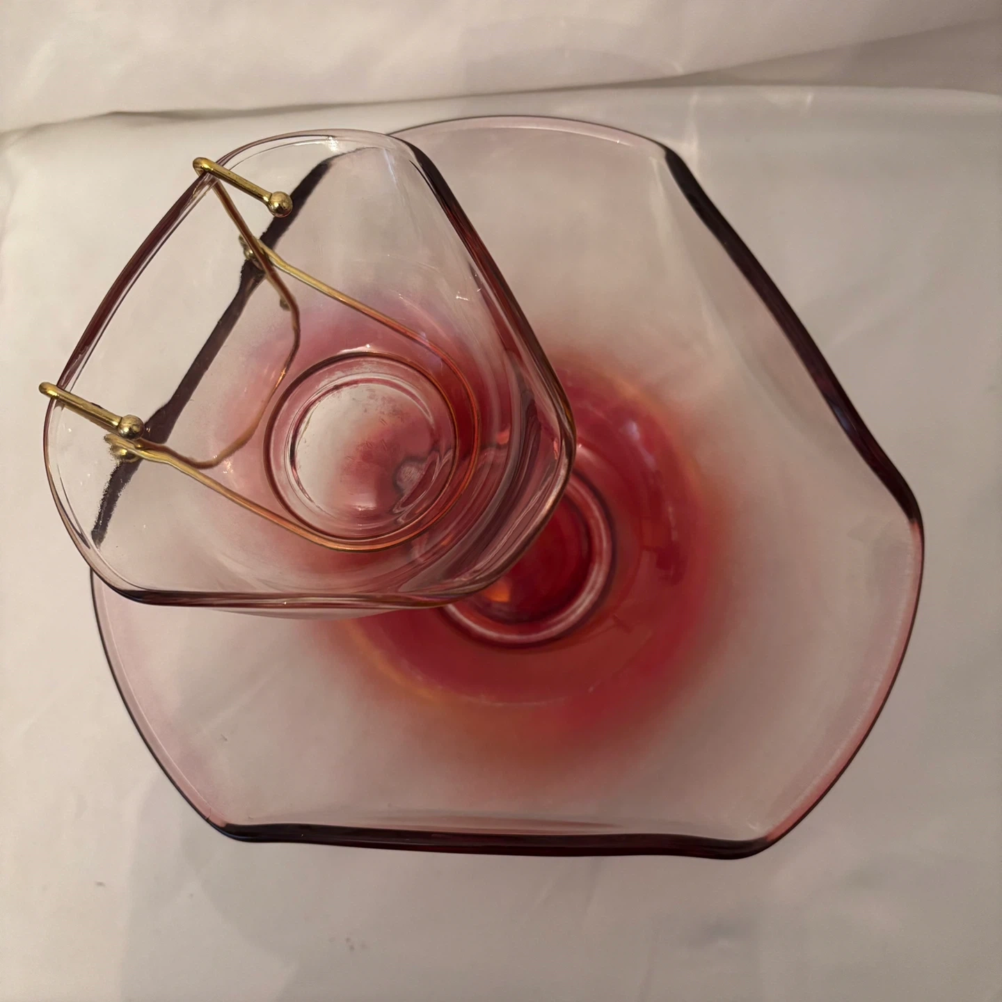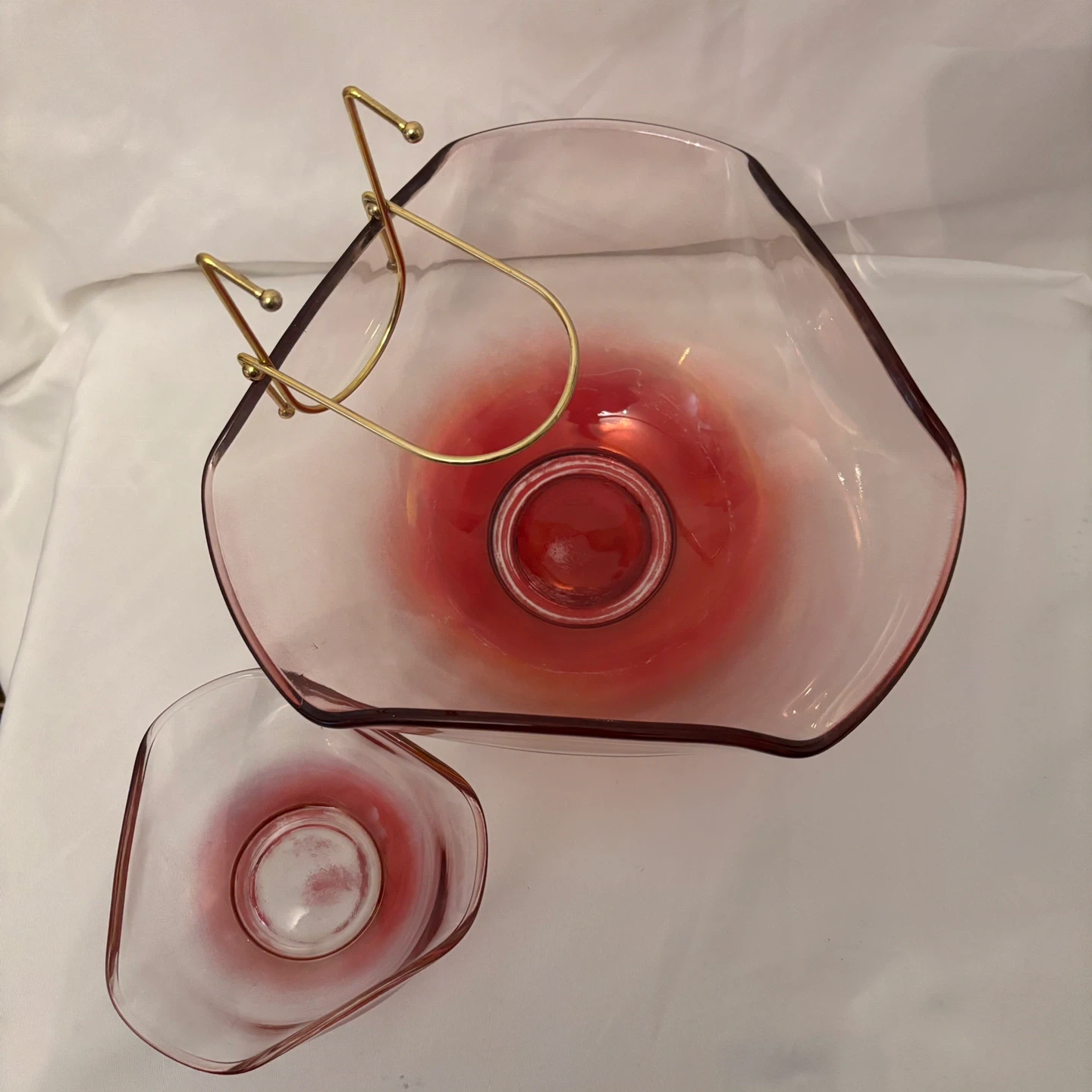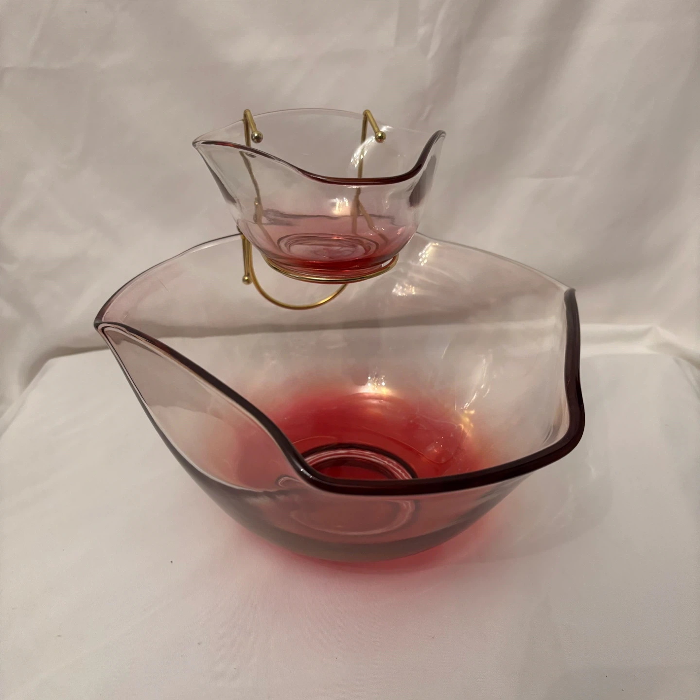 This is a two-piece pink glass serving set. It includes a large bowl and a smaller dip bowl supported by a gold-tone metal stand. Perfect for serving snacks at gatherings!