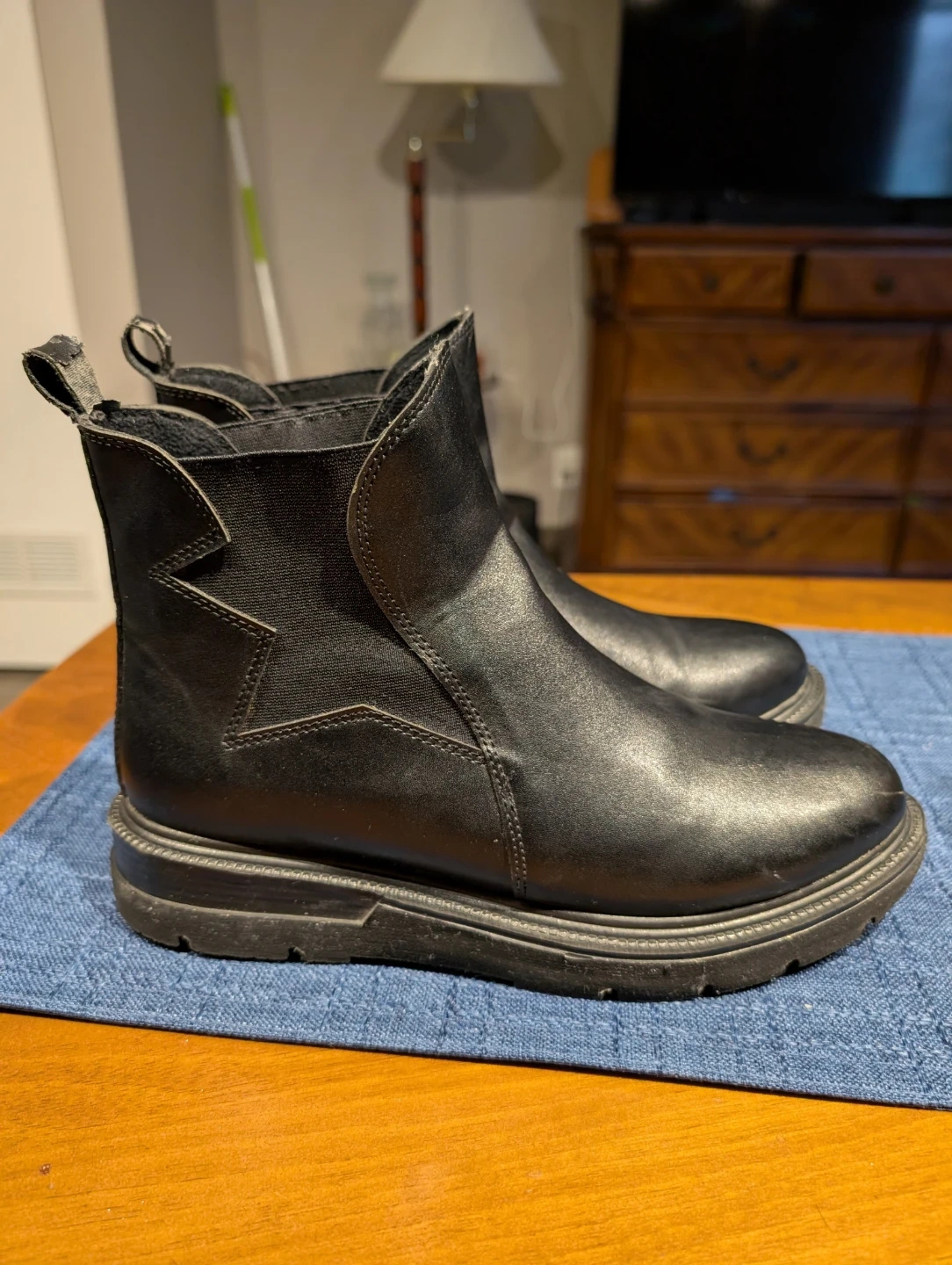 Stylish black leather Chelsea boots with elastic side panels and pull tabs. These boots feature a durable sole and a unique star design detail on the side. They're comfortable and chic for everyday wear!