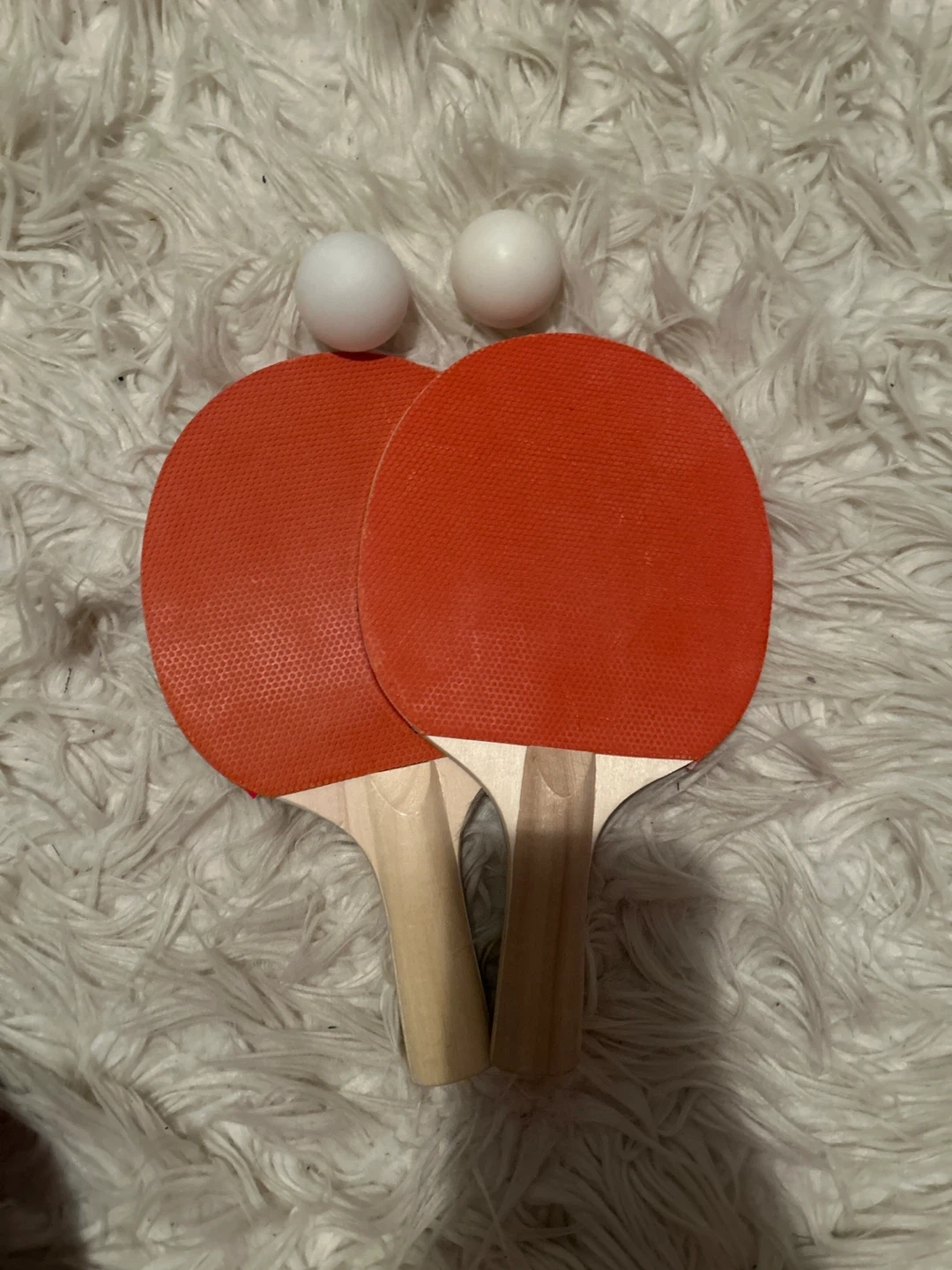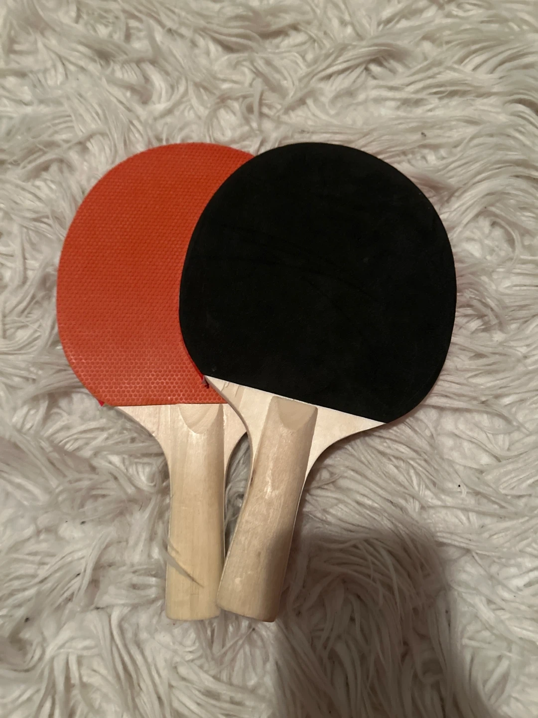 Two ping pong paddles are included with two white balls. One paddle has a red side and the other has a black side. These are great for a quick game indoors or out!