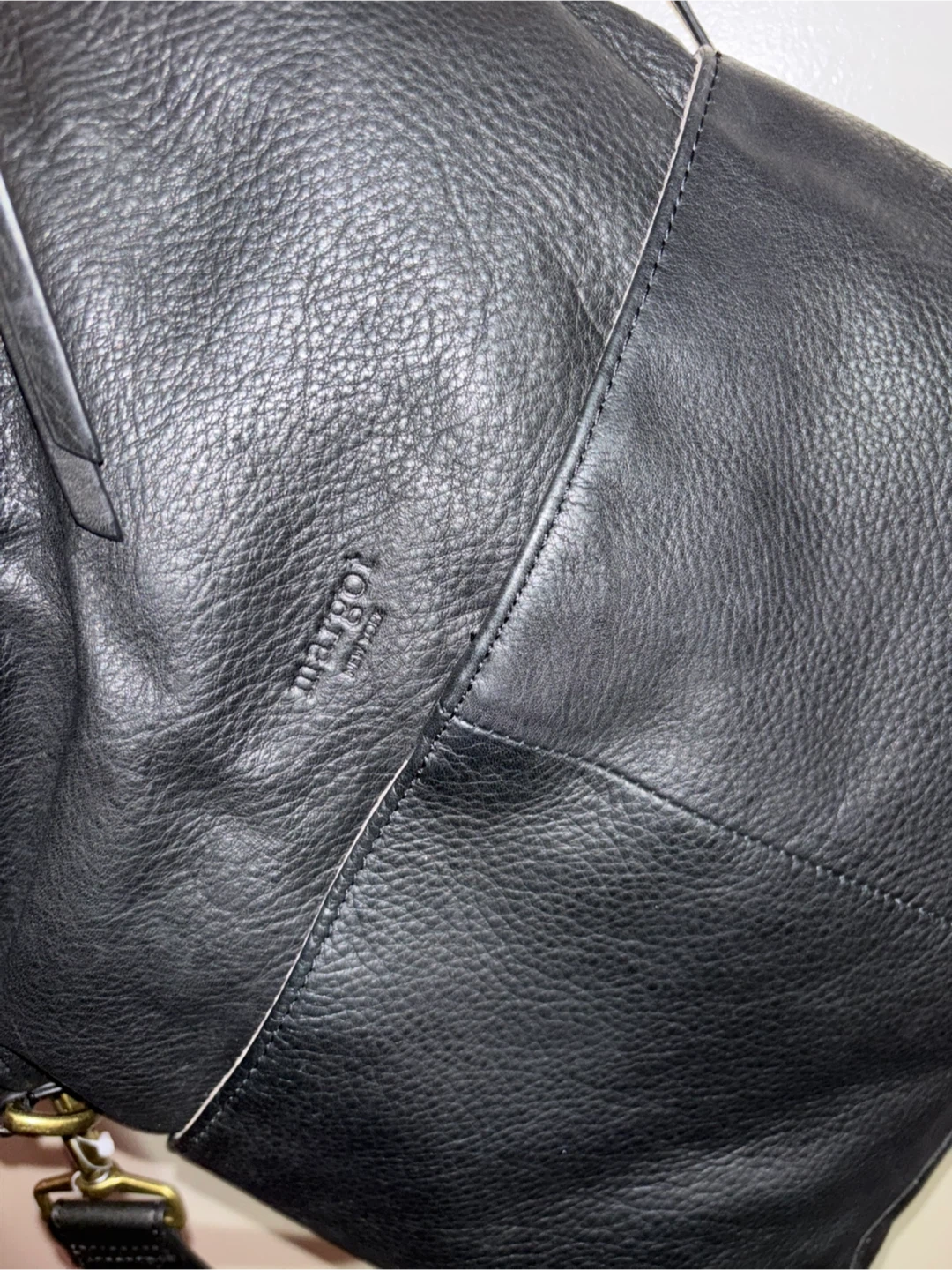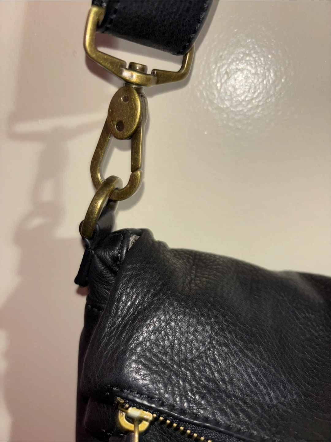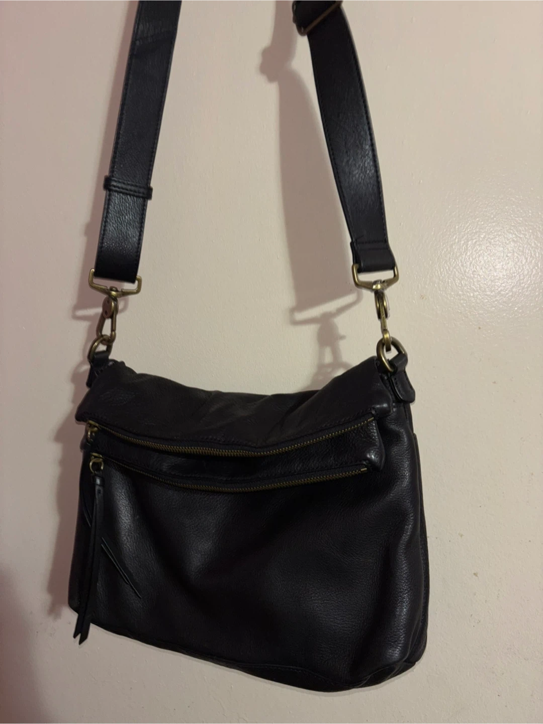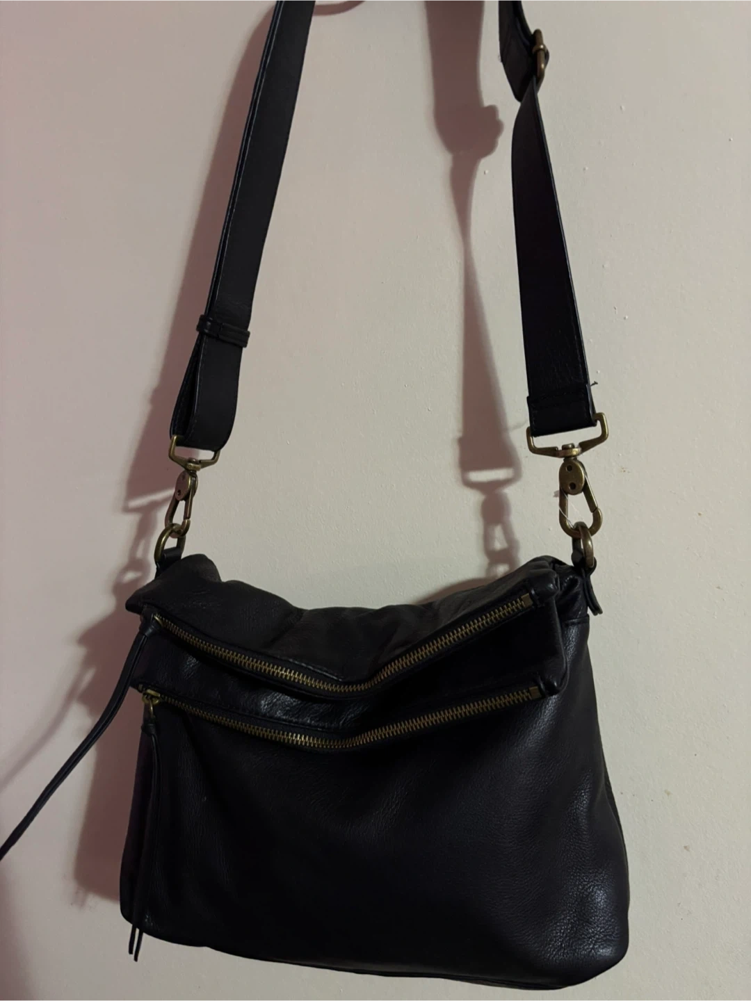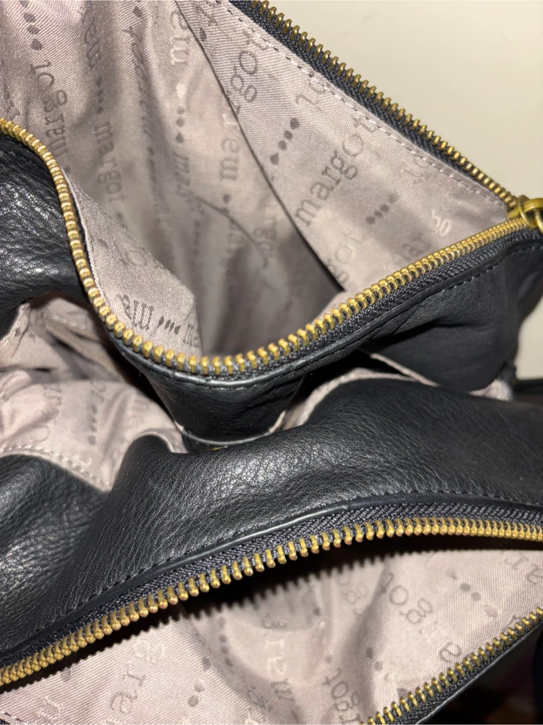 This Margot New York crossbody bag is made of black leather. It features multiple zippered compartments for organization. The adjustable strap allows for comfortable wear.