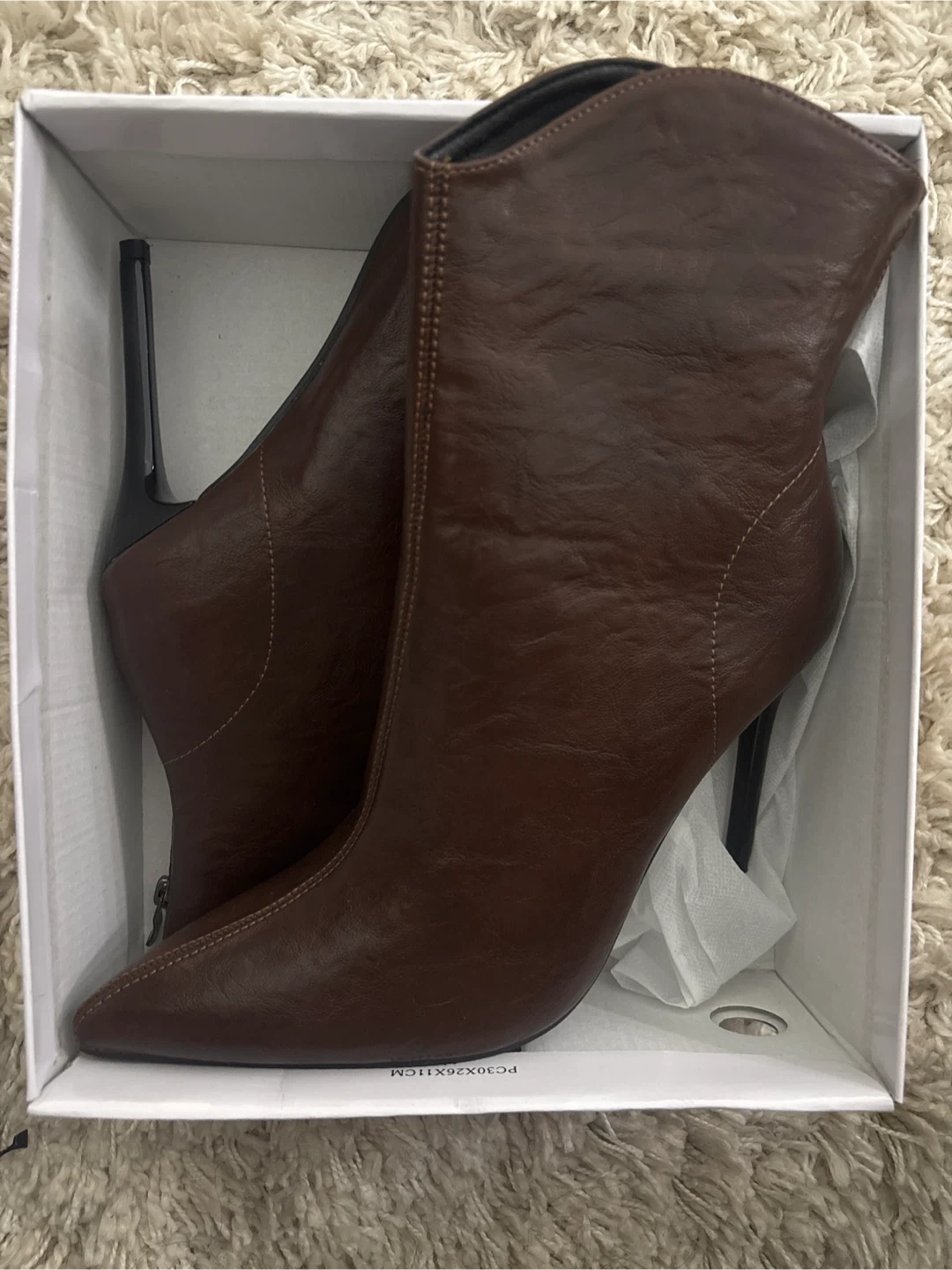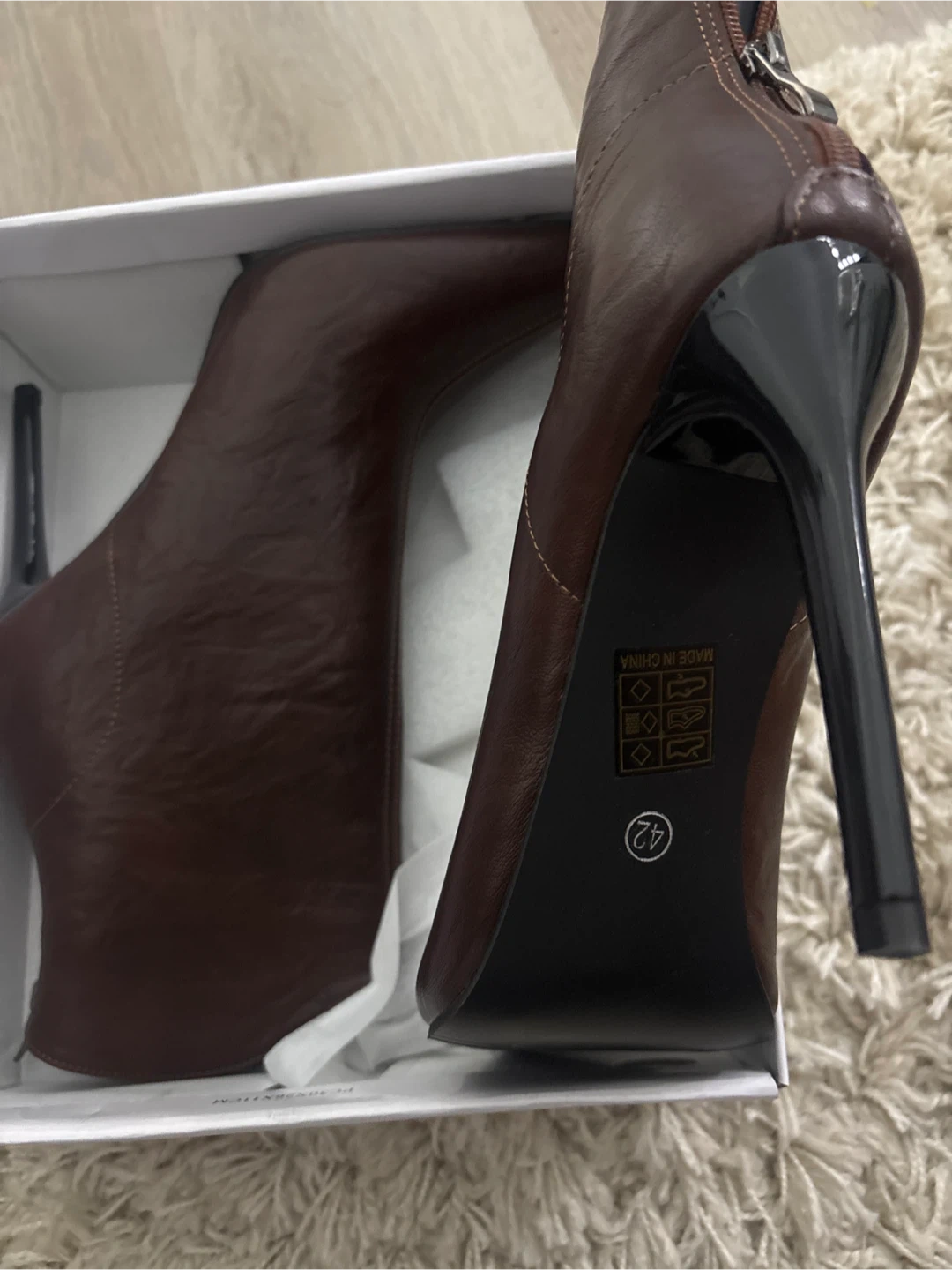 Brand new These brown leather ankle boots feature a pointed toe and a sleek stiletto heel. The size is marked as EUR 42. They come with their original box.
