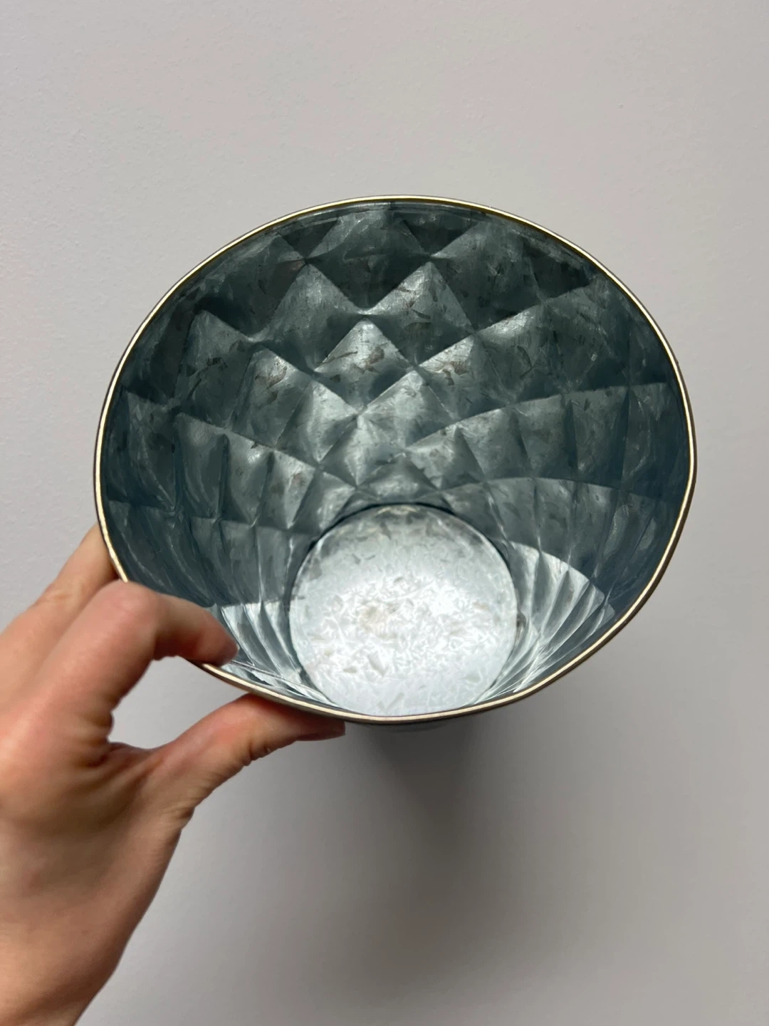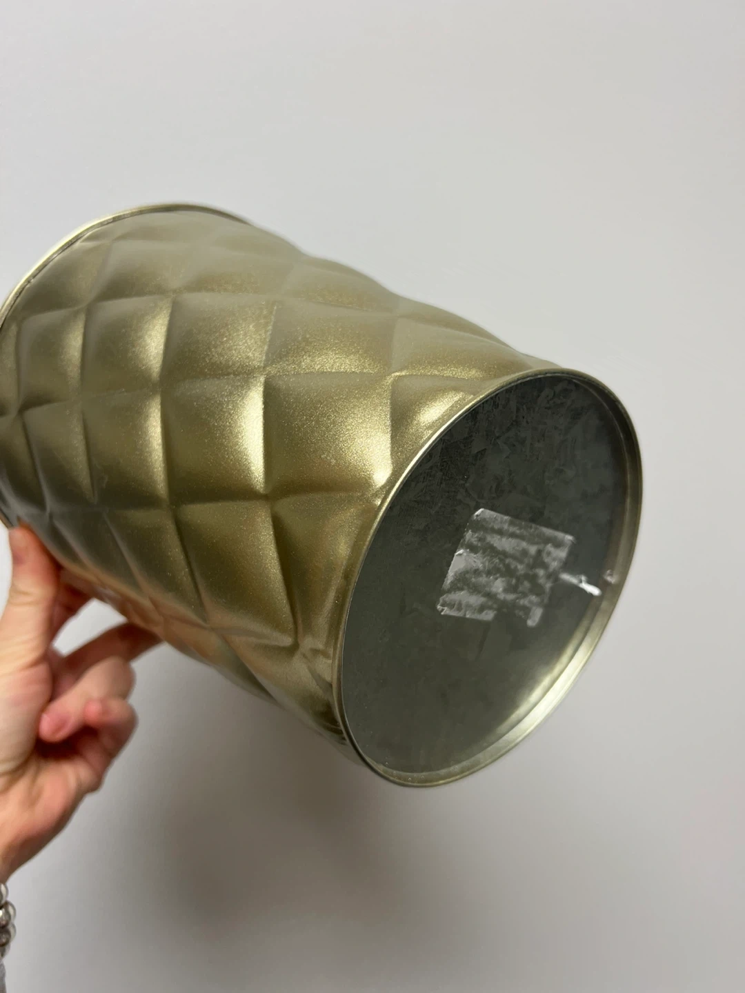 This gold metal waste bin features a diamond pattern design. It's a sturdy bin perfect for a home office or bedroom. Metal construction.