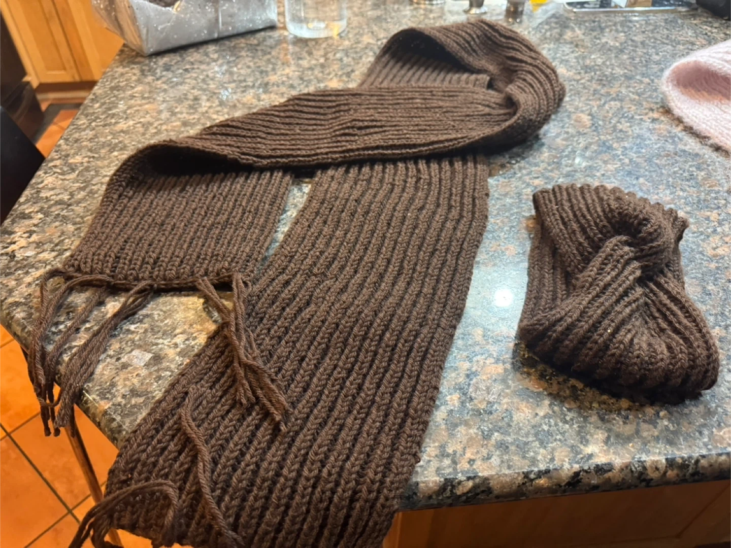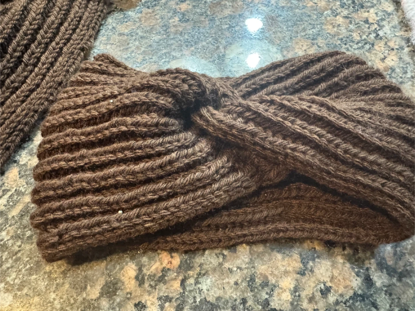 I'm selling a hand-knitted scarf and headband set in a lovely brown colour. The scarf has tassels at the ends, and the headband has a twisted design. Perfect for keeping cozy!