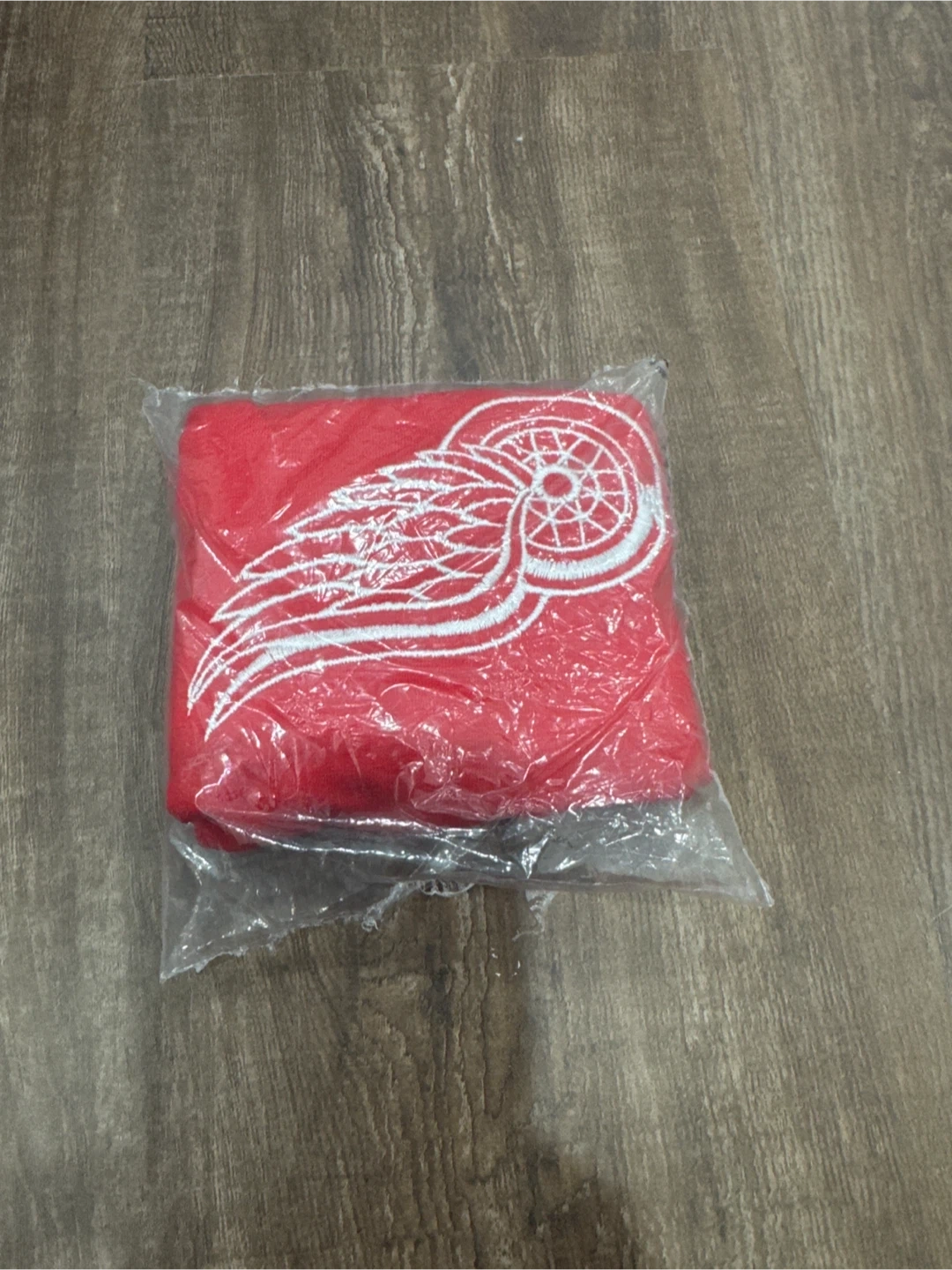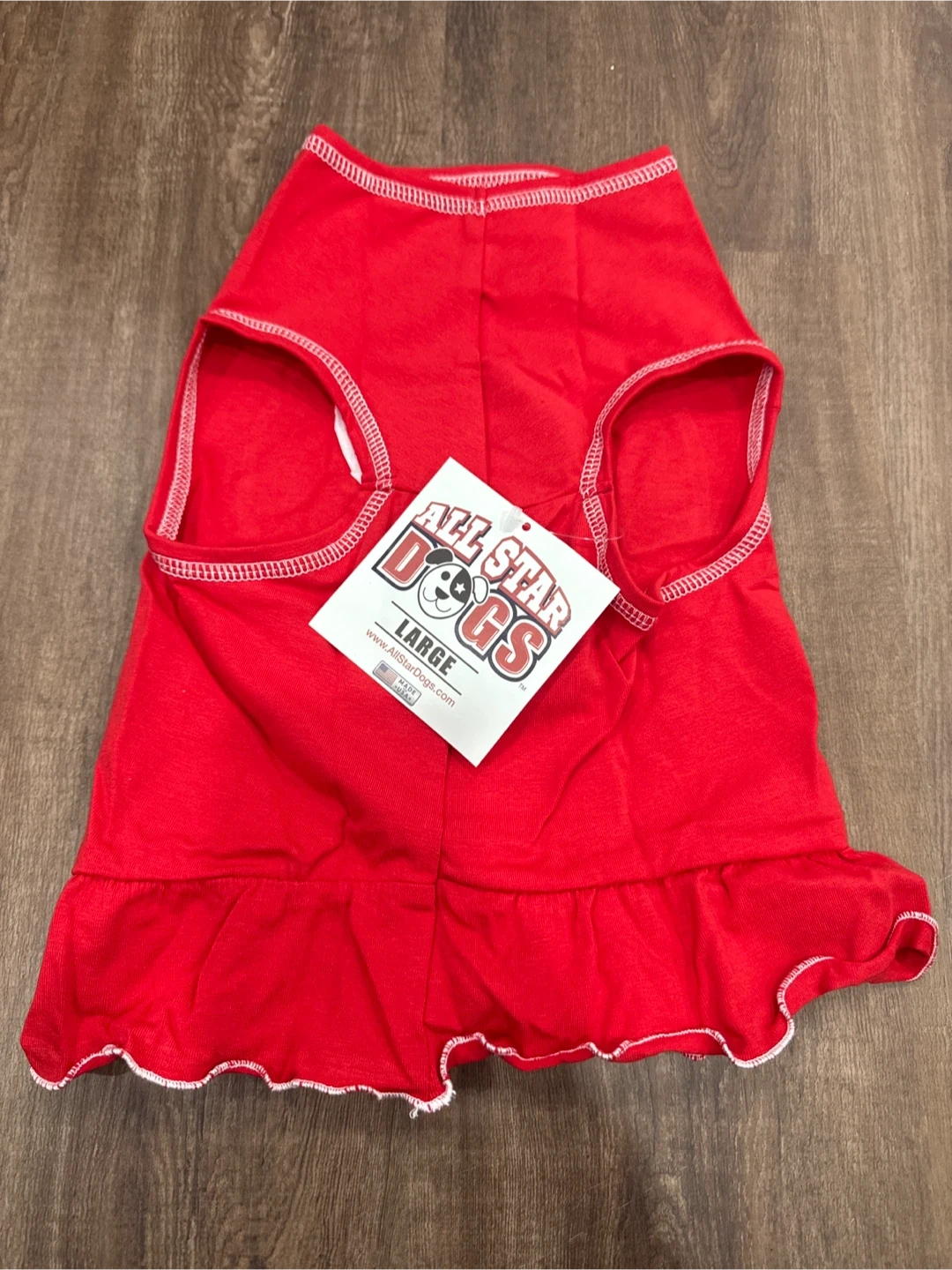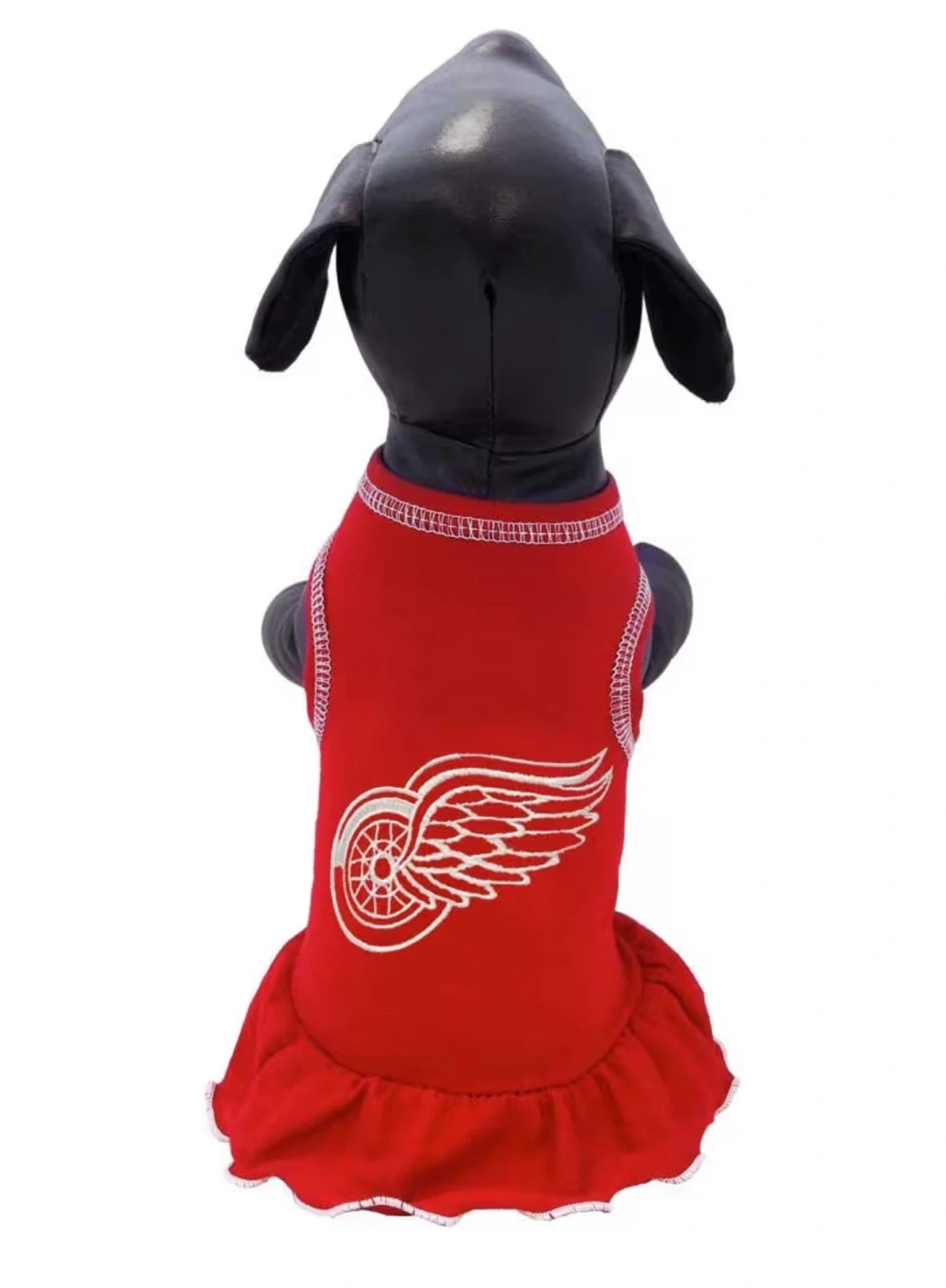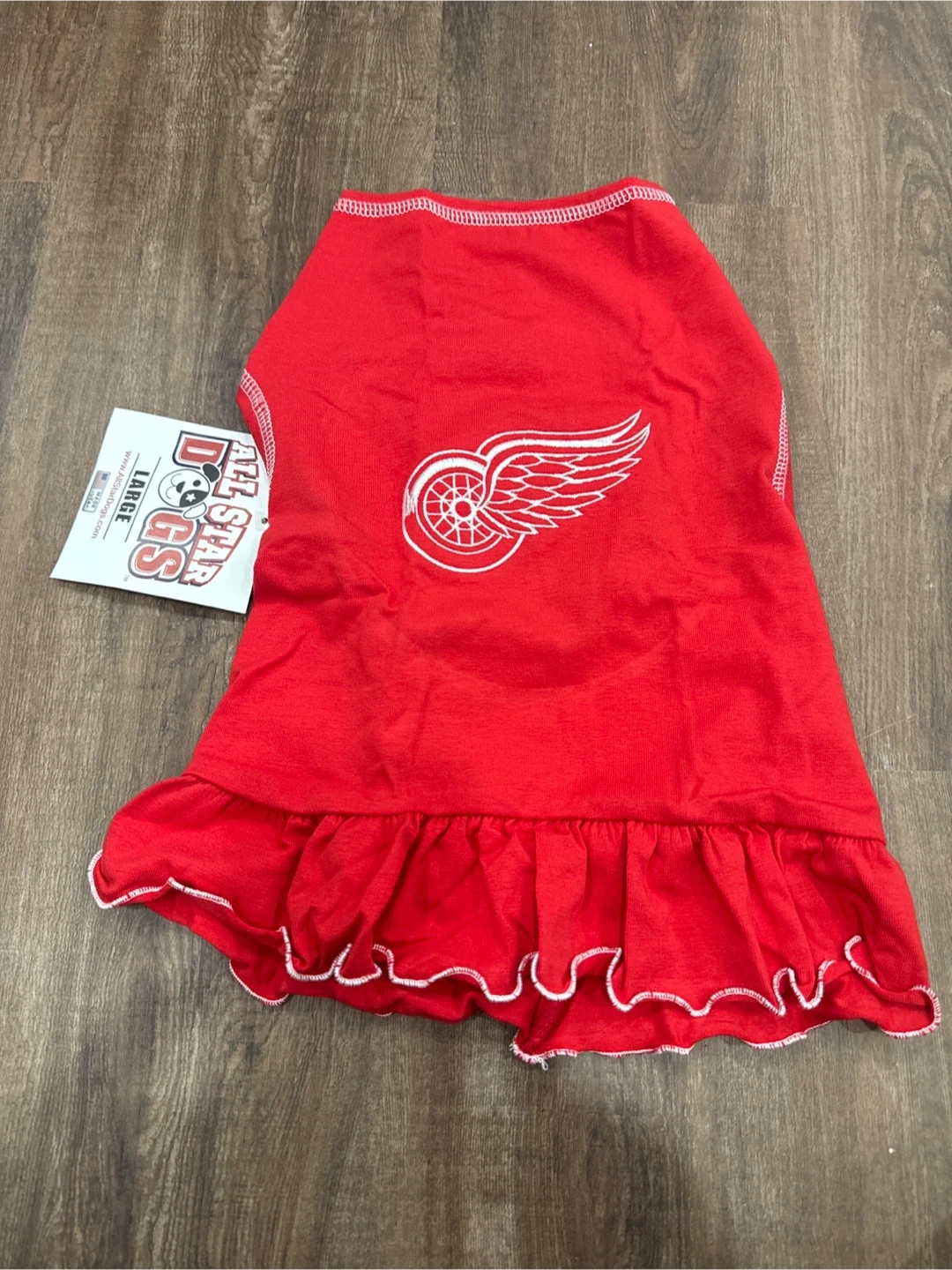 This is a red Detroit Red Wings dog dress. It features the team's logo embroidered on the back and a ruffled hem. The size is large.