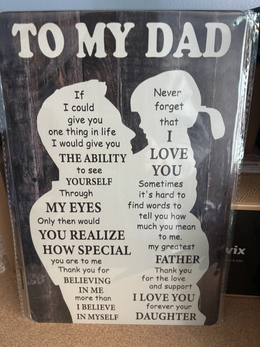 A heartfelt metal plaque with messages from a daughter to her father. It includes sweet sentiments about love and belief. This piece makes a thoughtful gift for Father's Day or any occasion.