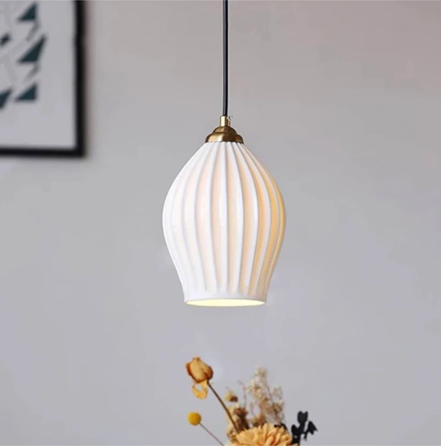 White ceramic pendant light with a fluted design. It uses an E14 5W*1 illuminant and is suitable for areas between 3-8m². It's great for kitchens, reading nook’s & bedrooms.