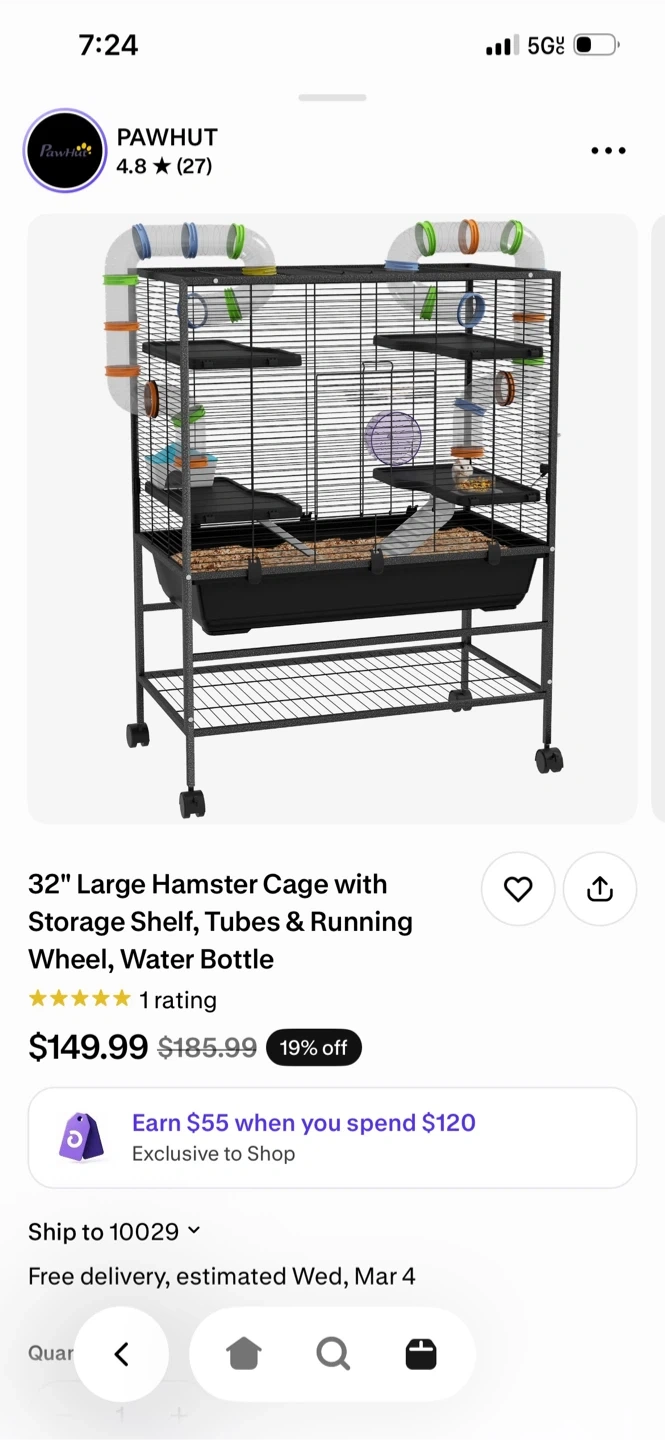 This is a 32" large hamster cage from PawHut. It's designed with multiple levels, storage shelves, and includes tubes and a running wheel. The cage also comes with a water bottle. It's suitable for hamsters. Cash and carry only.