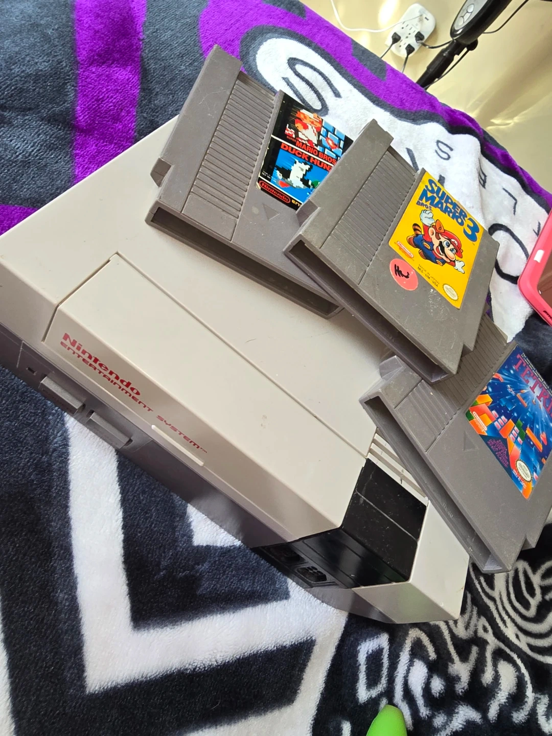 This is a Nintendo Entertainment System console, often called an NES. It includes Super Mario Bros. 3, Mario Bros. & Duck Hunt, and Tetris cartridges. No Cords or Controllers, shoot me offers.