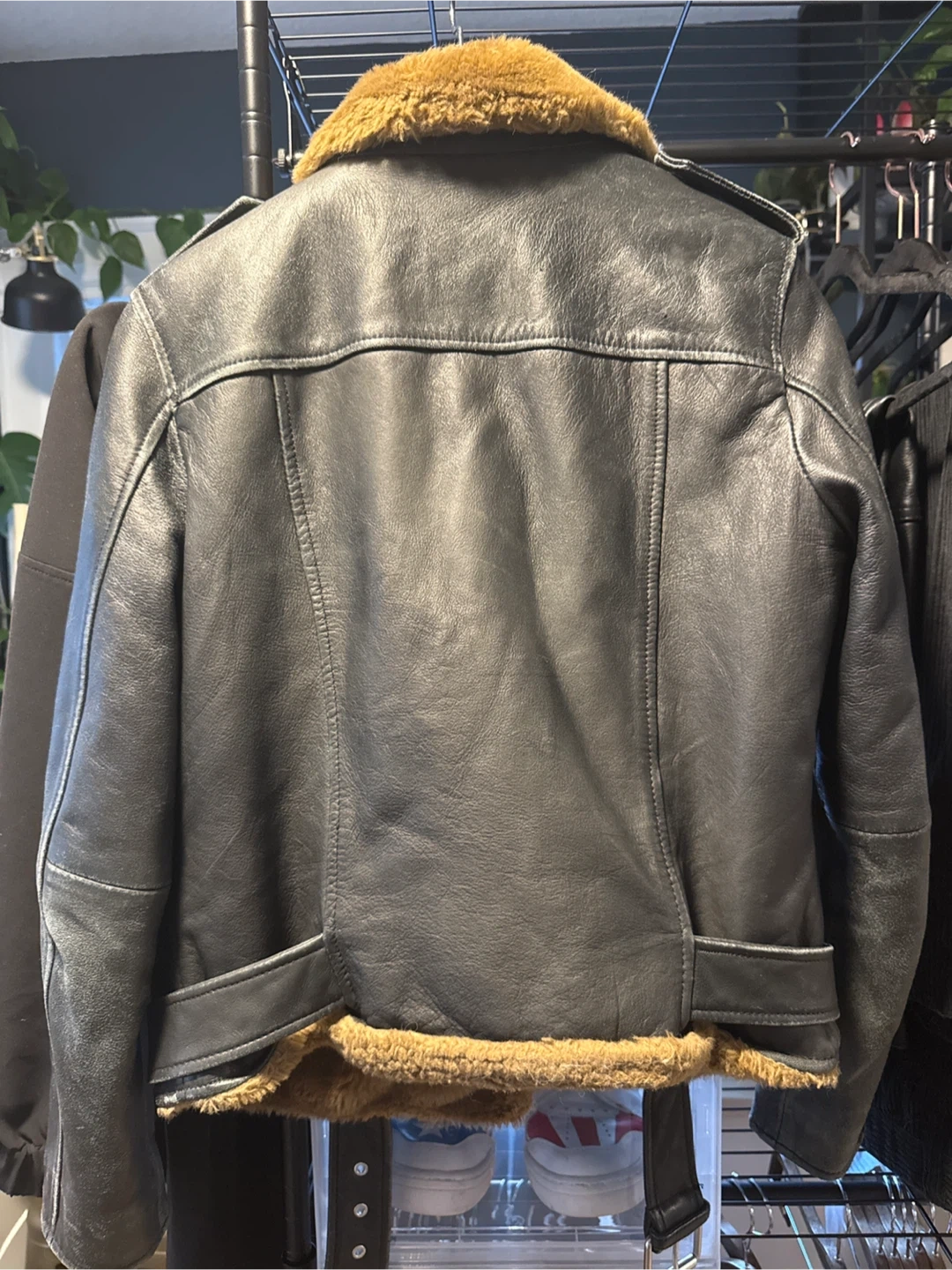 This is an AllSaints black leather biker jacket. It features a cozy faux fur lining and collar for extra warmth. The jacket includes multiple zippered pockets and a belt detail at the hem. It's perfect for staying stylish and warm during cooler weather!
