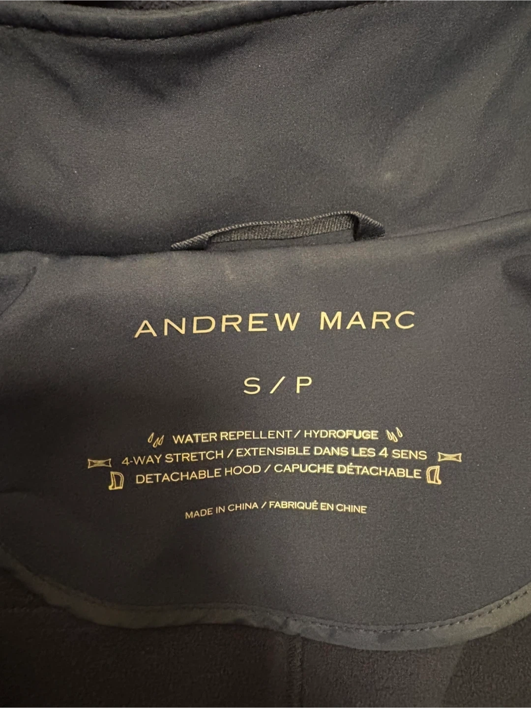 Andrew Marc hooded jacket in navy. It's water repellent and features 4-way stretch. The hood is detachable.