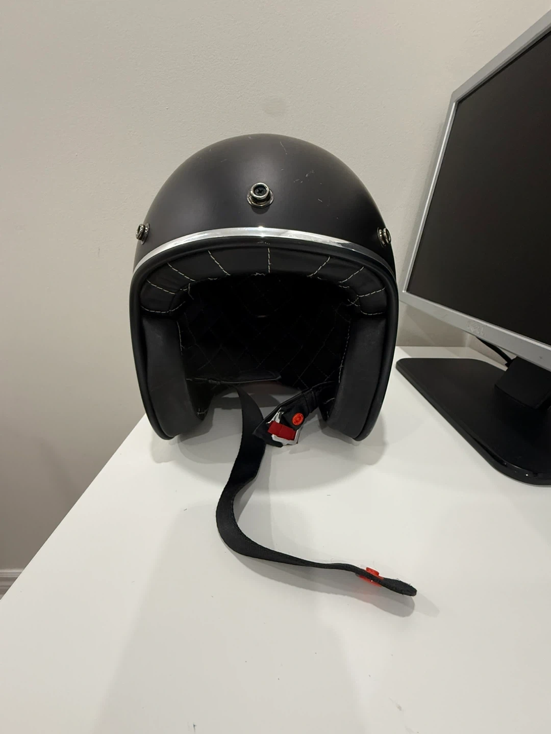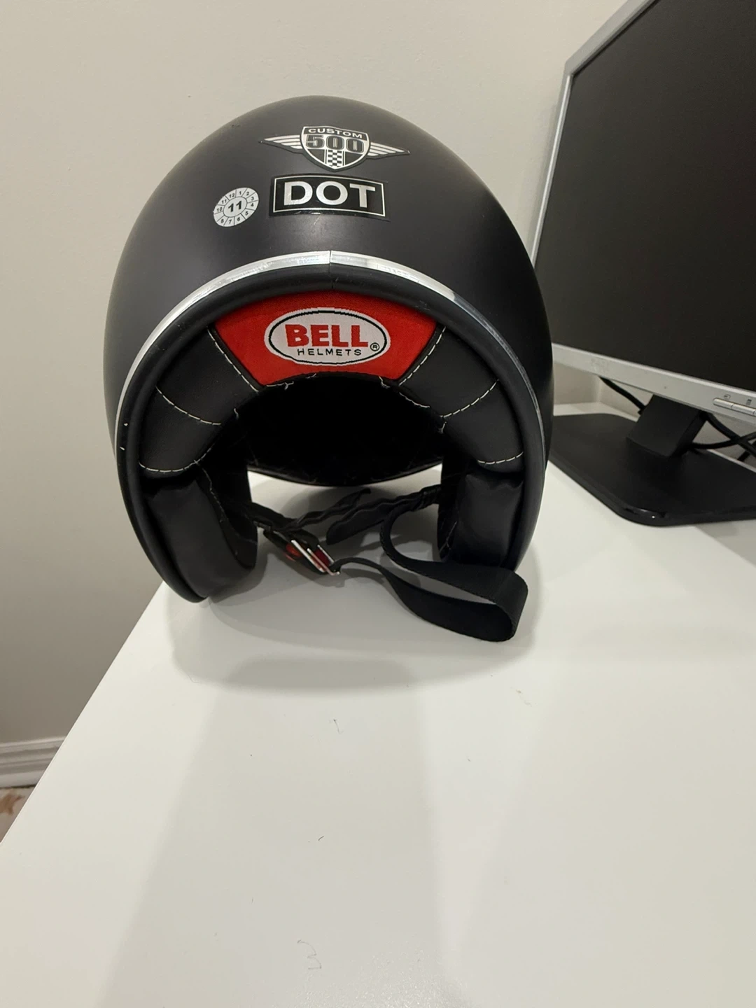 This is a matte black Bell Helmets Custom 500 motorcycle helmet. It's DOT approved and includes a red checkered helmet bag. This helmet's classic design is great for riders seeking both style and safety