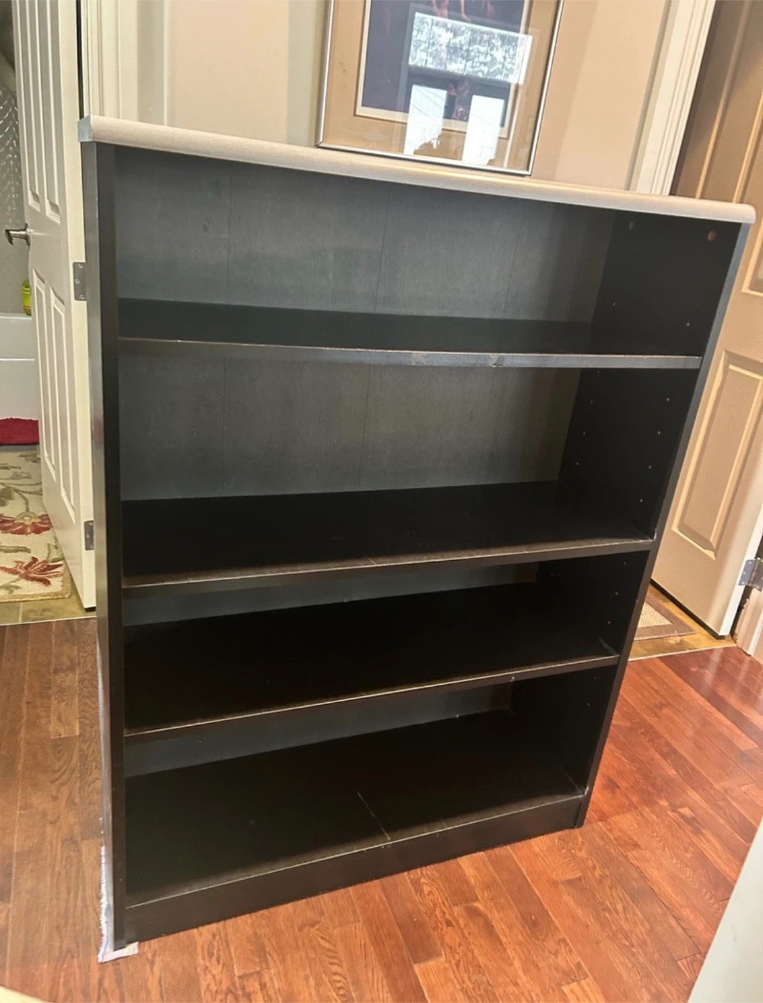 This dark brown bookcase has four open shelves for storage. It's a versatile piece for books or display items. The top has a lighter coloured trim. It's useful for organizing any room. Moving $40 or decent offer.