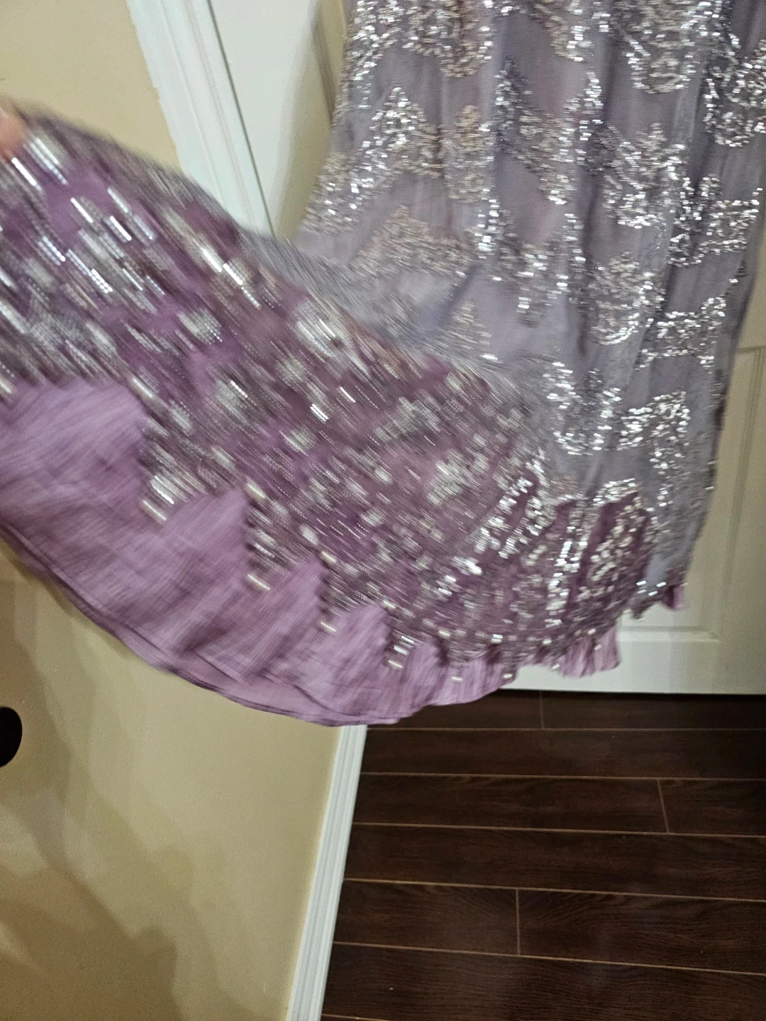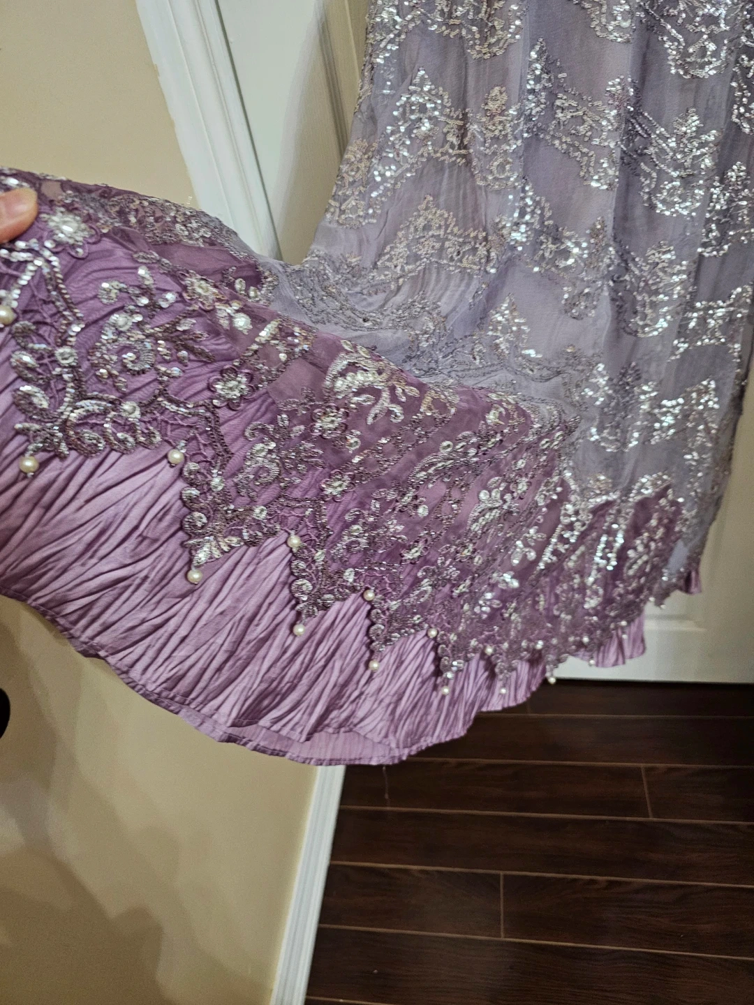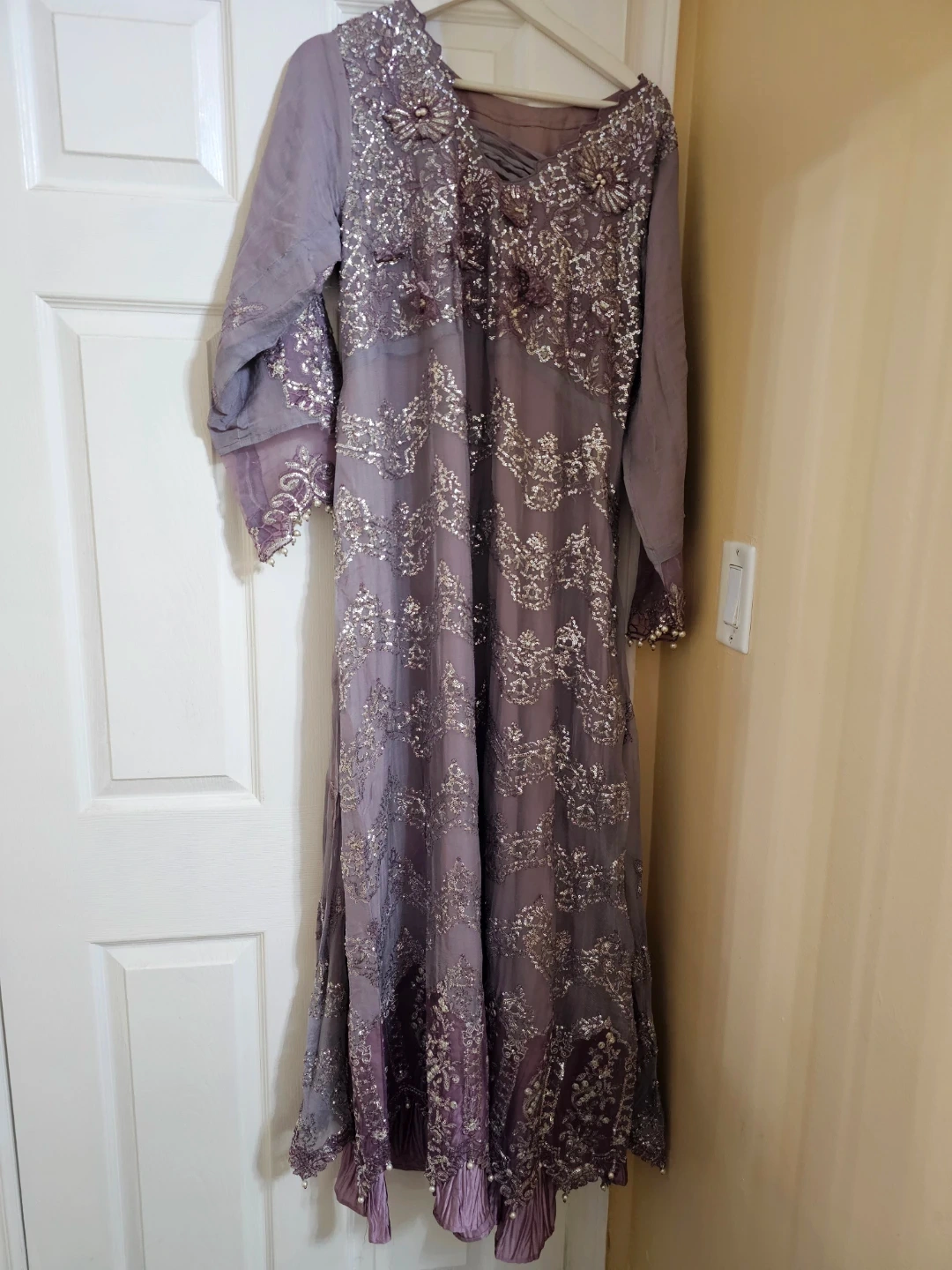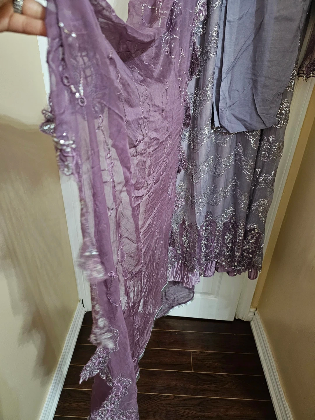 Beautiful purple kameez shalwar with intricate silver sequin and bead embellishments. It comes with a matching dupatta that has a sequined border. This outfit is perfect for special occasions and celebrations!