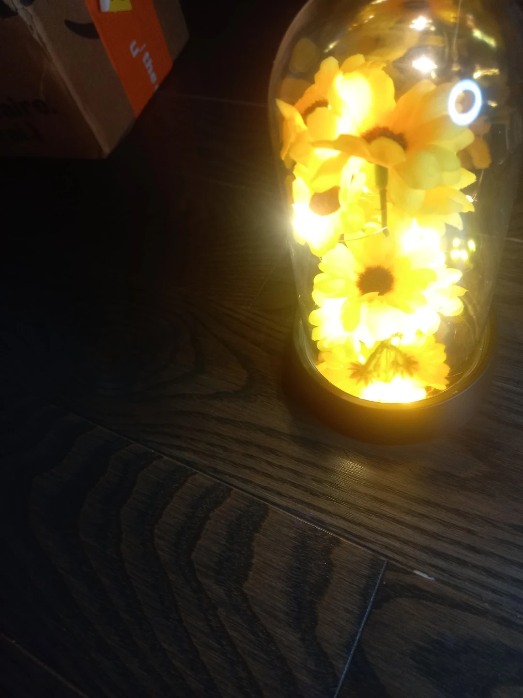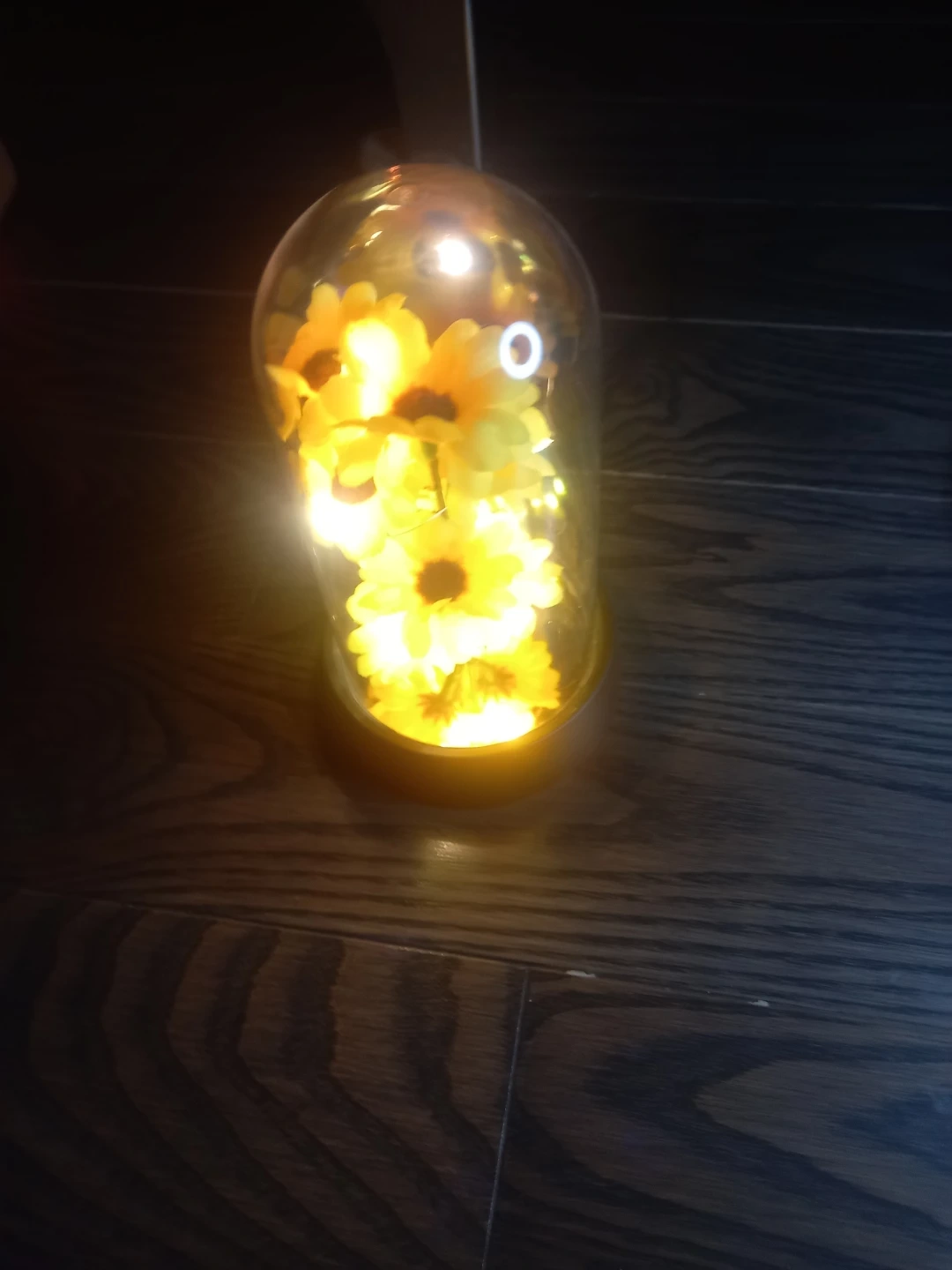 This charming decorative dome features faux sunflowers nestled amongst delicate LED string lights. It's designed to add a warm glow and a touch of nature to any space. The glass dome protects the arrangement while showcasing its beauty.