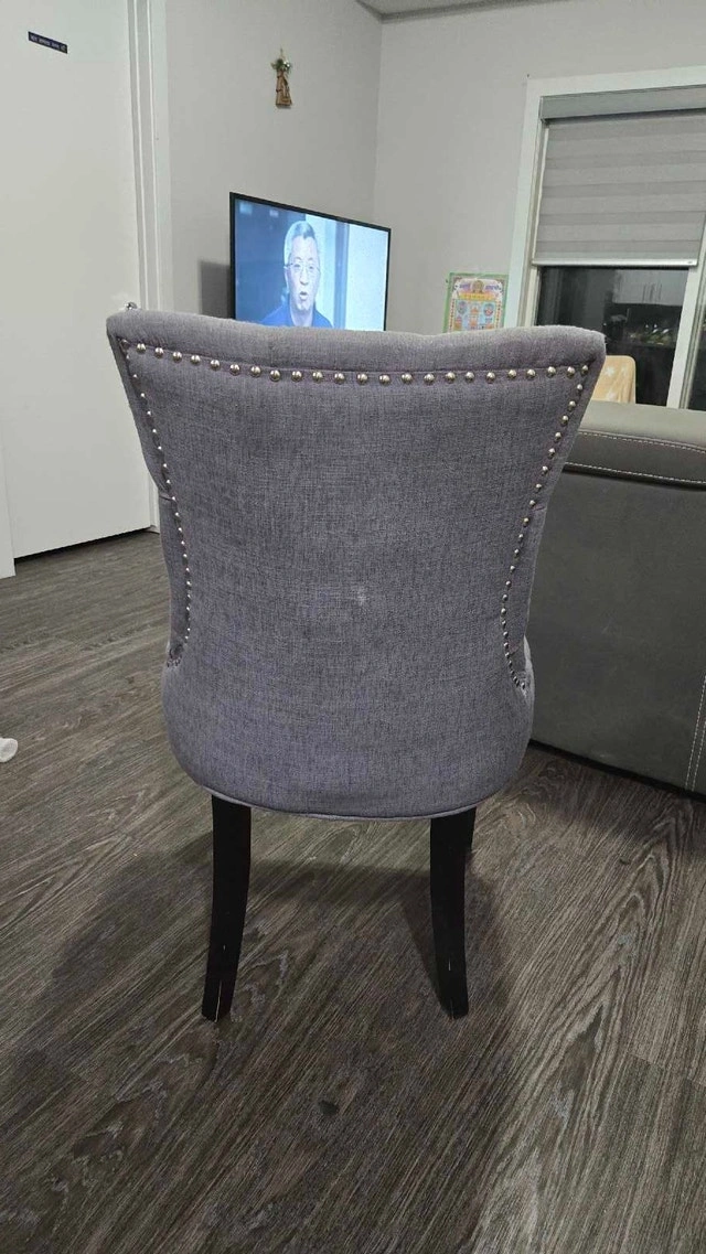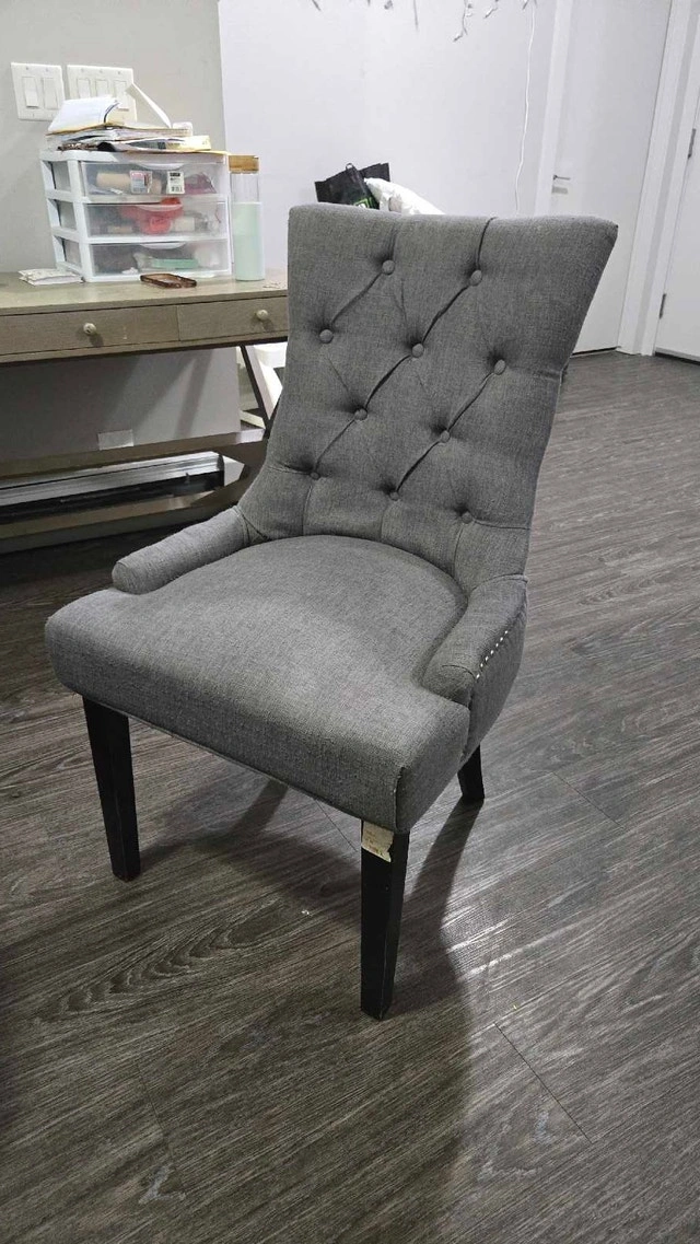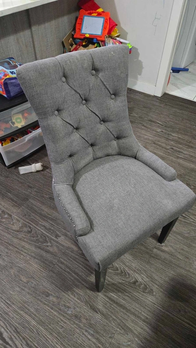Add a touch of elegance to any room with this stylish grey accent chair, featuring button-tufted detailing and studded trim. This chair is in used, good condition, and ready to enhance your home decor. Colour: Grey. Style: Traditional accent chair. Detail: Button-tufted, studded trim. Let me know if you're interested!
