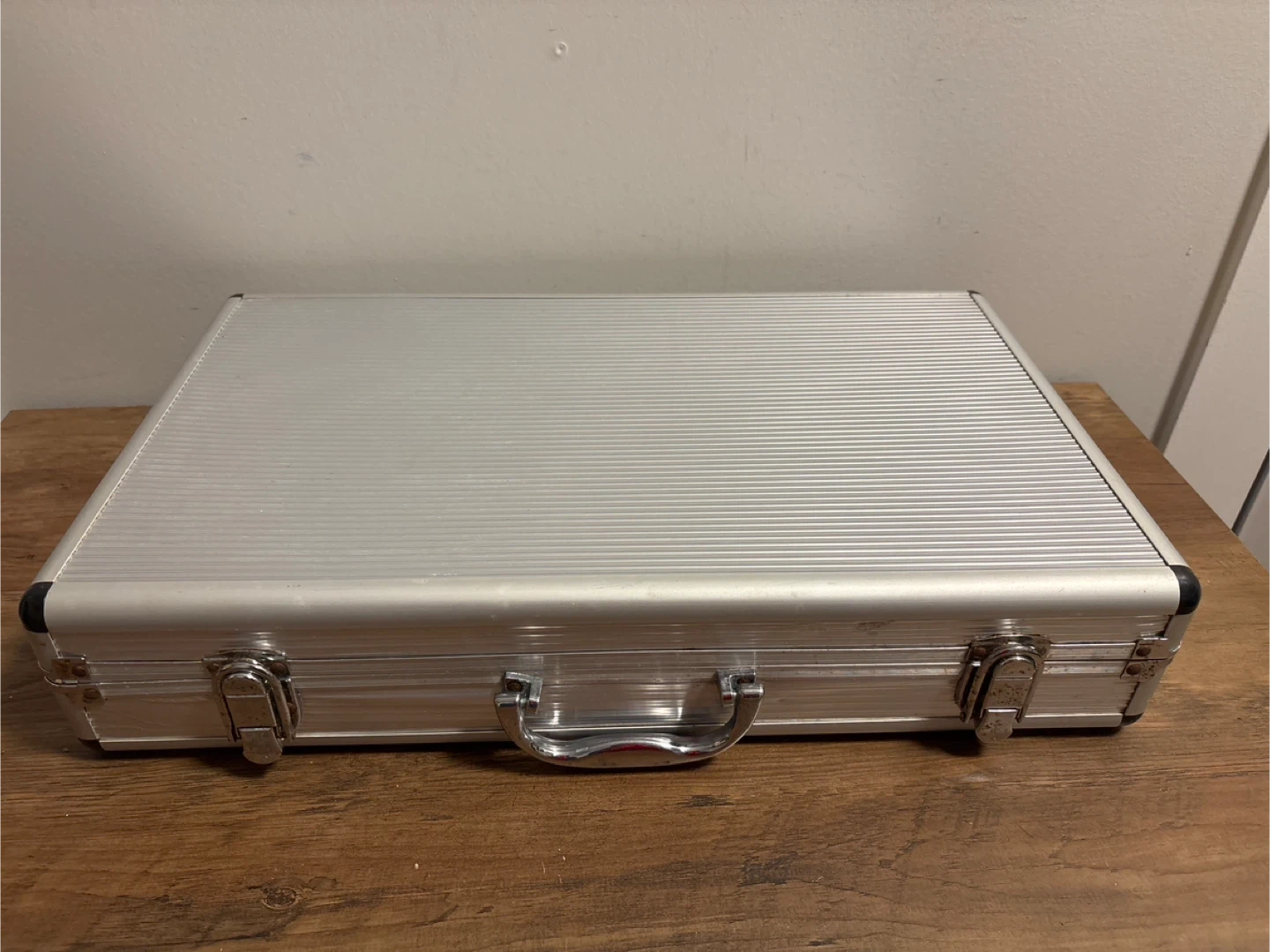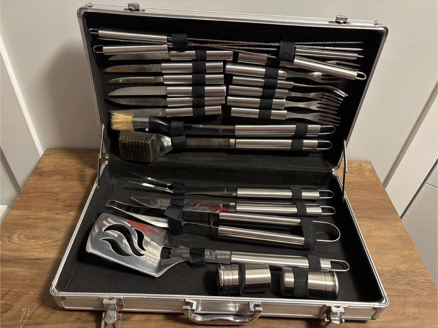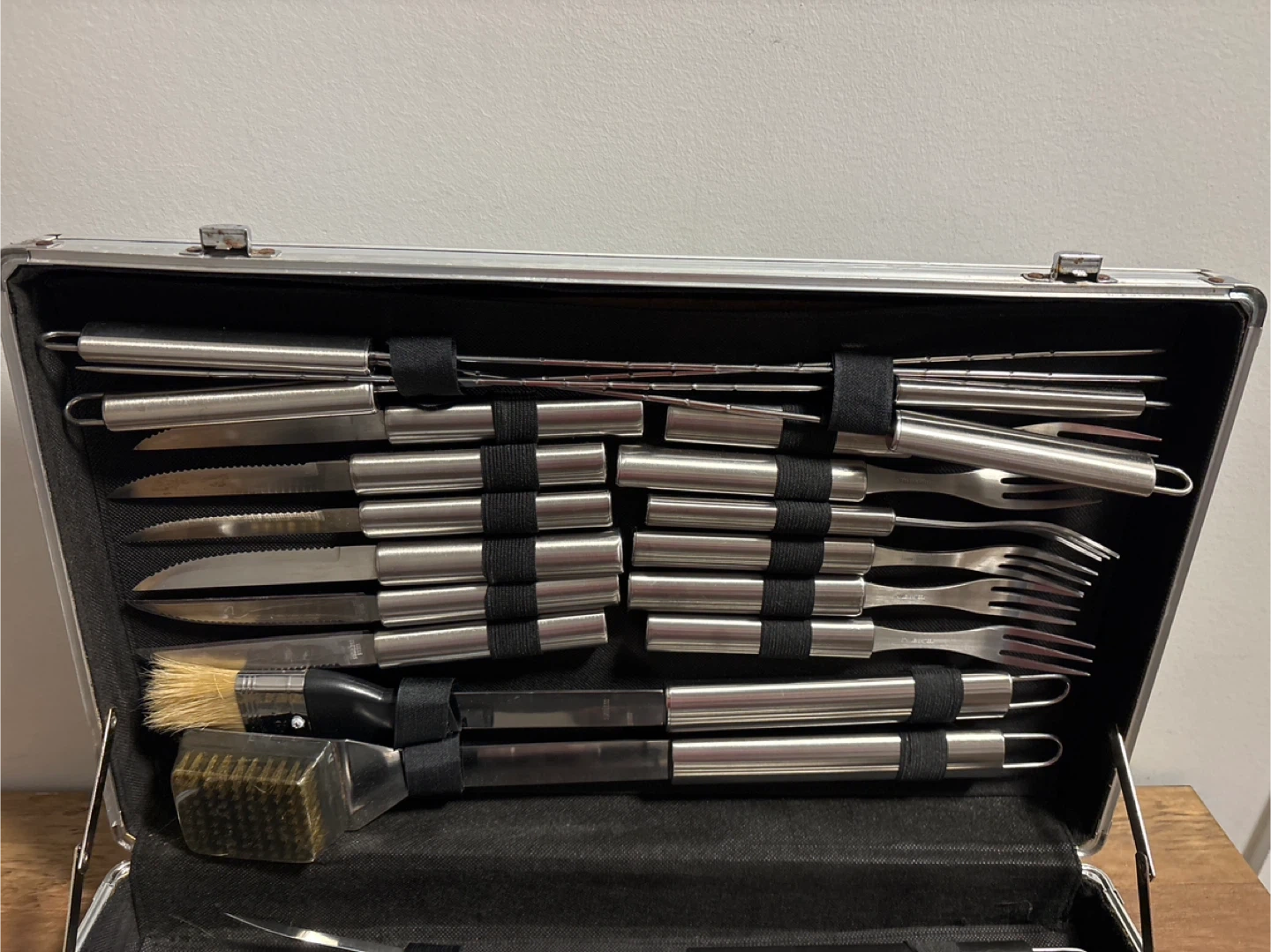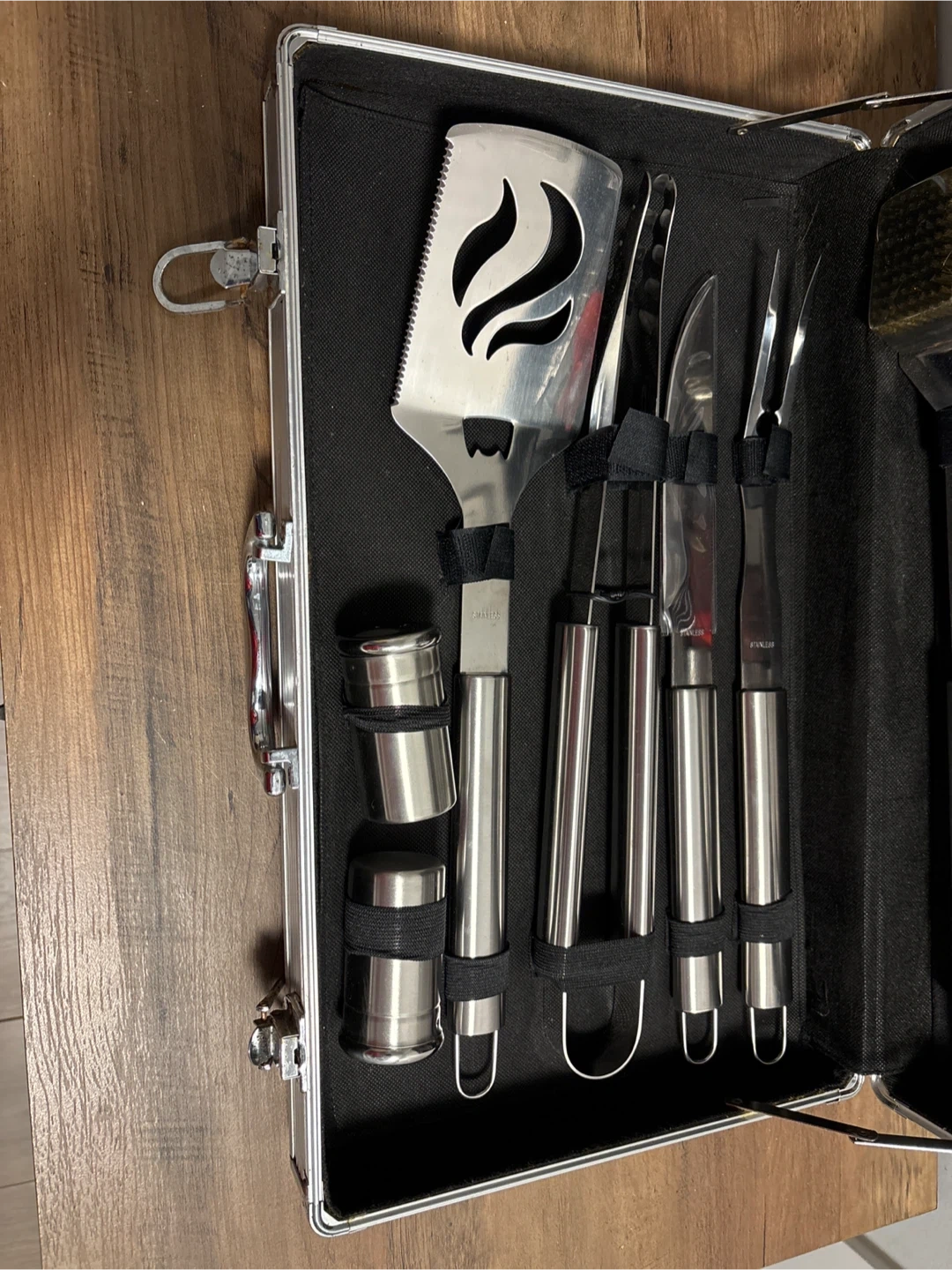 Complete BBQ grill tool set neatly organized in a durable aluminum case! Includes a variety of stainless steel tools such as spatulas, forks, knives, tongs, a basting brush, and even salt and pepper shakers. Perfect for grilling season and keeping everything tidy