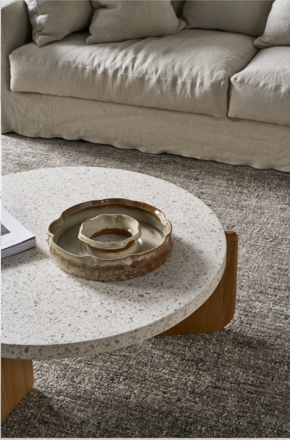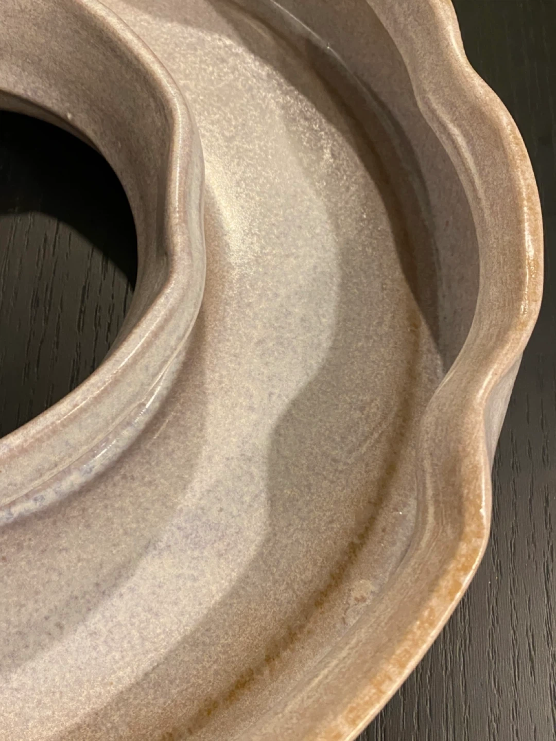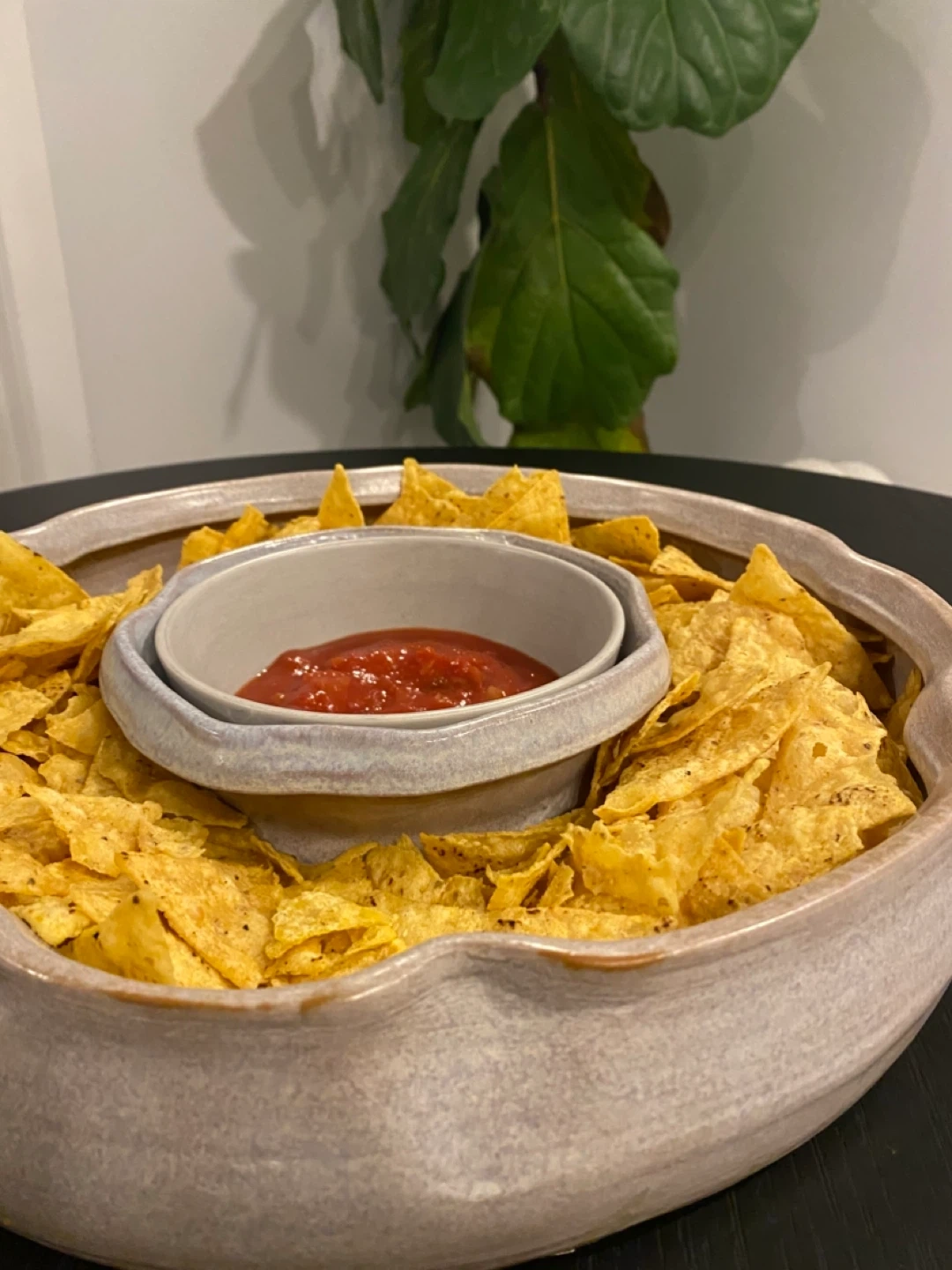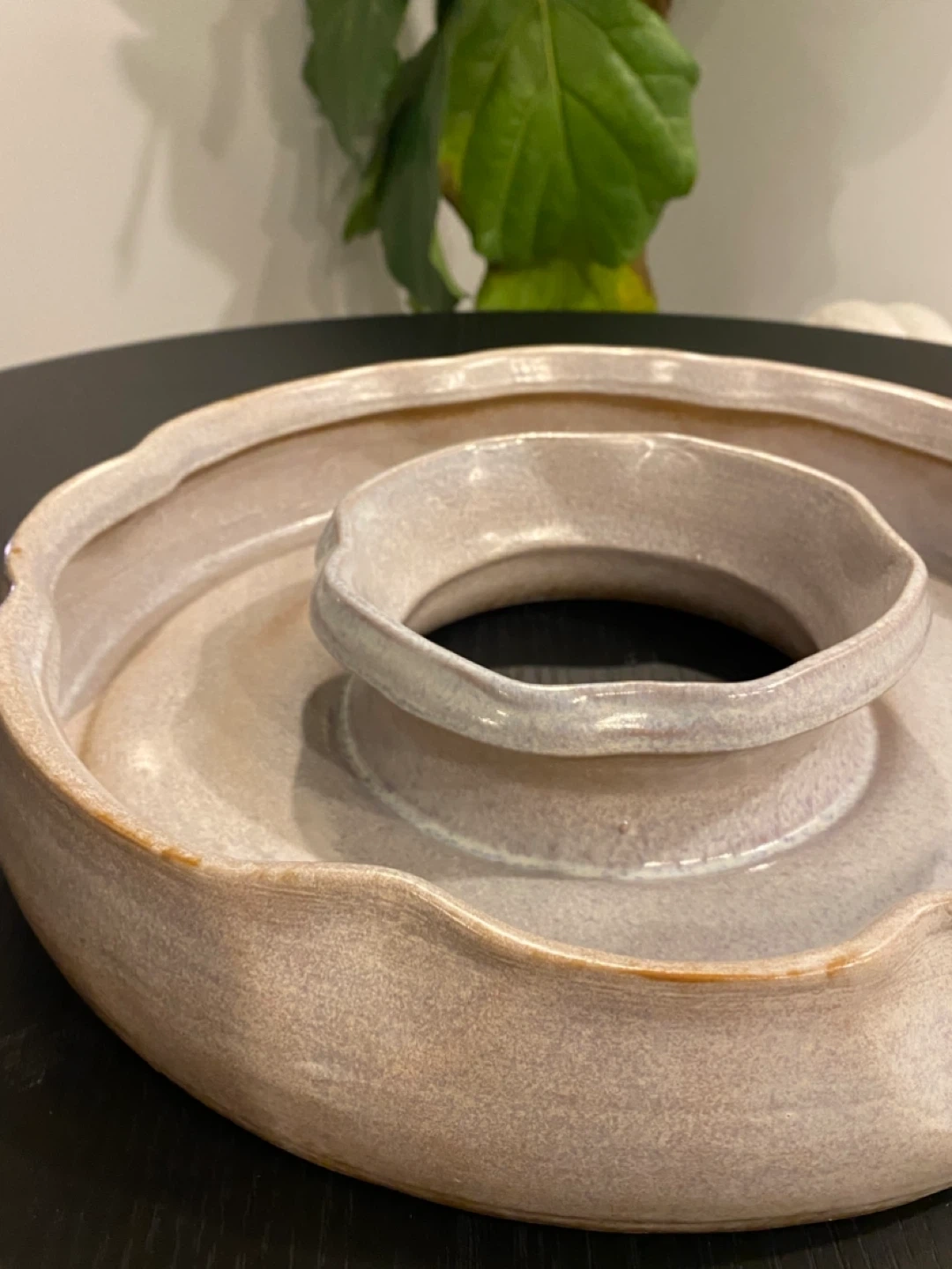 Large (very heavy) stoneware tray with a gorgeous irregular shape and unique glaze. Perfect for chips and dip or display on a table. Fits a bowl inside Center for dips (see last photo). Used twice. Perfect condition!