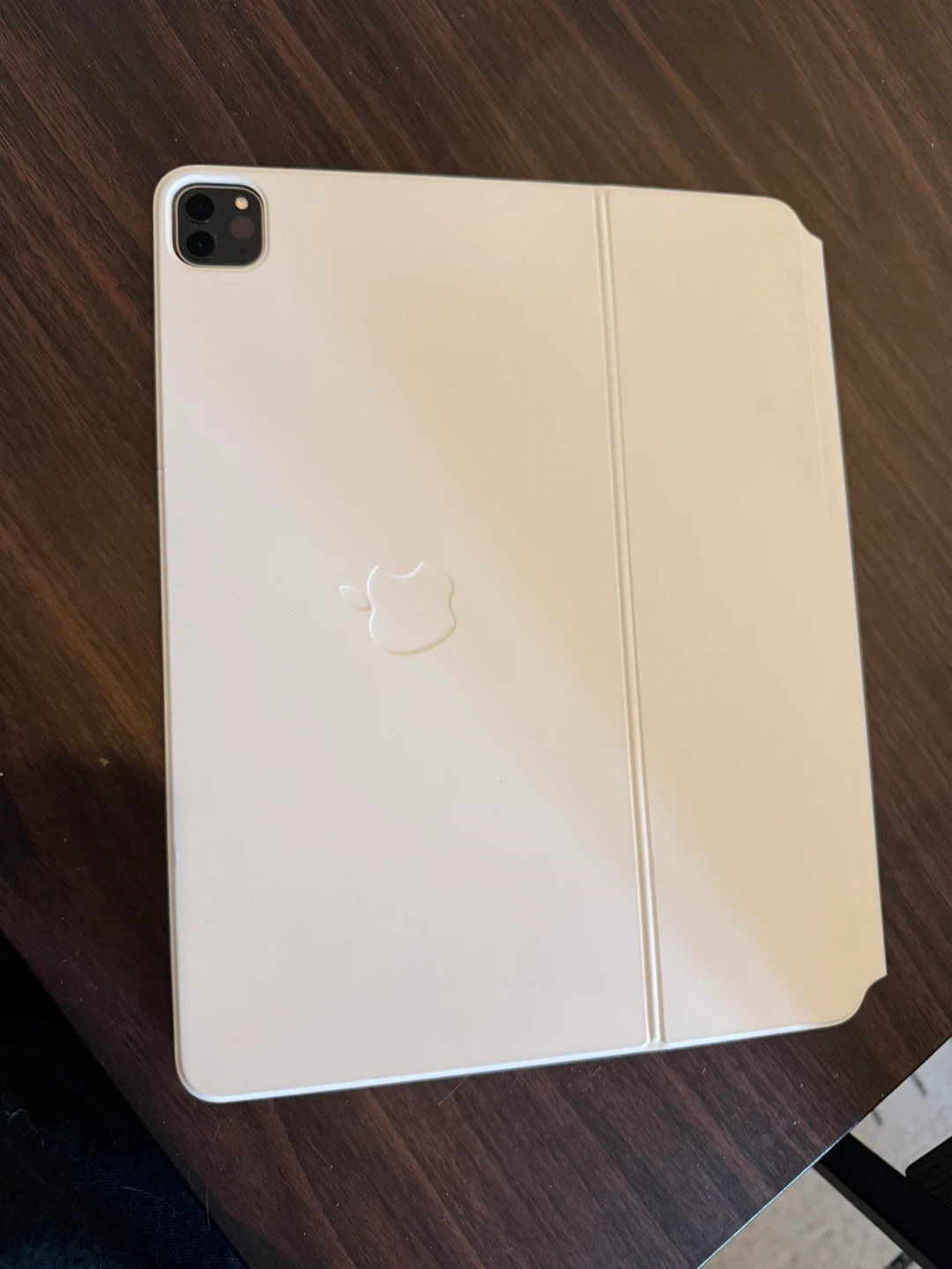 This is an Apple Magic Keyboard designed for iPad Pro. It features a trackpad and a full-size keyboard with backlit keys. The keyboard's case is white and offers a protective cover for your iPad.